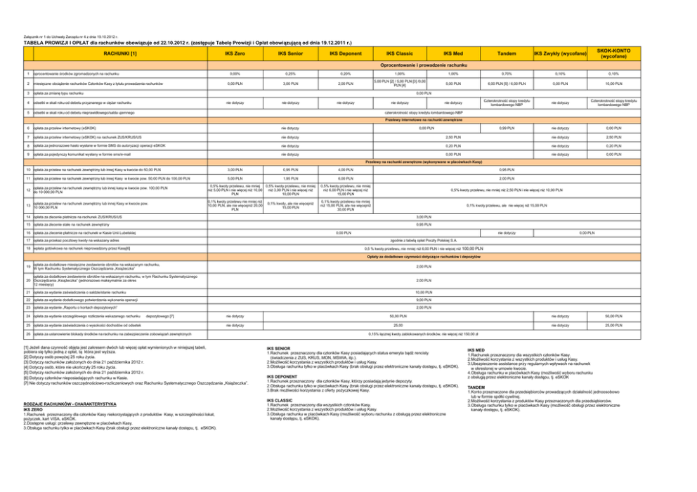 Załącznik nr 1 do Uchwały Zarządu nr 4 z dnia 19.10.2012 r. TABELA PROWIZJI I OPŁAT dla rachunków obowiązuje od 22.10.2012 r. (zastępuje Tabelę Prowizji i Opłat obowiązującą od dnia 19.12.2011 r.) RACHUNKI [1] IKS Classic IKS Med Tandem SKOK-KONTO (wycofane) IKS Zero IKS Senior IKS Deponent IKS Zwykły (wycofane) 0,00% 0,25% 0,20% 1,00% 1,00% 0,70% 0,10% 0,10% 0,00 PLN 3,00 PLN 2,00 PLN 5,00 PLN [2] / 5,00 PLN [3] /0,00 PLN [4] 5,00 PLN 6,00 PLN [5] / 6,00 PLN 0,00 PLN 10,00 PLN nie dotyczy nie dotyczy nie dotyczy nie dotyczy nie dotyczy Czterokrotność stopy kredytu lombardowego NBP nie dotyczy Czterokrotność stopy kredytu lombardowego NBP 0,99 PLN Oprocentowanie i prowadzenie rachunku 1 oprocentowanie środków zgromadzonych na rachunku 2 miesięczne obciążenie rachunków Członków Kasy z tytułu prowadzenia rachunków 3 opłata za zmianę typu rachunku 4 odsetki w skali roku od debetu przyznanego w ciężar rachunku 0,00 PLN 5 odsetki w skali roku od debetu nieprawidłowego/salda ujemnego 6 opłata za przelew internetowy (eSKOK) nie dotyczy nie dotyczy 0,00 PLN 7 opłata za przelew internetowy (eSKOK) na rachunek ZUS/KRUS/US nie dotyczy 2,50 PLN nie dotyczy 2,50 PLN 8 opłata za jednorazowe hasło wysłane w formie SMS do autoryzacji operacji eSKOK nie dotyczy 0,20 PLN nie dotyczy 0,20 PLN 9 opłata za pojedynczy komunikat wysłany w formie sms/e-mail nie dotyczy 0,00 PLN nie dotyczy 0,00 PLN czterokrotność stopy kredytu lombardowego NBP Przelewy internetowe na rachunki zewnętrzne 0,00 PLN Przelewy na rachunki zewnętrzne (wykonywane w placówkach Kasy) 10 opłata za przelew na rachunek zewnętrzny lub innej Kasy w kwocie do 50,00 PLN 3,00 PLN 0,95 PLN 4,00 PLN 0,95 PLN 11 opłata za przelew na rachunek zewnętrzny lub innej Kasy w kwocie pow. 50,00 PLN do 100,00 PLN 5,00 PLN 1,95 PLN 6,00 PLN 2,00 PLN 12 opłata za przelew na rachunek zewnętrzny lub innej kasy w kwocie pow. 100,00 PLN do 10 000,00 PLN 0,5% kwoty przelewu, nie mniej 0,5% kwoty przelewu, nie mniej niż 5,00 PLN i nie więcej niż 10,00 niż 3,00 PLN i nie więcej niż PLN 10,00 PLN 0,5% kwoty przelewu, nie mniej niż 6,00 PLN i nie więcej niż 15,00 PLN 0,5% kwoty przelewu, nie mniej niż 2,50 PLN i nie więcej niż 10,00 PLN 13 opłata za przelew na rachunek zewnętrzny lub innej Kasy w kwocie pow. 10 000,00 PLN 0,1% kwoty przelewu nie mniej niż 10,00 PLN, ale nie więcejniż 20,00 PLN 0,1% kwoty przelewu nie mniej niż 15,00 PLN, ale nie więcejniż 30,00 PLN 0,1% kwoty przelewu, ale nie więcej niż 15,00 PLN 0,1% kwoty, ale nie więcejniż 15,00 PLN 14 opłata za zlecenie płatnicze na rachunek ZUS/KRUS/US 3,00 PLN 15 opłata za zlecenie stałe na rachunek zewnętrzny 0,95 PLN 16 opłata za zlecenie płatnicze na rachunek w Kasie Unii Lubelskiej 0,00 PLN 17 opłata za przekaz pocztowy kwoty na wskazany adres nie dotyczy 0,00 PLN zgodnie z tabelą opłat Poczty Polskiej S.A. 0,5 % kwoty przelewu, nie mniej niż 6,00 PLN i nie więcej niż 100,00 PLN 18 wpłata gotówkowa na rachunek nieprowadzony przez Kasę[6] Opłaty za dodatkowe czynności dotyczące rachunków i depozytów 19 opłata za dodatkowe miesięczne zestawienie obrotów na wskazanym rachunku, W tym Rachunku Systematycznego Oszczędzania „Książeczka” 2,00 PLN opłata za dodatkowe zestawienie obrotów na wskazanym rachunku, w tym Rachunku Systematycznego 20 Oszczędzania „Książeczka” (jednorazowo maksymalnie za okres 12 miesięcy) 2,00 PLN 21 opłata za wydanie zaświadczenia o saldzie/stanie rachunku 10,00 PLN 22 opłata za wydanie dodatkowego potwierdzenia wykonania operacji 9,00 PLN 23 opłata za wydanie „Raportu o kontach depozytowych” 24 opłata za wydanie szczegółowego rozliczenia wskazanego rachunku 2,00 PLN depozytowego [7] 25 opłata za wydanie zaświadczenia o wysokości dochodów od odsetek nie dotyczy 50,00 PLN nie dotyczy 50,00 PLN nie dotyczy 25,00 nie dotyczy 25,00 PLN 26 opłata za ustanowienie blokady środków na rachunku na zabezpieczenie zobowiązań zewnętrznych [1] Jeżeli dana czynność objęta jest zakresem dwóch lub więcej opłat wymienionych w niniejszej tabeli, pobiera się tylko jedną z opłat, tą która jest wyższa. [2] Dotyczy osób powyżej 25 roku życia. [3] Dotyczy rachunków założonych do dnia 21 października 2012 r. [4] Dotyczy osób, które nie ukończyły 25 roku życia. [5] Dotyczy rachunków założonych do dnia 21 października 2012 r. [6] Dotyczy członków nieposiadających rachunku w Kasie. [7] Nie dotyczy rachunków oszczędnościowo-rozliczeniowych oraz Rachunku Systematycznego Oszczędzania „Książeczka”. RODZAJE RACHUNKÓW - CHARAKTERYSTYKA IKS ZERO 1.Rachunek przeznaczony dla członków Kasy niekorzystających z produktów Kasy, w szczególności lokat, pożyczek, kart VISA, eSKOK. 2.Dostępne usługi: przelewy zewnętrzne w placówkach Kasy. 3.Obsługa rachunku tylko w placówkach Kasy (brak obsługi przez elektroniczne kanały dostępu, tj. eSKOK). 0,15% łącznej kwoty zablokowanych środków, nie więcej niż 150,00 zł IKS SENIOR 1.Rachunek przeznaczony dla członków Kasy posiadających status emeryta bądź rencisty (świadczenia z ZUS, KRUS, MON, MSWiA, itp.). 2.Możliwość korzystania z wszystkich produktów i usług Kasy. 3.Obsługa rachunku tylko w placówkach Kasy (brak obsługi przez elektroniczne kanały dostępu, tj. eSKOK). IKS DEPONENT 1.Rachunek przeznaczony dla członków Kasy, którzy posiadają jedynie depozyty. 2.Obsługa rachunku tylko w placówkach Kasy (brak obsługi przez elektroniczne kanały dostępu, tj. eSKOK). 3.Brak możliwości korzystania z oferty pożyczkowej Kasy. IKS CLASSIC 1.Rachunek przeznaczony dla wszystkich członków Kasy. 2.Możliwość korzystania z wszystkich produktów i usług Kasy. 3.Obsługa rachunku w placówkach Kasy (możliwość wyboru rachunku z obsługą przez elektroniczne kanały dostępu, tj. eSKOK). IKS MED 1.Rachunek przeznaczony dla wszystkich członków Kasy. 2.Możliwość korzystania 