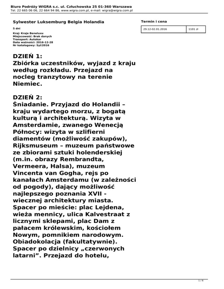 Biuro Podróży WIGRA s.c. ul. Człuchowska 25 01-360 Warszawa Tel. 22 665 06 06, 22 664 94 86, www.wigra.com.pl, e-mail: [email protected] Sylwester Luksemburg Belgia Holandia 5 dni Termin i cena 29.12-02.01.2016 1101 zł Kraj: Kraje Beneluxu Miejscowość: Brak danych Transport: Autokar Data ważności: 2016-12-28 Nr katalogowy: Syl/2016 DZIEŃ 1: Zbiórka uczestników, wyjazd z kraju według rozkładu. Przejazd na nocleg tranzytowy na terenie Niemiec. DZIEŃ 2: Śniadanie. Przyjazd do Holandii – kraju wydartego morzu, z bogatą kulturą i architekturą. Wizyta w Amsterdamie, zwanego Wenecją Północy: wizyta w szlifierni diamentów (możliwość zakupów), Rijksmuseum – muzeum państwowe ze zbiorami sztuki holenderskiej (m.in. obrazy Rembrandta, Vermeera, Halsa), muzeum Vincenta van Gogha, rejs po kanałach Amsterdamu (w zależności od pogody), dający możliwość najlepszego poznania XVII wiecznej architektury miasta. Spacer po mieście: plac Lejdena, wieża mennicy, ulica Kalvestraat z licznymi sklepami, plac Dam z pałacem królewskim, kościołem Nowym, pomnikiem narodowym. Obiadokolacja (fakultatywnie). Spacer po dzielnicy „czerwonych latarni”. Przejazd do hotelu, 1/6 Biuro Podróży WIGRA s.c. ul. Człuchowska 25 01-360 Warszawa Tel. 22 665 06 06, 22 664 94 86, www.wigra.com.pl, e-mail: [email protected] zakwaterowanie, nocleg. DZIEŃ 3: Śniadanie. Pobyt na farmie holenderskiej z produkcją sera i sabotów, następnie przejazd do Hagi, siedziby rządu holenderskiego; zwiedzanie miasta: Pałac Pokoju, w którym mieści się Międzynarodowy Trybunał Sprawiedliwości. Następnie Parlament, starówka z kościołem św. Jakuba i Pałacem Królewskim. Przejazd do Brukseli. Zwiedzanie stolicy Belgii, miasta piwa i czekolady. Objazd miasta autokarem: m.in. dzielnica europejska: Rada Unii Europejskiej, siedziba Komisji Europejskiej, Parlament Europejski. Obiadokolacja (fakultatywnie), przywitanie Nowego Roku na najpiękniejszym rynku Europy Grand Place: Ratusz z XV w., Dom Królewski, domy cechowe, katedra św. Michała. Powrót do hotelu na nocleg około godz. 01:30. DZIEŃ 4: Śniadanie Wizyta u Manneken Pis’a - siusiającego chłopczyka, symbolu Brukseli, następnie park Cinquantenaire z Łukiem Triumfalnym upamiętniającym 50 rocznicę powstania państwa belgijskiego. Przejazd do 2/6 Biuro Podróży WIGRA s.c. ul. Człuchowska 25 01-360 Warszawa Tel. 22 665 06 06, 22 664 94 86, www.wigra.com.pl, e-mail: [email protected] Luksemburga stolicy Wielkiego Księstwa Luksemburg, zwiedzanie miasta: plac Konstytucji, katedra Notre Dame, pałac książęcy, fragmenty cytadeli, spacer nad dzielnicą Grund, ulicą de la Corniche, czyli najpiękniejszym „balkonem” Europy. Obiadokolacja (fakultatywnie). Wyjazd do kraju, nocny przejazd przez Niemcy. DZIEŃ 5: Przyjazd do kraju, powrót do poszczególnych miejscowości. Program imprezy jest ramowy. Kolejność zwiedzania może ulec zmianie. Istnieje możliwość wyjazdu z następujących miast: Gdańsk, Gdynia, Koszalin, Szczecin, Olsztyn, Łódź, Konin, Poznań, Bydgoszcz, Toruń, Białystok, Radom, Rzeszów, Tarnów, Kielce, Czestochowa, Kraków, Katowice, Gliwice, Opole, Wrocław. ZAREZERWUJ JUŻ DZIŚ, TEL. 22 665 06 06, 22 664 94 86 DOPŁATY OPCJONALNE: Dopłata do 3 obiadokolacji (bez napojów): 260 zł Dopłata do pokoju 1-os. 290 zł 3/6 Biuro Podróży WIGRA s.c. ul. Człuchowska 25 01-360 Warszawa Tel. 22 665 06 06, 22 664 94 86, www.wigra.com.pl, e-mail: [email protected] CENA IMPREZY OBEJMUJE: - przejazd autokarem (klimatyzacja, barek, dvd, wc) - 3 noclegi w hotelach**/*** w pokojach 2 - os. z łazienką - 3 śniadania w formie bufetu - program turystyczny - opiekę pilota - ubezpieczenie Signal Iduna (KL 10.000 EUR, NNW 15.000 PLN, bagaż podróżny 1.000 PLN) DODATKOWO PŁATNE: - pakiet do realizacji programu: 60 EUR (rezerwacje i wstępy do zwiedzanych obiektów, usługi przewodnickie, rejs po kanałach w Amsterdamie, zestaw słuchawkowy Tour Guide) płatny obligatoryjnie pilotowi wycieczki. WAŻNE INFORMACJE: 1. Wycieczki będą realizowane w zależności od ilości uczestników w grupie: wygodnymi autokarami lub wygodnymi busami. 2. Niektóre połączenia krajowe mogą być realizowane innymi środkami transportu niż autokar (bus, samochód osobowy, autokar liniowy, pociąg). Trasy antenowe obsługiwane są bez pilota. 3. Wyjazd *antenkowy za dopłatą z wybranego miasta organizowany przy minimum 6 os. wsiadających. W przypadku braku wymaganego 4/6 Biuro Podróży WIGRA s.c. ul. Człuchowska 25 01-360 Warszawa Tel. 22 665 06 06, 22 664 94 86, www.wigra.com.pl, e-mail: [email protected] min. 6 osób PBP OLSZTYN ma prawo anulować wyjazd z danej miejscowości. Anulacja wyjazdu nie upoważnia do bezkosztowej rezygnacji z wycieczki. W takim przypadku Klient wybiera wyjazd z innej miejscowości gwarantowanej. 4. Podczas przejazdów krajowych w ramach niektórych wycieczek możliwe są przesiadki. 5. Godziny i miejsca wsiadania mogą ulec zmianie, po wcześniejszym poinformowaniu Klienta. 6. Pakiet do realizacji programu (rezerwacje i wstępy do zwiedzanych obiektów, usługi przewodnickie, bilety komunikacji miejskiej, opłaty klimatyczne oraz koszty zestawu słuchawkowego Tour Guide lub inne) nie jest ujęty w cenie imprezy wyrażonej w PLN. Cena pakietu do realizacji programu podana jest przy opisach poszczególnych wycieczek. Obligatoryjny koszt pakietu dotyczący realizacji programu jest kalkulowany przy grupie min. 40 osób. Przy mniejszej ilości uczestników cena pakietu zostanie przeliczona na odpowiednią ilość osób w grupie i podana do wiadomości uczestników przed wycieczką. Cena pakietu może być podwyższona maksymalnie o 25% podanej ceny w EUR/GBP/inna 5/6 Biuro Podróży WIGRA s.c. ul. Człuchowska 25 01-360 Warszawa Tel. 22 665 06 06, 22 664 94 86, www.wigra.com.pl, e-mail: [email protected] waluta. Powyższa zmiana nie upoważnia Klienta do rezygnacji z uczestnictwa w wycieczce. 7. Osoby podr