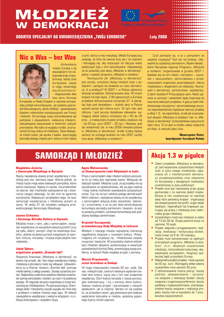 DODATEK SPECJALNY DO DWUMIESIĘCZNIKA „TWÓJ EURODESK” Nic o Was – bez Was „Komunikacja między Europą a jej obywatelami nie dotrzymała kroku transformacji, której Unia Europejska uległa w ciągu ostatniego dwudziestolecia” – diagnozowała dwa lata temu Komisja Europejska w Białej Księdze w sprawie europejskiej polityki komunikacyjnej. Jej wydanie poprzedził kilkumiesięczny „okres refleksji”, spowodowany fiaskiem referendów konstytucyjnych we Francji i Holandii. Od tamtego czasu komunikowanie się polityków z obywatelami, zwłaszcza młodymi, zdecydowanie awansowało w hierarchii unijnych priorytetów. Nie tylko ze względu na fakt, że przyszłość Europy zależy od młodzieży. Także dlatego, że młodzi ludzie, jak wynika z badań, dostrzegają potrzebę dialogu między tymi, którzy w Unii rządzą a tymi, którzy w niej mieszkają. Młodzi Europejczycy uważają, że Unia nie zawsze liczy się z ich zdaniem i domagają się, aby dotyczące ich decyzje władz publicznych były z nimi konsultowane. Odpowiedzią na te postulaty jest akcja „Młodzież w demokracji”, jedna z nowości programu „Młodzież w działaniu”. Teoretycznie cel „Młodzieży w demokracji” jest prosty: umożliwić dialog młodych ludzi z politykami i zachęcić do działania na rzecz demokracji. A w praktyce? W 2007 r. w Polsce zgłoszono dziesięć projektów. Dofinansowano dwa. W innych krajach nie było lepiej. Z 99 zgłoszonych w Europie projektów dofinansowanie otrzymało 37. A pieniędzy było pod dostatkiem – budżet akcji w Polsce wynosił ponad pół miliona euro. W tym roku jest zbliżony. I jest jeszcze dodatkowe ułatwienie: wymagany wkład własny zmniejsza się z 40 do 25 proc., a maksymalny budżet projektu zwiększa się – do 50 tys. euro (2007 – 25 tys.). Niestety, jest też wiadomość zła: w roku 2008 niewykorzystane w „Młodzieży w demokracji” środki trzeba będzie zwrócić do unijnego budżetu (w roku 2007 zasiliły inne akcje „Młodzieży w działaniu”). SAMORZĄD I MŁODZIEŻ Luty 2008 Czyli pieniądze są, a co z pomysłami na wspólne inicjatywy? Tych też nie brakuje. Udowodnili to uczestnicy seminarium „Razem łatwiej”, które Narodowa Agencja Programu „Młodzież w działaniu” zorganizowała w grudniu 2007 r. Spotkali się na nim młodzi z dorosłymi – uczniowie z nauczycielami, samorządowcy z przedstawicielami organizacji pozarządowych, liderzy młodzieżowi z ekspertami od młodzieży. Rozmawiali o demokracji, partnerstwie, współpracy. Z jakim skutkiem? Przeczytajcie sami. Niech opisane tu pomysły i wskazówki będą inspiracją do tworzenia własnych projektów. A gdy już pełni młodzieżowego entuzjazmu i samorządowego poczucia odpowiedzialności będziecie tworzyć projekty w Akcji 1.3., nie zapomnijcie, że tak jak w pozostałych akcjach „Młodzieży w działaniu” tak i w „Młodzieży w demokracji” przewodnikowe wytyczne to tylko ramy. To co jest w środku zależy wyłącznie od Was. A rachunki płaci Unia. Wawrzyniec Pater, koordynator Eurodesk Polska Akcja 1.3 w pigułce • Celem projektów „Młodzieży w demokra- Magdalena Jeziorna z Samorządu Miejskiego w Byczynie Agata Matuszewska ze Stowarzyszenia Ludzi Aktywnych w Łodzi Naszą największą obawą przed współpracą z młodzieżą jest tzw. słomiany zapał. Wiemy jednak, że młodzi ludzie mają wiele ciekawych pomysłów, które warto realizować. Należy im zaufać, nie przekreślać na starcie, dać możliwość wykazywania się i stworzenia czegoś własnego, bo dla nich to ogromne wyróżnienie. Najlepszym przykładem tego, że nasz samorząd współpracuje z młodzieżą jestem ja sama. W wieku 21 lat zostałam zastępcą przewodniczącego Samorządu Miejskiego. Praca z samorządem daje młodym ludziom poczucie, że to co robią jest naprawdę ważne. Motywuje do dalszych działań. Młodzież czuje, że jej projekty nie są wyizolowane ze społeczeństwa, ale są jego częścią i mają realną możliwość wywoływania pozytywnych zmian. Czy nie na tym właśnie polega demokracja? Moim zdaniem, największe obawy co do współpracy z samorządem dotyczą braku otwartości, tolerancji i zrozumienia, a co za tym idzie konstruktywnej komunikacji pomiędzy partnerami. Uważam, że jest to poważny problem, ponieważ komunikacja jest podstawą każdego partnerstwa. Joanna Cichowicz z Gminnego Ośrodka Kultury w Gąsowie Młodzież może z nami, jako z samorządem, nawiązać współpracę na wszystkich płaszczyznach! Liczy się tylko „dobry” pomysł i chęć do wspólnego działania. Jednak na płaszczyznach związanych ze sportem, kulturą, rozrywką i muzyką chyba pójdzie nam najłatwiej... Jakub Tylman, organizator projektu „Śremski Idol” Wsparcie finansowe „Młodzieży w demokracji” na pewno się przyda, ale i bez niego współpraca między młodzieżą a dorosłymi może się odbywać. Udowodniliśmy to w Śremie. Konkurs „Śremski Idol” promuje młode talenty z całego powiatu. Zasady są bardzo proste. Najbardziej uzdolniona wokalnie młodzież przechodzi szereg warsztatów i szkoleń, po czym ma publiczny występ. W nagrodę wszyscy wyjeżdżają w trasę koncertową po Wielkopolsce. Po pierwszej edycji „Śremskiego Idola” mieszkańcy zaczęli wysyłać do mnie listy z prośbami o kolejne imprezy tego typu. W efekcie nawiązaliśmy współpracę z wieloma artystami, m.in. Gosią Andrzejewicz i zespołem Goya. Krzysztof Szczepaniak, przewodniczący Rady Miejskiej w Łańcucie Młodych z naszego miasta najczęściej interesują zagadnienia związane z rozwojem kultury. Wspomagamy ich inicjatywy np.: młodzieżowe zespoły muzyczne i taneczne. W przyszłości chętnie widziałbym młodzież aktywnie uczestniczącą w otwartych posiedzeniach Komisji Rady, prezentującą swoje problemy, w których Rada mogłaby przyjść z pomocą. Marcin Przystawski, uczeń technikum w Gołdapi W mojej miejscowości mieszk