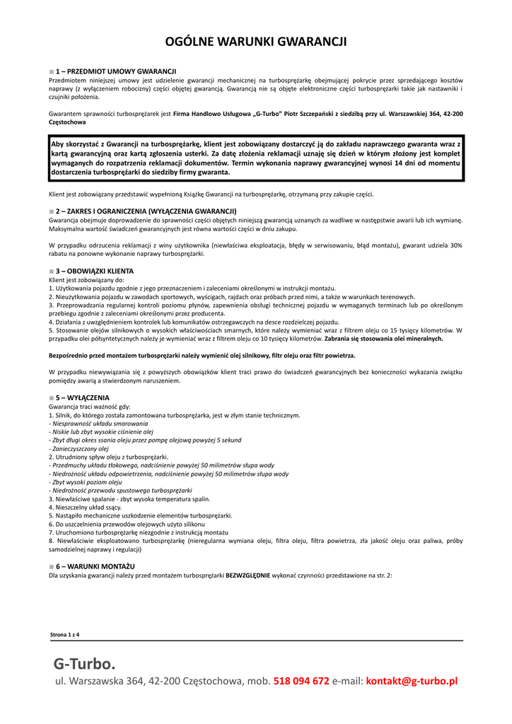 OGÓLNE WARUNKI GWARANCJI ■ 1 – PRZEDMIOT UMOWY GWARANCJI Przedmiotem niniejszej umowy jest udzielenie gwarancji mechanicznej na turbosprężarkę obejmującej pokrycie przez sprzedającego kosztów naprawy (z wyłączeniem robocizny) części objętej gwarancją. Gwarancją nie są objęte elektroniczne części turbosprężarki takie jak nastawniki i czujniki położenia. Gwarantem sprawności turbosprężarek jest Firma Handlowo Usługowa „G-Turbo” Piotr Szczepański z siedzibą przy ul. Warszawskiej 364, 42-200 Częstochowa Aby skorzystać z Gwarancji na turbosprężarkę, klient jest zobowiązany dostarczyć ją do zakładu naprawczego gwaranta wraz z kartą gwarancyjną oraz kartą zgłoszenia usterki. Za datę złożenia reklamacji uznaję się dzień w którym złożony jest komplet wymaganych do rozpatrzenia reklamacji dokumentów. Termin wykonania naprawy gwarancyjnej wynosi 14 dni od momentu dostarczenia turbosprężarki do siedziby firmy gwaranta. Klient jest zobowiązany przedstawić wypełnioną Książkę Gwarancji na turbosprężarkę, otrzymaną przy zakupie części. ■ 2 – ZAKRES I OGRANICZENIA (WYŁĄCZENIA GWARANCJI) Gwarancja obejmuje doprowadzenie do sprawności części objętych niniejszą gwarancją uznanych za wadliwe w następstwie awarii lub ich wymianę. Maksymalna wartość świadczeń gwarancyjnych jest równa wartości części w dniu zakupu. W przypadku odrzucenia reklamacji z winy użytkownika (niewłaściwa eksploatacja, błędy w serwisowaniu, błąd montażu), gwarant udziela 30% rabatu na ponowne wykonanie naprawy turbosprężarki. ■ 3 – OBOWIĄZKI KLIENTA Klient jest zobowiązany do: 1. Użytkowania pojazdu zgodnie z jego przeznaczeniem i zaleceniami określonymi w instrukcji montażu. 2. Nieużytkowania pojazdu w zawodach sportowych, wyścigach, rajdach oraz próbach przed nimi, a także w warunkach terenowych. 3. Przeprowadzania regularnej kontroli poziomu płynów, zapewnienia obsługi technicznej pojazdu w wymaganych terminach lub po określonym przebiegu zgodnie z zaleceniami określonymi przez producenta. 4. Działania z uwzględnieniem kontrolek lub komunikatów ostrzegawczych na desce rozdzielczej pojazdu. 5. Stosowanie olejów silnikowych o wysokich właściwościach smarnych, które należy wymieniać wraz z filtrem oleju co 15 tysięcy kilometrów. W przypadku olei półsyntetycznych należy je wymieniać wraz z filtrem oleju co 10 tysięcy kilometrów. Zabrania się stosowania olei mineralnych. Bezpośrednio przed montażem turbosprężarki należy wymienić olej silnikowy, filtr oleju oraz filtr powietrza. W przypadku niewywiązania się z powyższych obowiązków klient traci prawo do świadczeń gwarancyjnych bez konieczności wykazania związku pomiędzy awarią a stwierdzonym naruszeniem. ■ 5 – WYŁĄCZENIA Gwarancja traci ważność gdy: 1. Silnik, do którego została zamontowana turbosprężarka, jest w złym stanie technicznym. - Niesprawność układu smarowania - Niskie lub zbyt wysokie ciśnienie olej - Zbyt długi okres ssania oleju przez pompę olejową powyżej 5 sekund - Zanieczyszczony olej 2. Utrudniony spływ oleju z turbosprężarki. - Przedmuchy układu tłokowego, nadciśnienie powyżej 50 milimetrów słupa wody - Niedrożność układu odpowietrzenia, nadciśnienie powyżej 50 milimetrów słupa wody - Zbyt wysoki poziom oleju - Niedrożność przewodu spustowego turbosprężarki 3. Niewłaściwe spalanie - zbyt wysoka temperatura spalin. 4. Nieszczelny układ ssący. 5. Nastąpiło mechaniczne uszkodzenie elementów turbosprężarki. 6. Do uszczelnienia przewodów olejowych użyto silikonu 7. Uruchomiono turbosprężarkę niezgodnie z instrukcją montażu 8. Niewłaściwie eksploatowano turbosprężarkę (nieregularna wymiana oleju, filtra oleju, filtra powietrza, zła jakość oleju oraz paliwa, próby samodzielnej naprawy i regulacji) ■ 6 – WARUNKI MONTAŻU Dla uzyskania gwarancji należy przed montażem turbosprężarki BEZWZGLĘDNIE wykonać czynności przedstawione na str. 2: Strona 1 z 4 G-Turbo. ul. Warszawska 364, 42-200 Częstochowa, mob. 518 094 672 e-mail: [email protected] Bardzo ważne jest, aby znaleźć i wyeliminować wszelkie przyczyny nieprawidłowego funkcjonowania turbosprężarki przed jej wymianą . 1. Zdemontuj i sprawdź cały system dolotowy i oczyść go w razie potrzeby. Następnie wymień filtr powietrza. Skontroluj czystość obudowy filtra powietrza! Wszelkiego rodzaju zabrudzenia mogą powodować uszkodzenia turbosprężarki. Używaj tylko oryginalnych części (części OEM) lub części zalecanych przez producentów. 2. System smarowania turbosprężarki powinien być sprawdzony pod względem szczelności i drożności. Zdemontuj miskę olejową i przewody olejowe w celu ich dokładnego czyszczenia. Nawet niewielkie zabrudzenie oleju powoduje uszkodzenie wałka turbosprężarki, luzy i wycieki. Wszystkie uszczelki należy sprawdzić i w razie potrzeby wymienić. 3. Wymień olej w silniku oraz filtr oleju. Nie stosuj olei mineralnych – ich słaba odporność na wysokie temperatury może spowodować uszkodzenie turbosprężarki. Stosuj filtry wysokiej jakości. Używaj wyłącznie części i oleju zalecanego przez producenta. 4. Przy montażu turbosprężarki używaj wyłącznie nowych uszczelek do kolektora. Kolektor wydechowy należy sprawdzić i w razie potrzeby również oczyścić. Wszelkie zanieczyszczenia mogą spowodować uszkodzenie na turbosprężarki. 5. Podłącz system smarowania turbosprężarki. Wlej czysty olej silnikowy do wnętrza turbosprężarki za pomocą specjalnego gniazda, aby uniknąć "suchego" startu turbosprężarki. Jeśli to możliwe kręcić silnikiem za pomocą rozrusznika przez ok 30 sekund! Start turbosprężarki na suchych łożyskach spowoduje jej natychmiastowe uszkodzenie. 6. Po podłączeniu wszystkich układów do turbosprężarki i uruchomieniu silnika, sprawdź wszystkie połączenia i szczelność układów. Pozost
