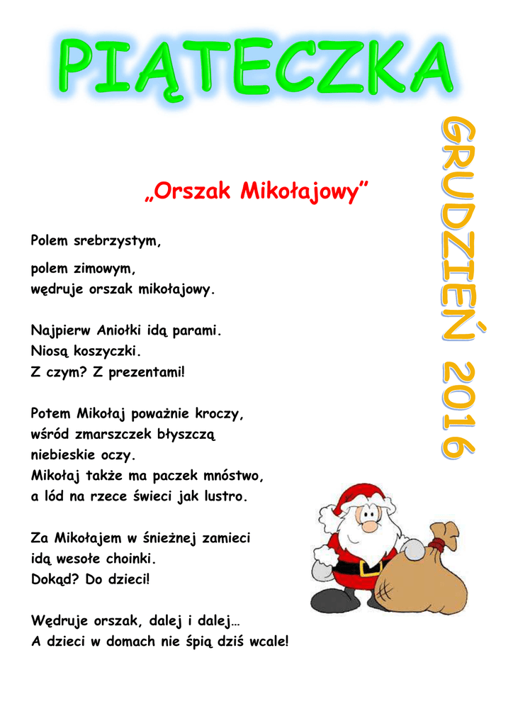 „Orszak Mikołajowy” Polem srebrzystym, polem zimowym, wędruje orszak mikołajowy. Najpierw Aniołki idą parami. Niosą koszyczki. Z czym? Z prezentami! Potem Mikołaj poważnie kroczy, wśród zmarszczek błyszczą niebieskie oczy. Mikołaj także ma paczek mnóstwo, a lód na rzece świeci jak lustro. Za Mikołajem w śnieżnej zamieci idą wesołe choinki. Dokąd? Do dzieci! Wędruje orszak, dalej i dalej… A dzieci w domach nie śpią dziś wcale! Z okazji nadchodzących Świąt Bożego Narodzenia redakcja gazetki składa dzieciom i Rodzicom najserdeczniejsze życzenia świąteczne: Święta szybko się zbliżają, w święta ludzie się kochają. Przy dzieleniu się opłatkiem, płyną z oczu łzy ukradkiem. Życzymy więc wszystkiego najlepszego, dając w policzek całusa wielkiego. W nocy Jezus się urodzi i serduszka nam odmłodzi. Wesołe święta, oby takie były i oby wszystkie życzenia się spełniły. Placuszki rybno – ziemniaczane Składniki : • • • • • • • • • 1 łyżka masła klarowanego 0,3 kg dorsza lub innej białej ryby 6 średnich ziemniaków 1 jajko 2 łyżki mąki pszennej 1/2 pęczka koperku sól , pieprz biały do smaku 1/2 płaskiej łyżeczki mielonej gałki muszkatołowej bułka tarta do obtoczenia – około 1 szklanki Ziemniaki obieramy , gotujemy w osolonej wodzie jak do obiadu . Następnie odcedzamy jak już będą miękkie i odstawiamy do wystygnięcia . Rybę pozbawiamy skóry i ości, kroimy w małe kawałki około 2 cm. Podsmażamy przez 4 minuty na maśle , lekko solimy , odstawiamy do wystygnięcia . Do dużej miski przeciskamy przez praskę ziemniaki, wbijamy do nich jajko , dodajemy mąkę , sól, biały pieprz , gałkę , posiekany koperek i wszystko wyrabiamy ręka na spójną masę . Na końcu dodajemy rybę i już tylko lekko mieszamy łyżką , tak żeby ryba się nam nie rozgniotła . Nabieramy około łyżki masy i wrzucamy do bułki tartej, obtaczając ją dokładnie i tworząc w rękach ładny kształt lekko spłaszczonego placuszka . Smażymy na złoty kolor z obu stron na średnim ogniu , około 5 minut z każdej strony .Podajemy na gorąco. SMACZNEGO „Najważniejszy prezent” Gabriela Balcarek To był czas ogromnego zamieszania w niebie. Aniołki szykowały się do drogi na ziemię aby tam myszkować po parapetach dziecinnych pokoików w poszukiwaniu listów do Świętego Mikołaja. Roboty było co niemiara. Trzeba przecież wyprostować skrzydełka, wyprać białe szaliczki i czapeczki, wypastować złote buciki… Po tych przygotowaniach aniołki stawały w kolejce i każdy wywoływany po imieniu podchodził do Mikołaja. A ten przydzielał mu dany rejon na świecie, gdzie aniołek miał szukać listów od dzieci. Wśród wielu aniołków były też dwa całkiem małe, które po raz pierwszy miały lecieć z taką ważną misją na ziemię. Był to Lolek i Felek. – Lolek!!! – zagrzmiał gromkim głos Mikołaj. – Jestem. – Lolek aż podskoczył z wrażenia. – I Felek. – zawołał Mikołaj – Z racji tego, że to Wasza pierwsza misja polecicie razem, żeby się wspierać.- Tak jest Mikołaju. – odpowiedziały chórem aniołki. – Wasz teren to…. – Mikołaj zajrzał do mapy – Polska. – Tak jest. – aniołki zasalutowały. – To ruszajcie kochani a uważajcie na ziemi na siebie – Mikołaj otworzył drzwi. Aniołki naciągnęły mocniej czapki, poprawiły szaliczki i ruszyły w sam środek śnieżnego puchu lecącego z nieba. Droga nie zajęła im dużo czasu, gdyż aniołki latają bardzo szybko a dzięki wiejącym wiatrom, które znają cały świat zawsze trafiają na wyznaczone miejsce. Tak też było i z naszymi smykami. Bez problemu trafiły do wyznaczonego kraju i rozpoczęły poszukiwania listów od dzieci. Wskakiwały na parapety i zaglądały przez szyby do dziecięcych pokoików. Jeżeli na parapecie leżał liścik, w sobie tylko znany sposób wyciągały go i chowały do specjalnej złotej teczki, którą potem miały przekazać Mikołajowi. Dzieci prosiły w listach o lalki, misie, autka, książeczki, gry… Aniołki czytały, uśmiechały się i kiwały głowami zadowolone. Dzieci zostawiały często obok listów poczęstunek dla aniołków, więc nasi skrzydlaci bohaterowie byli objedzeni jak bąki. Kiedy wydawało się, że odwiedziły już wszystkie domy przysiedli na gałęzi drzewa, żeby poprawić sobie srebrne sznurówki w złotych bucikach. – Felek popatrz – Lolek wskazał palcem na coś, co stało pomiędzy drzewami – to chyba dom w którym mieszka jakieś dziecko. Felek przyjrzał się budynkowi, który wskazał mu przyjaciel. – Eee, coś ty. Domy w których mieszkają dzieci są kolorowe i radosne a ten jest szary, ponury i smutny. – A ja ci mówię, że mieszka tam dziecko – Lolek nie dawał za wygraną – przecież w ogrodzie stoi huśtawka i jest piaskownica. Popatrz sam. Dorośli nie potrzebują takich rzeczy. Felek zeskoczył z gałązki i podfrunął bliżej. Okazało się że Lolek miał rację. W ogrodzi stały dziecięce zabawki. Felek popatrzył w okna domu. W jednym z nich stał bardzo, bardzo smutny chłopczyk i patrzył przed siebie. -Hmmm – mruknął Felek – Dziwne. Musimy to sprawdzić. Poczekał aż chłopiec odejdzie od okna i wskoczył lekko na parapet. Jakież było jego zdziwienie, kiedy na parapecie ujrzał list. Szybko go wyciągnął. Spojrzeli z Lolkiem na rysunek i oniemieli. – Musimy jak najszybciej dostarczyć ten list Mikołajowi – powiedział Lolek. I już śmigał białymi skrzydełkami w kierunku nieba. Kiedy dolecieli na miejsce natychmiast podążyli do pokoju Mikołaja. – No i jak tam kochani? – uśmiechnął się Mikołaj – misja zakończona? – O tak – aniołki potwierdziły z zapałem – ale mamy coś dziwnego. – Co takiego? – zainteresował się Mikołaj. – To list, który znaleźliśmy w smutnym domu – odpowiedziały aniołki podając listy Mikołajowi. Ten przyjrzał się rysun