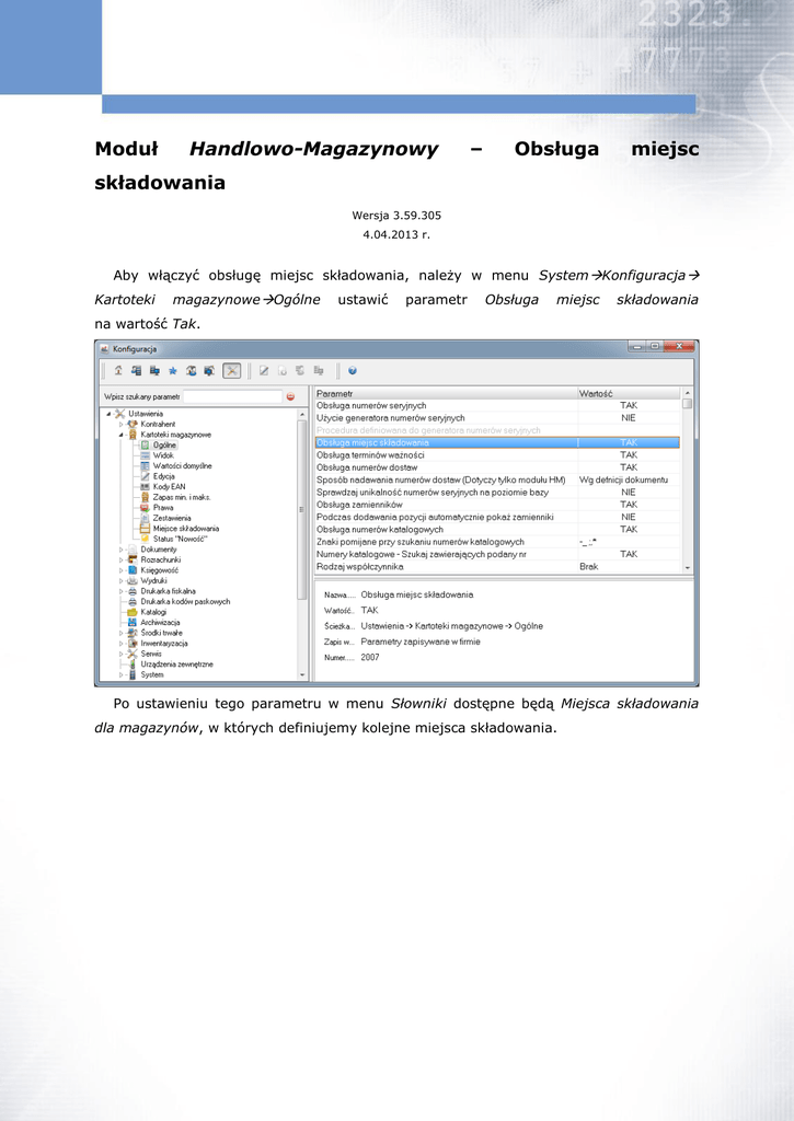 Moduł Handlowo-Magazynowy – Obsługa miejsc składowania Wersja 3.59.305 4.04.2013 r. Aby włączyć obsługę miejsc składowania, należy w menu SystemKonfiguracja Kartoteki magazynoweOgólne ustawić parametr Obsługa miejsc składowania na wartość Tak. Po ustawieniu tego parametru w menu Słowniki dostępne będą Miejsca składowania dla magazynów, w których definiujemy kolejne miejsca składowania. W trakcie definiowania wskazujemy magazyn, na którym to miejsce ma być dostępne, jego kod, nazwę oraz kod kreskowy. Dodatkowo użytkownik może skorzystać z procedury definiowanej, która będzie generowała kod kreskowy. Obsługa miejsc składowania definiowana jest w obrębie magazynu, dlatego na definicji magazynu dostępny jest parametr Obsługa miejsc składowania, który dla zwykłych magazynów ustawiamy na wartość: Niedostępna, a dla magazynów, które mają być prowadzone z tą obsługą - na wartość: Na poziomie kartotek. Dla definicji magazynu, która ma włączoną obsługę miejsc składowania, dostępna jest dodatkowa zakładka: Miejsca składowania, na której znajduje się lista podpiętych miejsc (z poziomu tej zakładki można dodawać kolejne miejsca składowania). Dodatkowo na zakładce Inne, należy zdefiniować jako Strefę przygotowania towaru miejsce składowania, na które domyślnie będzie przyjmowany towar z dokumentów przychodu. *** Po odpowiednim ustawieniu miejsc składowania wprowadzamy dokument przyjęcia, np. PZ, wskazujemy dostawcę oraz wprowadzamy kartotekę. Po zamknięciu dokumentu magazynowego, na magazynie który podlega obsłudze miejsc składowań, na strefie przyjęcia towaru, pojawią się wpisy o stanie danych kartotek. Aby zmienić miejsce składowania towaru, należy w menu Magazyn wybrać opcję Dokumenty obrotu na miejscach składowania i kliknąć na ikonę Dodaj (F3). Wskazujemy indeks towaru, który chcemy przesunąć, a następnie na zakładce Rozchód z miejsc składowania podajemy ilości z wybranych miejsc (jest to lista miejsc, na których występuje stan tego towaru). Podajemy jaką ilość chcemy rozchodować, a następnie na zakładce Przychód na miejsca składowania, dodajemy te miejsca, na które chcemy zrobić rozchód. W ten sposób jednym dokumentem można zrobić rozchód na kilka miejsc składowania. *** Aby wykonać rozchód z miejsc składowania, należy wystawić dokument sprzedaży, a następnie kliknąć na nim prawym klawiszem myszy i z menu podręcznego wybrać opcję DodatkoweUzupełnij dokument rozchodu miejsc składowania. UWAGA! Samo wystawienie dokumentu sprzedaży nie generuje żadnego rozchodu z miejsc składowań. W trakcie poprawy dokumentu sprzedaży użytkownik może wskazać ręcznie, z których miejsc składowania ma być rozchodowany dany stan i po jego zapisie następuje faktyczny rozchód z miejsc składowania. *** Dodatkowo włączenie w systemie obsługi miejsc składowania wprowadza zmiany w sposobie przeprowadzania inwentaryzacji: 1. Jeżeli w konfiguracji inwentaryzacja włączona jest jako nowa wersja, to podczas tworzenia inwentaryzacji na magazynie podlegającym obsłudze miejsc składowania, typ inwentaryzacji domyślnie ustawia się na: Według miejsc składowania i operacji tej nie można zmienić. 2. Podczas dodawania arkuszy spisowych i pozycji na tym arkuszu, dla konkretnego indeksu, użytkownik oprócz wskazania ilości spisanej musi wskazać miejsce składowania, na którym znajduje się dany stan. Po utworzeniu dokumentu inwentaryzacji wszelkie rozchody są automatycznie przez system w tle. i zmiany tych miejsc wystawiane