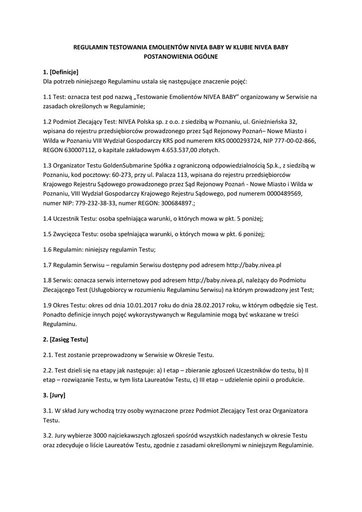 REGULAMIN TESTOWANIA EMOLIENTÓW NIVEA BABY W KLUBIE NIVEA BABY POSTANOWIENIA OGÓLNE 1. [Definicje] Dla potrzeb niniejszego Regulaminu ustala się następujące znaczenie pojęć: 1.1 Test: oznacza test pod nazwą „Testowanie Emolientów NIVEA BABY” organizowany w Serwisie na zasadach określonych w Regulaminie; 1.2 Podmiot Zlecający Test: NIVEA Polska sp. z o.o. z siedzibą w Poznaniu, ul. Gnieźnieńska 32, wpisana do rejestru przedsiębiorców prowadzonego przez Sąd Rejonowy Poznań– Nowe Miasto i Wilda w Poznaniu VIII Wydział Gospodarczy KRS pod numerem KRS 0000293724, NIP 777-00-02-866, REGON 630007112, o kapitale zakładowym 4.653.537,00 złotych. 1.3 Organizator Testu GoldenSubmarine Spółka z ograniczoną odpowiedzialnością Sp.k., z siedzibą w Poznaniu, kod pocztowy: 60-273, przy ul. Palacza 113, wpisana do rejestru przedsiębiorców Krajowego Rejestru Sądowego prowadzonego przez Sąd Rejonowy Poznań - Nowe Miasto i Wilda w Poznaniu, VIII Wydział Gospodarczy Krajowego Rejestru Sądowego, pod numerem 0000489569, numer NIP: 779-232-38-33, numer REGON: 300684897.; 1.4 Uczestnik Testu: osoba spełniająca warunki, o których mowa w pkt. 5 poniżej; 1.5 Zwycięzca Testu: osoba spełniająca warunki, o których mowa w pkt. 6 poniżej; 1.6 Regulamin: niniejszy regulamin Testu; 1.7 Regulamin Serwisu – regulamin Serwisu dostępny pod adresem http://baby.nivea.pl 1.8 Serwis: oznacza serwis internetowy pod adresem http://baby.nivea.pl, należący do Podmiotu Zlecającego Test (Usługobiorcy w rozumieniu Regulaminu Serwisu) na którym prowadzony jest Test; 1.9 Okres Testu: okres od dnia 10.01.2017 roku do dnia 28.02.2017 roku, w którym odbędzie się Test. Ponadto definicje innych pojęć wykorzystywanych w Regulaminie mogą być wskazane w treści Regulaminu. 2. [Zasięg Testu] 2.1. Test zostanie przeprowadzony w Serwisie w Okresie Testu. 2.2. Test dzieli się na etapy jak następuje: a) I etap – zbieranie zgłoszeń Uczestników do testu, b) II etap – rozwiązanie Testu, w tym lista Laureatów Testu, c) III etap – udzielenie opinii o produkcie. 3. [Jury] 3.1. W skład Jury wchodzą trzy osoby wyznaczone przez Podmiot Zlecający Test oraz Organizatora Testu. 3.2. Jury wybierze 3000 najciekawszych zgłoszeń spośród wszystkich nadesłanych w okresie Testu oraz zdecyduje o liście Laureatów Testu, zgodnie z zasadami określonymi w niniejszym Regulaminie. 3.3. Niezależnie od pkt. 3.2. powyżej, Jury jest podmiotem nadzorującym Test i rozstrzyga wszelkie kwestie związane z jego organizacją, zgodnie z zasadami określonymi w Regulaminie. 4. [Zasady Testu] 4.1. Test polega na zgłoszeniu do udziału poprzez podanie imienia, płci i daty urodzenia dzieci Uczestnika, udzielenie odpowiedzi na jedno pytanie otwarte „Opisz w jaki sposób pielęgnujesz więź ze swoim dzieckiem” oraz wybranie produktu do przetestowania. Odpowiedź na pytanie otwarte może składać się maksymalnie z 260 znaków ze spacjami, ze wszystkich nadesłanych zgłoszeń zostanie wyłonionych 3000 najciekawszych, zgodnych z zasadami określonymi w Regulaminie. 4.2. Jeden Uczestnik może zgłosić się jeden raz do Testu. 4.3. Jury wybierze 3000 najciekawszych zgłoszeń do Testu, którym zostanie przyznana nagroda, na zasadach określonych w Regulaminie. 4.4. Przebieg I etapu Testu (10 stycznia – 28 lutego 2017 r.) – Zgłoszenia Uczestników jest następujący: a) Uczestnikiem Testu może być osoba zarejestrowana w Serwisie zgodnie z postanowieniami Regulaminu Serwisu, b) Uczestnik Testu musi wybrać produkt do przetestowania i udzielić odpowiedzi na pytanie oraz podać swoje dane teleadresowe w Serwisie, c) Po dokonaniu zgłoszenia przez Uczestnika, moderator dokona weryfikacji zgodności zgłoszenia z Regulaminem. Informacja o weryfikacji zostanie przesłana na podany podczas rejestracji adres email; d) Uczestnik Testu może dokonać zgłoszenia w Okresie Testu. 4.5. Przebieg II etapu Testu – wybór zwycięzców jest następujący: a) Jury wyłoni 3000 najciekawszych zgłoszeń, zgodnych z Regulaminem Testu, które zostaną zwycięskimi i nagrodzonymi. b) Decyzja Jury jest ostateczna i nie podlega procedurze odwoławczej i w stosunku do każdego Zwycięzcy Testu zostanie podana e-mailem do dnia 10 marca 2017 r. 4.6. Przebieg III etapu Testu – udzielenie opinii o produkcie jest następujący: a) Uczestnicy Testu po przetestowaniu produktu zostaną poproszeni o wypełnienie ankiety z wyrażeniem opinii na temat przetestowanego produktu. 5. [Uczestnicy Testu] 5.1. Uczestnikiem Testu może być każda osoba fizyczna posiadająca pełną zdolność do czynności prawych albo osoba posiadająca ograniczoną zdolność do czynności prawnych lecz działająca za zgodą swojego przedstawiciela ustawowego, mająca miejsce zamieszkania w Polsce. Uczestnik Testu jest zobowiązany do przedstawienia zgody przedstawiciela ustawowego na każde żądanie Podmiotu Zlecającego bądź Organizatora Konkursu. 5.2. Warunkiem udziału w Teście jest zarejestrowanie się w Serwisie na zasadach określonych w Serwisie w Regulaminie, korzystanie z Serwisu zgodnie z zasadami określonymi w Serwisie i pozostawienie dodatkowych danych teleadresowych do zrealizowania wysyłki testowanych produktów: imię, nazwisko, ulica, numer domu, kod pocztowy, miejscowość. 5.3. Warunkiem przystąpienia do Testu jest kliknięcie i akceptacja niniejszego Regulaminu. Zgłoszenie udziału w Teście oznacza akceptację jego zasad przewidzianych w niniejszym Regulaminie, w szczególności potwierdza prawdziwość informacji podanych przez Uczestnika Testu zgodnie z ust. 5.1 i 5.2 powyżej. 5.4. Kategorycznie zabrania się naruszania zasad uczciwego współzawodnictwa pod rygorem dyskwalifikacji z uczestnictwa w Teście decyzją Jury. 5.5. W Teście nie mogą uczestniczyć pracownicy Organizatora oraz Podmiotu Zlecającego Test, a także najbliżsi członkowie ich rodzin, przez co rozumie się małżonka, wstępnych, zstępn