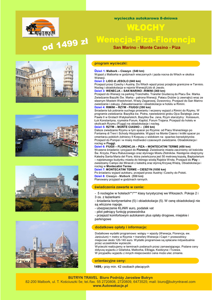 wycieczka autokarowa 8-dniowa W£OCHY Wenecja-Piza-Florencja ³ z 9 9 San Marino - Monte Casino - Piza o d 14 program wycieczki: Dzieñ 1: Malbork – Cieszyn (540 km) Wyjazd z Malborka w godzinach wieczornych i jazda nocna do W³och w okolice Wenecji. Dzieñ 2: LIDO di JESOLO (840 km) Przejazd przez Czechy i Austriê. Do W³och wjazd przez przejœcie graniczne w Tarvisio. Nocleg i obiadokolacja w rejonie Wenecji/Lido di Jesolo. Dzieñ 3: WENECJA – SAN MARINO –RIMINI (360 km) Przejazd do Wenecji na parking Tronchetto. Transfer Giudecc¹ do Placu Œw. Marka. Zwiedzanie Bazyliki Œw. Marka - patrona Wenecji, Pa³acu Do¿ów (z zewn¹trz) wraz ze s³awnym Mostem Westchnieñ, Wie¿y Zegarowej, Dzwonnicy. Przejazd do San Marino zwiedzanie i zakupy. Zakwaterowanie i obiadokolacja w hotelu w Rimini. Dzieñ 4: RIMINI – RZYM - FIUGGI (390 km) Sniadanie lub pobranie suchego prowiantu i wczesny wyjazd z Rimini do Rzymu. W programie zwiedzania: Bazylika œw. Piotra, nawiedzenie grobu Ojca Œwiêtego Jana Paw³a II w Grotach Watykañskich, Bazylika Œw. Jana, Rzym staro¿ytny : Koloseum, £uk Konstantyna, rzymskie Forum, Kapitol, Forum Trajana. Przejazd do hotelu w okolicach Rzymu (Fiuggi) na obiadokolacje i nocleg. Dzieñ 5: RZYM – MONTE CIASNO – (300 km) Dalsze zwiedzanie Rzymu w tym spacer po Rzymie: od Placu Weneckiego po Fontannê di Trevi i Schody Hiszpañskie. Wyjazd na Monte Ciasno i krótki spacer po cmentarzu polskich ¿o³nierzy II Korpusu z widokiem na opactwo benedyktynów. Przejazd do Pompei i w miarê mo¿liwoœci czasowych zwiedzanie. Obiadokolacja i nocleg w Fiuggi. Dzieñ 6: FIUGII – FLORENCJA – PIZA – MONTECATINI TERME (450 km) Wczesne œniadanie i przyjazd do Florencji. Zwiedzanie miasta zaczniemy od koœcio³a Œw. Krzy¿a, Placu Ratuszowego oraz s³ynnego Mostu Z³otników. Nastêpnie obejrzymy Katedrê Santa Maria del Fiore, która zwieñczona jest 50 metrow¹ kopu³¹, Baptysterium – najstarszego budynku miasta do którego wiod¹ Rajskie Wrota. Przejazd do Pizy – zwiedzamy Campo dei Miracoli z katedr¹ oraz s³ynn¹ Krzyw¹ Wie¿¹. Obiadokolacja i nocleg w Montecatini Terme. Dzieñ 7: MONTECATINI TERME – CIESZYN (1050 km) Po œniadaniu wyjazd autokaru, przejazd przez Austriê i Czechy do Polski. Dzieñ 8: Cieszyn - Malbork (550 km) Planowany przyjazd w godzinach rannych. œwiadczenia zawarte w cenie: - 5 noclegów w hotelach**/*** klasy turystycznej we W³oszech. Pokoje 2 i 3 os. z ³azienkami - œniadania kontynentalne (5) i obiadokolacje (5). W cenê obiadokolacji nie s¹ wliczone napoje. - ubezpieczenie KLiNW euro, podatek vat - pilot pe³ni¹cy funkcjê przewodnika - przejazd komfortowym autokarem plus op³aty drogowe, miejskie i parkingowe dodatkowe op³aty i informacje: Dodatkowe wydatki programowe: wstêpy + wjazdy (Wenecja, Florencja, ew. Janiculum) + metro w Rzymie + transfery Wenecja i Capri + przewodnicy miejscowi oko³o 120-140 euro. Wydatki programowe s¹ op³acane indywidualnie przez uczestników wycieczki. Wycieczki realizujemy w terminach podanych przez zamawiaj¹cego. Podane ceny dotycz¹ wyjazdu z Gdañska, Malborka, Elbl¹ga, Kwidzyna i Tczewa. W przypadku wyjazdu z innych miejscowoœci cena mo¿e ulec zmianie. orientacyjne ceny: 1499,- przy min. 42 osobach p³ac¹cych BUTRYN TRAVEL Biuro Podró¿y Jaros³aw Butryn 82-200 Malbork, ul. T. Koœciuszki 5e; tel./fax. 55 2720808, 2720809, 6473525; mail: [email protected] www.Autowakacje.pl