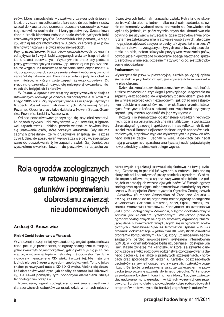 psów, które samodzielnie wyszukiwały zasypanych śniegiem ludzi, przy czym po odkopaniu ofiary spod śniegu jeden z psów wracał do klasztoru po pomoc, a pozostałe ogrzewały odkopanego człowieka swoim ciałem i lizały go po twarzy. Szacunkowe dane z kronik klasztoru mówią o około dwóch tysiącach ludzi uratowanych przez psy Św. Bernarda lub z ich pomocą, w ciągu 250-letniej historii ratownictwa w Alpach. W Polsce jako psów lawinowych używa się owczarków niemieckich. Psy gruzowiskowe. Praca psów gruzowiskowych polega na odnajdywaniu żywych ludzi zasypanych wskutek trzęsień ziemi lub katastrof budowlanych. Wykonywanie przez psy podczas pracy gwałtowniejszych ruchów (np. kopanie) nie jest wskazane, ze względu na możliwość naruszenia zawalonych konstrukcji, co spowodowałoby pogorszenie sytuacji osób zasypanych i zagrażałoby zdrowiu psa. Pies ma za zadanie jedynie zlokalizować miejsce, w którym czuje zapach żywego człowieka. Do pracy na gruzowiskach używa się najczęściej owczarków niemieckich, belgijskich i briardów. W Polsce w sprawie zwierząt wykorzystywanych w akcjach ratowniczych obowiązuje obecnie rozporządzenie MSWiA z 4 lutego 2005 roku. Psy wykorzystywane są w specjalistycznych Grupach Poszukiwawczo-Ratowniczych Państwowej Straży Pożarnej. Obecnie grupy takie działają w Nowym Sączu, Gdańsku, Poznaniu, Łodzi i w Warszawie. Od psa poszukiwawczego wymaga się, aby lokalizował tylko zapach żywych ludzi zasypanych w gruzowisku, a ignorował zapach zwłok ludzkich, przede wszystkim bowiem liczy się uratowanie osób, które przeżyły katastrofę. Gdy nie ma żadnych przesłanek, że w gruzowisku znajdują się jeszcze żywi ludzie, do poszukiwań wprowadza się psy wyspecjalizowane do poszukiwania tylko zapachu zwłok. Są również psy wyszkolone dwukierunkowo – do poszukiwania zapachu za- równo żywych ludzi, jak i zapachu zwłok. Potrafią one skoncentrować się albo na jednym, albo na drugim zadaniu, zależnie od komendy wydanej przez przewodnika. Doświadczenia wykazały jednak, że psów wyszkolonych dwukierunkowo nie powinno się używać w sytuacjach, gdzie zdecydowanym priorytetem jest zlokalizowanie i ratowanie osób żywych, ale gdzie mogą się znajdować zasypane osoby tak żywe, jak martwe. W akcjach ratowania zasypanych żywych osób liczy się czas dotarcia do nich, zatem fałszywie pozytywne wskazania psów, powodujące niepotrzebne skierowanie specjalistycznego sprzętu i środków w miejsca, gdzie nie ma żywych osób, jest zdecydowanie niepożądane. Rola ogrodów zoologicznych w ratowaniu ginących gatunków i poprawianiu dobrostanu zwierząt nieudomowionych narodowych organizacji prowadzi się fachową hodowlę zwierząt. Często są to gatunki już wymarłe w naturze. Ustalone są plany kolekcji i zasady współpracy pomiędzy ogrodami. W obrębie organizacji zwierzęta są przekazywane nieodpłatnie, z pełną dokumentacją ich wcześniejszych losów. W Europie ogrody zoologiczne spełniające międzynarodowe standardy są zrzeszone w Europejskim Stowarzyszeniu Ogrodów Zoologicznych i Akwariów (European Association of Zoos and Aquaria – EAZA). W Polsce do tej organizacji należą ogrody zoologiczne w Chorzowie, Gdańsku, Krakowie, Łodzi, Opolu, Płocku, Poznaniu, Warszawie i Wrocławiu. Kandydatem do członkostwa jest Ogród Zoologiczny w Zamościu, a Ogród Zoobotaniczny w Toruniu jest członkiem tymczasowym. Większość polskich ogrodów zoologicznych należy do światowej organizacji zbierającej dane o zwierzętach znajdujących się w ogrodach zoologicznych (International Species Information System – ISIS) i prowadzi dokumentację w jednolitym dla wszystkich ośrodków programie komputerowym (ARKS), który już niebawem będzie zastąpiony bardzo nowoczesnym systemem internetowym (ZIMS), w którym informacje będą uzupełniane i dostępne „on line”. Każde zwierzę ma kartotekę, w której są zawarte dane dotyczące nie tylko rodziców i rodzeństwa czy oznakowania danego osobnika, ale także o przebytych szczepieniach, chorobach oraz sposobach ich leczenia. Kartoteki poszczególnych osobników są jawne i dostępne dla wszystkich członków organizacji. Są także przekazywane wraz ze zwierzęciem w przypadku jego przemieszczania do innego ośrodka. W kartotece są podawane lokalne imiona i numery identyfikacyjne zwierzęcia, nadawane mu w ogrodach, w których wcześniej ono przebywało. Bardzo to ułatwia prowadzenie ksiąg rodowodowych i programów hodowlanych dla bardziej zagrożonych gatunków. Andrzej G. Kruszewicz Miejski Ogród Zoologiczny w Warszawie W znacznej, raczej mniej wykształconej, części społeczeństwa nadal pokutuje przekonanie, że ogrody zoologiczne to miejsca, gdzie zwierzęta są nieszczęśliwe, gdzie pokazuje się je za pieniądze, a wcześniej łapie w naturalnym środowisku. Tak funkcjonowały menażerie w XIX wieku i wcześniej. Nie mają one jednak nic wspólnego z ogrodami zoologicznymi. To tak, jakby chcieć porównywać auta z XIX i XXI wieku. Można się doszukać elementów wspólnych, jak choćby obecność kół i kierownicy, ale nawet pomiędzy tymi podobnymi elementami istnieje technologiczna przepaść. Nowoczesny ogród zoologiczny to enklawa szczęśliwości dla zagrożonych gatunków zwierząt, gdzie w ramach między- 8 Podsumowanie Wykorzystanie psów w prewencyjnej służbie policyjnej opiera się na efekcie psychologicznym, jaki wywiera dobrze wyszkolony pies obronny. Dzięki doskonale rozwiniętemu zmysłowi węchu, mobilności, a także zdolności do szybkiego i precyzyjnego reagowania na zapachy oraz zdolności do współpracy z człowiekiem, pies stał się w wielu przypadkach niezawodnym i jak dotąd niezastąpionym detektorem zapachów, m.in. w służbach kryminalistycznych. Praktycznie każda substancja ma swój charakterystyczny zapach i psy można wyszkolić do jego wykrywania. Rozwój i systematyczne doskonalenie urządzeń techn