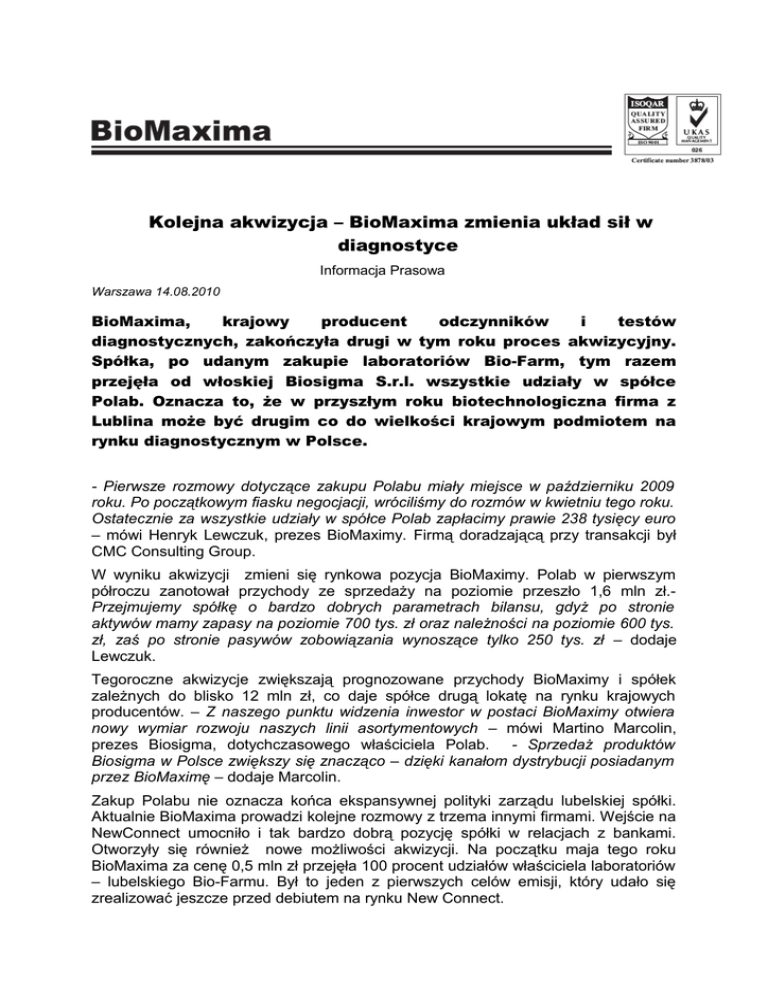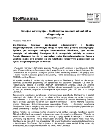 Kolejna akwizycja – BioMaxima zmienia układ sił w diagnostyce Informacja Prasowa Warszawa 14.08.2010 BioMaxima, krajowy producent odczynników i testów diagnostycznych, zakończyła drugi w tym roku proces akwizycyjny. Spółka, po udanym zakupie laboratoriów Bio-Farm, tym razem przejęła od włoskiej Biosigma S.r.l. wszystkie udziały w spółce Polab. Oznacza to, że w przyszłym roku biotechnologiczna firma z Lublina może być drugim co do wielkości krajowym podmiotem na rynku diagnostycznym w Polsce. - Pierwsze rozmowy dotyczące zakupu Polabu miały miejsce w październiku 2009 roku. Po początkowym fiasku negocjacji, wróciliśmy do rozmów w kwietniu tego roku. Ostatecznie za wszystkie udziały w spółce Polab zapłacimy prawie 238 tysięcy euro – mówi Henryk Lewczuk, prezes BioMaximy. Firmą doradzającą przy transakcji był CMC Consulting Group. W wyniku akwizycji zmieni się rynkowa pozycja BioMaximy. Polab w pierwszym półroczu zanotował przychody ze sprzedaży na poziomie przeszło 1,6 mln zł.Przejmujemy spółkę o bardzo dobrych parametrach bilansu, gdyż po stronie aktywów mamy zapasy na poziomie 700 tys. zł oraz należności na poziomie 600 tys. zł, zaś po stronie pasywów zobowiązania wynoszące tylko 250 tys. zł – dodaje Lewczuk. Tegoroczne akwizycje zwiększają prognozowane przychody BioMaximy i spółek zależnych do blisko 12 mln zł, co daje spółce drugą lokatę na rynku krajowych producentów. – Z naszego punktu widzenia inwestor w postaci BioMaximy otwiera nowy wymiar rozwoju naszych linii asortymentowych – mówi Martino Marcolin, prezes Biosigma, dotychczasowego właściciela Polab. - Sprzedaż produktów Biosigma w Polsce zwiększy się znacząco – dzięki kanałom dystrybucji posiadanym przez BioMaximę – dodaje Marcolin. Zakup Polabu nie oznacza końca ekspansywnej polityki zarządu lubelskiej spółki. Aktualnie BioMaxima prowadzi kolejne rozmowy z trzema innymi firmami. Wejście na NewConnect umocniło i tak bardzo dobrą pozycję spółki w relacjach z bankami. Otworzyły się również nowe możliwości akwizycji. Na początku maja tego roku BioMaxima za cenę 0,5 mln zł przejęła 100 procent udziałów właściciela laboratoriów – lubelskiego Bio-Farmu. Był to jeden z pierwszych celów emisji, który udało się zrealizować jeszcze przed debiutem na rynku New Connect. Polab jest dystrybutorem drobnego sprzętu, testów diagnostycznych, materiałów zużywalnych do aparatów dla laboratoriów medycznych, w tym przede wszystkim – produkowanych przez Biosigma. Z kolei ta włoska spółka jest wiodącym producentem biotechnologicznych materiałów dla laboratoriów i ośrodków badawczych. Produkty tej spółki znakomicie rozszerzają ofertę BioMaximy. O firmie: BioMaxima SA należy do grupy krajowych liderów w diagnostyce laboratoryjnej. Od czerwca 2010 roku notowana jest na NewConnect. W swoim portfolio posiada testy, odczynniki i urządzenia przeznaczone dla laboratoriów diagnostycznych służby zdrowia, szpitalnych oddziałów ratunkowych, gabinetów lekarskich, gabinetów weterynaryjnych. Współpracuje z prawie 2 tysiącami laboratoriów w całej Polsce, bezpośrednio i skutecznie konkurując m.in. z firmami takimi jak Siemens czy Roche. Na początku maja sfinalizowała zakup 100% udziałów w Bio-Farmie, właściciela laboratoriów w Lublinie i Rzeszowie oraz dystrybutora produktów amerykańskiej firmy Streck Inc. (największy światowy producent – 70% rynku – w zakresie kontroli hematologicznej i programów kontroli jakości badań hematologicznych), oraz węgierskiego Diatron (producenta odczynników i aparatów hematologicznych). Strategia BioMaximy przewiduje także uruchomienie produkcji własnych, szybkich testów diagnostycznych, które odnotowują roczny 10-procentowy wzrost w ujęciu globalnym. Do tej grupy należą testy ciążowe, testy na liczne choroby zakaźne, oraz testy wykrywające narkotyki, tym samym BioMaxima stanie się ich pierwszym producentem krajowym. W połowie maja firma pozyskała środki unijne na badania nad kolejnym produktem. Pieniądze, ponad 270 tys. zł zostaną przeznaczone na pracę nad szybkim testem immunochromatograficznym do wykrywania krwi utajonej. Całkowity koszt tej inwestycji to 400 tys. zł. Pod koniec ubiegłego roku spółka podpisała również umowę z największą siecią laboratoryjną w Polsce – Diagnostyką Kraków. W 2009 r. została wyłącznym dystrybutorem jedynego na świecie producenta gleukometrów szpitalnych – amerykańskiej firmy Nova Biomedical. Lubelska spółka współpracuje już z niemal 2 tys. laboratoriów na terenie Polski. Często na dostarczenie odczynników, analizatorów czy też testów diagnostycznych wygrywa z takimi międzynarodowymi koncernami jak Roche czy Simens. Spółka BioMaxima rozpoczęła także inwestycje we własne centrum badawczo – produkcyjne. Powstaje ono na terenie Specjalnej Strefy Ekonomicznej Mielec – Podstrefa Lublin. Stworzenie nowoczesnego zaplecza produkcyjnego jest jednym z ważniejszych punktów strategii rozwoju spółki. Siedziba firmy ma wynosić ok. 1 tys. m2. i powstanie na ponad półhektarowej działce. Całkowity koszt inwestycji ma wynieść 3,5 mln zł. Kontakt dla mediów - Biuro Prasowe BioMaxima SA: mobile: +48 609 110 082 [email protected] www.BioMaxima.com prowadzone przez CARDA Consultancy www.carda.pl