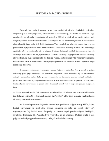 HISTORIA PAJĄCZKA ROBINA Pajączek był mały i czarny, a na jego malutkiej głowie, dokładnie pośrodku, znajdowały się dwie pary oczu, które uważnie obserwowały, co działo się dookoła. Jego odwłoczek był okrągły i sprężysty jak piłeczka. Nóżki, a miał ich w sumie osiem, były długie i pokryte cieniutkimi włoskami. Ze względu na ich nieproporcjonalną w stosunku do ciała długość, jego chód był dość niezdarny. Taki wygląd nie ułatwiał mu życia, a wręcz przeciwnie, był powodem wielu łez i smutków. Większość zwierząt w lesie albo bała się go spotkać, albo wyśmiewała się z niego. Dlatego Pajączek unikał towarzystwa innych zwierząt, a właściwie to one jego unikały. Czasami czuł się z tego powodu bardzo samotny, ale wiedział, że bycie samemu to nie koniec świata. Jest przecież tyle wspaniałych rzeczy, które można robić w samotności. Najlepszym sposobem na wszelkie smutki było dla niego rzeźbienie pajęczyn. Stworzenie pajęczyny wymagało czasu. Najpierw potrzebny był pomysł, a potem dokładny plan jego realizacji. W pracowni Pajączka, która mieściła się w opuszczonej dziupli raniuszka, pełno było porozwieszanych na ścianach czarno-białych szkiców i projektów. Niektóre wymagały dokończenia, a inne zaledwie kilku poprawek. Wisiały tam także zdjęcia powycinane z gazet, które Pajączek znajdował w najróżniejszych miejscach lasu. — Co za wstrętni ludzie! Jak można tak zaśmiecać las!? Ciekawe, czy sami chcieliby mieć taki bałagan u siebie!? — krzyczał czasami tak ”głośno” jakby jego sprzeciw mieli usłyszeć ci, którzy te śmieci tam zostawili. Na ścianach pracowni Pajączka można było podziwiać zdjęcie wieży Eiffla, której kształt przywodził na myśl dwa drzewa splecione ze sobą na kształt litery „a”, majestatyczny Taj Mahal oraz fotografię w kolorze sepii przedstawiającą buddyjską świątynię. Inspiracją dla Pajączka było wszystko, co go otaczało. Dlatego wiele z jego pajęczych dzieł przypominało drzewa, kwiaty, kamienie lub chmury. Większość zwierząt nie mogła się nadziwić, komu też przyszło do głowy budować pajęczyny w tak dziwnych kształtach. Pewnego letniego dnia postanowiono zwołać zgromadzenie i naradzić się w sprawie tych nietypowych ,,budowli”. Spotkanie miało się rozpocząć przed zachodem słońca, na polanie nieopodal starego dębu. O umówionej porze na leśnej łące zrobiło się tłoczno. W powietrzu mieszało się ze sobą wiele języków i dialektów. Na środku łąki stał kamień, a na nim leżał zwinięty w kłębek Wąż, którego przezywano Wielki, choć był w rzeczywistości bardzo małym jegomościem. Większość zwierząt bała się jego kąśliwego języka i prawie każdy mu przytakiwał. Nikt nie chciał być przecież opisany w gazecie jako osobnik, który nie podziela zdania reszty. Wiadomo, że taka zła opinia mogła się ciągnąc latami, komplikując albo wręcz uniemożliwiając normalne życie. Obok Węża Wielkiego przykucnęła Żaba Ala, która ze względu na swój wiek i przypisywaną jej z tego powodu mądrość, cieszyła się największym szacunkiem wśród zwierząt. Właśnie miało się rozpocząć zebranie. Wśród leśnej gawiedzi czuć było zniecierpliwienie. Przemowę rozpoczął Wąż Wielki. Najpierw chrząknął znacząco, aby uciszyć tych, co jeszcze mieli czelność rozmawiać, a potem wyprostował się dumnie i z minom sędziego powiedział: — Ten pająk, co te dziwactwa wybudował, to pewnie jakiś wariat albo niespełniony artysta, albo coś jeszcze gorszego. — Ma rację Wąż Wielki — słychać było głosy poparcia ze strony licznej rodziny królików i ich krewnych. — Tak, tak, ma Pan rację — dodała przytakująco i niepewnie Mucha Si, która za wszelką cenę starała się przypodobać Wężowi Wielkiemu. Jednak w hałaśliwym toku rozmów prawie nikt nie usłyszał jej cichego głosu. — Trzeba pozbyć się tego badziewia — powiedziała stanowczo Żaba Ala. — Racja! Żaba jak zwykle ma rację — swoim piskliwym głosem wtrącił Much Pi, który od długiego czasu pełnił funkcję jej prawej ręki, a także rolę szpiega. — Zabierajmy się jak najszybciej za usunięcie tego szkaradztwa. Nie chcemy przecież trzymać takich śmieci w swoim lesie! — powiedziały mrówki, a głosik każdej z nich brzmiał tak samo i zamieniał się w jeden potężnie brzmiący głos. — Uspokójcie się! Czy wyście wszyscy powariowali? Będziemy się zajmować niszczeniem pajęczyn, kiedy w lesie dzieją się poważniejsze sprawy? Każdego dnia nasz świat się kurczy. Ilu z nas straciło już wszystko? Ilu z nas nie ma dachu nad głową? — zapytał grubym głosem Żuk Mateusz, który znany był w całej okolicy ze względu na swoją tężyznę fizyczną. Wiadomo było, że jedną ręką potrafił przenieść sporej wielkości kamień. — No proszę, kto będzie nas pouczać! Żuk, który całe dnie zajmuje się fizyczną pracą, żadnej szkoły nie skończył, a teraz chce uczyć mądrzejszych! – zaatakowała Mateusza wszechwiedząca Żaba. — No właśnie, osiłku, może byś tak do szkoły poszedł, abyś mógł się z nami dzielić swoją mądrością!— dodał złośliwie Much Pi. — Poćwicz najpierw swój umysł, bo widać, że dotychczas zajmowałeś się tylko swoimi mięśniami! — wyśmiewały się z niego czerwone mrówki. — Wielki jak dąb, głupi jak głąb— wykrzyczał ktoś z mieszkańców lasu. Ten, kto miał odwagę obrażać innych, a sam był zbyt tchórzliwy, aby pokazać swoją twarz. Choć Jaszczurek Kurek miał nadzieję, że jego wypowiedź pozostanie anonimowa, to się pomylił. W lesie przecież wszyscy się znali. — Dobrze mówi ten nasz Kurek! — powiedział Wąż Wielki. Słowa Węża mile połechtały Kurka, który poczuł się teraz o kilkanaście centymetrów wyższy i zarazem mądrzejszy. Poczuł, że jest naprawdę „kim