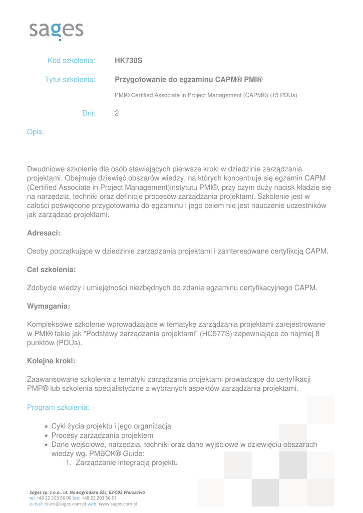 Kod szkolenia: Tytuł szkolenia: HK730S Przygotowanie do egzaminu CAPM® PMI® PMI® Certified Associate in Project Management (CAPM®) (15 PDUs) Dni: 2 Opis: Dwudniowe szkolenie dla osób stawiających pierwsze kroki w dziedzinie zarządzania projektami. Obejmuje dziewięć obszarów wiedzy, na których koncentruje się egzamin CAPM (Certified Associate in Project Management)instytutu PMI®, przy czym duży nacisk kładzie się na narzędzia, techniki oraz definicje procesów zarządzania projektami. Szkolenie jest w całości poświęcone przygotowaniu do egzaminu i jego celem nie jest nauczenie uczestników jak zarządzać projektami. Adresaci: Osoby początkujące w dziedzinie zarządzania projektami i zainteresowane certyfikcją CAPM. Cel szkolenia: Zdobycie wiedzy i umiejętności niezbędnych do zdania egzaminu certyfikacyjnego CAPM. Wymagania: Kompleksowe szkolenie wprowadzające w tematykę zarządzania projektami zarejestrowane w PMI® takie jak "Podstawy zarządzania projektami" (HC577S) zapewniające co najmiej 8 punktów (PDUs). Kolejne kroki: Zaawansowane szkolenia z tematyki zarządzania projektami prowadzące do certyfikacji PMP® lub szkolenia specjalistyczne z wybranych aspektów zarządzania projektami. Program szkolenia: Cykl życia projektu i jego organizacja Procesy zarządzania projektem Dane wejściowe, narzędzia, techniki oraz dane wyjściowe w dziewięciu obszarach wiedzy wg. PMBOK® Guide: 1. Zarządzanie integracją projektu 2. Zarządzanie zakresem projektu 3. Zarządzanie czasem projektu 4. Zarządzanie kosztami projektu 5. Zarządzanie jakością projektu 6. Zarządzanie zasobami ludzkimi w projekcie 7. Zarządzanie komunikacją w projektcie 8. Zarządzanie ryzykiem projektu 9. Zarządzanie dostawami w projekcie Pytania egzaminacyjne - ćwiczenia Powered by TCPDF (www.tcpdf.org)