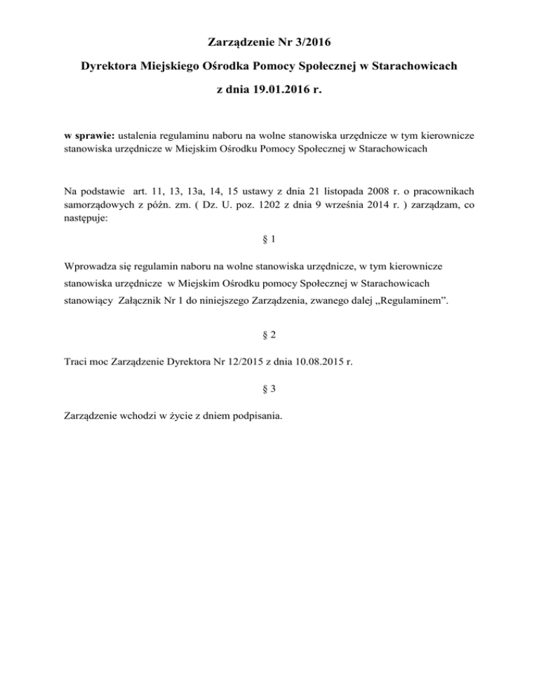 Zarządzenie Nr 3/2016 Dyrektora Miejskiego Ośrodka Pomocy Społecznej w Starachowicach z dnia 19.01.2016 r. w sprawie: ustalenia regulaminu naboru na wolne stanowiska urzędnicze w tym kierownicze stanowiska urzędnicze w Miejskim Ośrodku Pomocy Społecznej w Starachowicach Na podstawie art. 11, 13, 13a, 14, 15 ustawy z dnia 21 listopada 2008 r. o pracownikach samorządowych z późn. zm. ( Dz. U. poz. 1202 z dnia 9 września 2014 r. ) zarządzam, co następuje: §1 Wprowadza się regulamin naboru na wolne stanowiska urzędnicze, w tym kierownicze stanowiska urzędnicze w Miejskim Ośrodku pomocy Społecznej w Starachowicach stanowiący Załącznik Nr 1 do niniejszego Zarządzenia, zwanego dalej „Regulaminem”. §2 Traci moc Zarządzenie Dyrektora Nr 12/2015 z dnia 10.08.2015 r. §3 Zarządzenie wchodzi w życie z dniem podpisania. Załącznik Nr 1 do Zarządzenia Nr 3/2016 Dyrektora Miejskiego Ośrodka Pomocy Społecznej w Starachowicach z dnia 19.01.2016 r. REGULAMIN NABORU NA WOLNE STANOWISKA URZĘDNICZE W TYM KIEROWNICZE STANOWISKA URZĘDNICZE W MIEJSKIM OŚRODKU POMOCY SPOŁECZNEJ W STARACHOWICACH Rozdział I Postanowienie ogólne 1. Celem regulaminu jest ustalenie zasad zatrudnienia na stanowiska urzędnicze w oparciu o otwarty i konkurencyjny nabór na wolne stanowiska pracy. 2. Regulamin określa szczegółowe zasady zatrudniania pracowników MOPS w Starachowicach na podstawie umowy o pracę, z wyłączeniem stanowisk pomocniczych. 3. Postanowień niniejszego regulaminu nie stosuje się w przypadku: a) przeniesienia pracownika na inne stanowisko urzędnicze w MOPS w Starachowicach lub zmian organizacyjnych oraz awansu wewnętrznego; b) przeniesienia pracownika samorządowego zatrudnionego w innej jednostce organizacyjnej na podstawie porozumienia pracodawców; c) zatrudnienia pracownika na czas usprawiedliwionej nieobecności urzędnika w pracy. Rozdział II Podjęcie decyzji o rozpoczęciu procedury rekrutacyjnej na wolne stanowiska urzędnicze §1 1. Decyzję o rozpoczęciu procedury rekrutacyjnej podejmuje Dyrektor MOPS z własnej inicjatywy lub w oparciu o informacje przekazane przez kierownika komórki organizacyjnej ( działu, referatu) o wakującym stanowisku. 2. Informacja, o której mowa w pkt. 1 powinna być przekazana w formie pisemnej z miesięcznym wyprzedzeniem, pozwalającym na uniknięcie zakłóceń w funkcjonowaniu danej komórki organizacyjnej. 3. Kierownik komórki organizacyjnej zobligowany jest do przedłożenia do akceptacji Dyrektorowi MOPS wniosku o przyjęcie nowego pracownika z opisem stanowiska na wakujące miejsce pracy. 4. Opis stanowiska pracy, o którym mowa w pkt. 3 powinien zawierać: a) dokładne określenie celów i zadań wykonywanych na danym stanowisku pracy oraz obowiązków wynikających z tego tytułu; b) określenie szczegółowych wymagań w zakresie kwalifikacji, umiejętności i predyspozycji wobec osób, które je zajmują; c) określenie uprawnień służących do wykonywania zadań oraz niezbędnego wyposażenia; d) określenie odpowiedzialności; e) inne wyznaczniki określające indywidualny charakter danego stanowiska pracy. 5. Podstawę rozpoczęcia procedury naboru kandydatów na wolne stanowisko urzędnicze stanowi wniosek zaakceptowany przez Dyrektora MOPS w Starachowicach. Rozdział III Powołanie Komisji Rekrutacyjnej §2 1. Komisja Rekrutacyjna, zwana dalej „Komisją” powoływana jest każdorazowo Zarządzeniem Dyrektora MOPS w Starachowicach i składa się z 3-5 członków. 2. Zadaniem Komisji jest przeprowadzenie naboru na wolne stanowisko pracy. 3. Komisja działa do czasu zakończenia procedury naboru. Rozdział IV Etapy naboru §3 1. Ogłoszenie o naborze na wolne stanowisko urzędnicze. 2. Składanie dokumentów aplikacyjnych. 3. Wstępna selekcja kandydatów – analiza dokumentów aplikacyjnych. 4. Ogłoszenie listy kandydatów, którzy spełniają wymagania formalne. 5. Selekcja końcowa kandydatów – pisemny test i rozmowa kwalifikacyjna lub rozmowa kwalifikacyjna. 6. Sporządzenie protokołu z przeprowadzonego naboru na dane stanowisko urzędnicze. 7. Podjęcie decyzji o zatrudnieniu i podpisanie umowy o pracę. 8. Ogłoszenie wyników naboru. Rozdział V Ogłoszenie o naborze na wolne stanowisko urzędnicze §4 1. Ogłoszenie o wolnym stanowisku urzędniczym umieszcza się obligatoryjnie w Biuletynie Informacji Publicznej oraz na tablicy informacyjnej w siedzibie MOPS w Starachowicach. 2. Ogłoszenie o naborze na wolne stanowisko zawiera: a) nazwę i adres jednostki; b) określenie stanowiska urzędniczego oraz nazwę komórki organizacyjnej; c) datę ogłoszenia naboru; d) ilość wolnych etatów; e) określenie wymagań związanych ze stanowiskiem urzędniczym zgodnie z opisem stanowiska, ze wskazaniem, które z nich są konieczne (obligatoryjne), a które dodatkowe (pożądane); f) wskazania zakresu zadań wykonywanych na stanowisku urzędniczym; g) informacje o warunkach pracy na danym stanowisku; h) informacje o wymaganych dokumentach; i) określenie terminu i miejsca składania dokumentów; j) informacje dodatkowe i uwagi, k) informację, czy w miesiącu poprzedzającym datę upublicznienia ogłoszenia wskaźnik zatrudnienia osób niepełnosprawnych w jednostce, w rozumieniu przepisów o rehabilitacji zawodowej i społecznej oraz zatrudnianiu osób niepełnosprawnych, wynosi co najmniej 6%. 3. Ogłoszenie powinno się znajdować na stronie BIP oraz na tablicy ogłoszeń przez okres 10 dni kalendarzowych od dnia opublikowania tego ogłoszenia. 4. Wzór ogłoszenia stanowi Załącznik Nr 1 do niniejszego Regulaminu. Rozdział VI Przyjmowanie dokumentów aplikacyjnych §5 1. Na dokumenty aplikacyjne składają się : a) list motywacyjny; b) życiorys – curriculum vitae; c) kserokopie dyplomów potwierdzających wykształcenie; d) kserokopie dokumentów potwierdzających wymagany staż pracy; e) kserokopie zaświadczeń o ukończonych kursach, szkoleniach. 2. Szczegółowy wykaz wymaganych doku