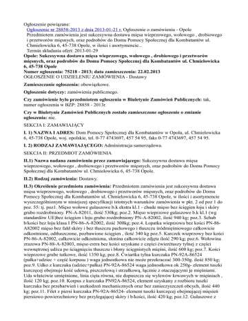 Ogłoszenie powiązane: Ogłoszenie nr 28858-2013 z dnia 2013-01-21 r. Ogłoszenie o zamówieniu - Opole Przedmiotem zamówienia jest sukcesywna dostawa mięsa wieprzowego, wołowego , drobiowego i przetworów mięsnych, oraz podrobów do Domu Pomocy Społecznej dla Kombatantów ul. Chmielowicka 6, 45-738 Opole, w ilości i asortymencie... Termin składania ofert: 2013-01-29 Opole: Sukcesywna dostawa mięsa wieprzowego, wołowego , drobiowego i przetworów mięsnych, oraz podrobów do Domu Pomocy Społecznej dla Kombatantów ul. Chmielowicka 6, 45-738 Opole Numer ogłoszenia: 75218 - 2013; data zamieszczenia: 22.02.2013 OGŁOSZENIE O UDZIELENIU ZAMÓWIENIA - Dostawy Zamieszczanie ogłoszenia: obowiązkowe. Ogłoszenie dotyczy: zamówienia publicznego. Czy zamówienie było przedmiotem ogłoszenia w Biuletynie Zamówień Publicznych: tak, numer ogłoszenia w BZP: 28858 - 2013r. Czy w Biuletynie Zamówień Publicznych zostało zamieszczone ogłoszenie o zmianie ogłoszenia: nie. SEKCJA I: ZAMAWIAJĄCY I. 1) NAZWA I ADRES: Dom Pomocy Społecznej dla Kombatantów w Opolu, ul. Chmielowicka 6, 45-738 Opole, woj. opolskie, tel. 0-77 4743697, 457 54 95, faks 0-77 4743697, 457 54 95. I. 2) RODZAJ ZAMAWIAJĄCEGO: Administracja samorządowa. SEKCJA II: PRZEDMIOT ZAMÓWIENIA II.1) Nazwa nadana zamówieniu przez zamawiającego: Sukcesywna dostawa mięsa wieprzowego, wołowego , drobiowego i przetworów mięsnych, oraz podrobów do Domu Pomocy Społecznej dla Kombatantów ul. Chmielowicka 6, 45-738 Opole. II.2) Rodzaj zamówienia: Dostawy. II.3) Określenie przedmiotu zamówienia: Przedmiotem zamówienia jest sukcesywna dostawa mięsa wieprzowego, wołowego , drobiowego i przetworów mięsnych, oraz podrobów do Domu Pomocy Społecznej dla Kombatantów ul. Chmielowicka 6, 45-738 Opole, w ilości i asortymencie wyszczególnionym w niniejszej specyfikacji istotnych warunków zamówienia w pkt. 2 od poz 1 do poz. 55: tj. poz1. Mięso wołowe gulaszowe b.k ekstra kl.1 - chude mięso bez ścięgien łoju i skóry grubo rozdrobniony. PN-A-82011, ilość 530kg; poz.2. Mięso wieprzowe gulaszowe b.k kl.1 (wg standardów UE)bez ścięgien i łoju grubo rozdrobniony PN-A-82002, ilość 940 kg; poz.3. Schab b/kości bez łoju klasa I PN-86-A-82002, ilość 300kg; poz.4. Łopatka wieprzowa bez kości PN-86A82002 mięso bez fałd skóry i bez tłuszczu pachowego i tłuszczu śródmięśniowego całkowicie odkostnione, odtłuszczone, pozbawione ścięgien , ilość 340 kg poz.5. Karczek wieprzowy bez kości PN-86-A-82002, całkowicie odkostniona, słonina całkowicie zdjęta ilość 290 kg; poz.6. Wołowina zrazowa PN-88-A-82003, mięso extra bez kości uzyskane z części ćwierćtuszy tylnej z części wewnętrznej udźca po ściągnięciu tłuszczu i błony ścięgnistych mięśni, ilość 600 kg; poz.7. Kości wieprzowe grube tutkowe, ilość 1350 kg; poz.8. Ćwiartka tylna kurczaka PN-92A-86524 (pałka+udziec + część korpusu ) waga jednostkowa nie może przekraczać 300-350g. ilość 850 kg; poz.9. Udko z kurczaka (udziec+pałka) PN-92A-86524 waga jednostkowa ok 250g- element tuszki kurczęcej obejmuje kość udową, piszczelową i strzałkową, łącznie z otaczającymi je mięśniami. Uda właściwie umięśnione, linia cięta równa, nie dopuszcza się wylewów krwawych w mięśniach , ilość 120 kg; poz.10. Korpus z kurczaka PN92A-86524, element uzyskany z rozbioru tuszki kurczaka bez przebarwień i uszkodzeń mechanicznych oraz bez zanieczyszczeń obcych, ilość 440 kg; poz.11. Filet z piersi kurczaka PN-92A-86524- element tuszki kurczęcej obejmującej mięsień piersiowo powierzchniowy bez przylegającej skóry i b/kości, ilość 420 kg; poz.12. Gulaszowe z indyka PN-92A-86522 mięśnie piersi pozbawione skóry, kości i ścięgien, prawidłowo wykrwawione bez przebarwień i uszkodzeń mechanicznych oraz bez zanieczyszczeń obcych. ilość 260 kg ; poz.13. Filet z indyka PN-92A/86522 , mięśnie piersiowe pozbawione skóry, kości i ścięgien, prawidłowo wykrwawione, bez przebarwień i uszkodzeń mechanicznych oraz bez zanieczyszczeń obcych ilość 60 kg; poz.14. Boczek świeży- surowy łuskany bez skóry i bez kości PN-A-82007;1996 nie mrożony spełniający wymagania normy, ilość 30 kg poz.15. Słonina bez skóry świeża surowa PN-86A-82002 nie mrożona, słonina podskórna tkanka tłuszczowa zdjęta z grzbietu tylnej części tułowia( w tym z szynki) i boków świni( w tym łopatki) bez skóry w formie płatów. Płat słoniny nie mniej niż 0,50kg. ilość 240 kg; poz.16. Wątróbka drobiowa PN-92A86521-wątroba z kurczaka uzyskana z tuszki kurczęcej w postaci podwójnych lub pojedynczych płatów i pozbawiona części niejadalnych- bez woreczka żółciowego i zanieczyszczeń, dopuszcza się pojedyncze części płatów o wielkości mniejszej niż połowa płata, barwa beżowa do brunatnowiśniowej charakterystyczna dla wątroby świeżej, ilość 185 kg; poz.17. Żołądki z kurcząt świeże PN-92A-86521 z usuniętą treścią, oraz warstwą zrogowaciałą z odciętym tuż przy mięśniu żołądkiem gruczołowym i dwunastnicą nadmiar tłuszczu usunięty, dopuszcza się niewielkie uszkodzenia mięśnia, oraz pozostałości tkanki łącznej, barwa jasnoczerwona do ciemnoczerwonej, niedopuszczalna zielonkawa barwa, ilość 60 kg; poz.18. Boczek wędzony wieprzowy bez kości PNA82007;1996-łuskany parzony, bez widocznych złogów solanki skład: surowe mięso wędzone 8092% parzone spełniające normę tłuszczu dla boczku bez żeberek. Boczek wędzony bez żeberekwędzonka z boczku wieprzowego ze skórą. Wybór peklowany, wędzony, chłodzony powietrzem. Tłuszcz przerośnięty warstwami mięsa produkt dość soczysty. Niedopuszczalne szarozielone plamy świadczące o niedopeklowaniu i żółta barwa tłuszczu. Smak w miarę słony. Wędzenie wyczuwalne. ilość 275 kg; poz.19. Baleron gotowany- wieprzowy PN-A-82007:1996- wędzonka parzona wysokowydajna. Skład: mięso wieprzowe70