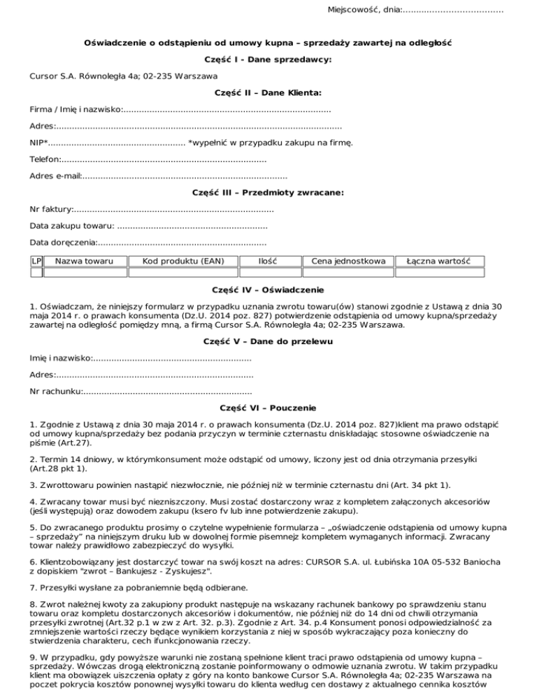 Miejscowość, dnia:….......……………………… Oświadczenie o odstąpieniu od umowy kupna – sprzedaży zawartej na odległość Część I - Dane sprzedawcy: Cursor S.A. Równoległa 4a; 02-235 Warszawa Część II – Dane Klienta: Firma / Imię i nazwisko:................................................................................ Adres:.............................................................................................................. NIP*..................................................... *wypełnić w przypadku zakupu na firmę. Telefon:............................................................................... Adres e-mail:............................................................................... Część III – Przedmioty zwracane: Nr faktury:............................................................................. Data zakupu towaru: .......................................................... Data doręczenia:................................................................. LP Nazwa towaru Kod produktu (EAN) Ilość Cena jednostkowa Łączna wartość Część IV – Oświadczenie 1. Oświadczam, że niniejszy formularz w przypadku uznania zwrotu towaru(ów) stanowi zgodnie z Ustawą z dnia 30 maja 2014 r. o prawach konsumenta (Dz.U. 2014 poz. 827) potwierdzenie odstąpienia od umowy kupna/sprzedaży zawartej na odległość pomiędzy mną, a firmą Cursor S.A. Równoległa 4a; 02-235 Warszawa. Część V – Dane do przelewu Imię i nazwisko:............................................................. Adres:............................................................................ Nr rachunku:................................................................. Część VI – Pouczenie 1. Zgodnie z Ustawą z dnia 30 maja 2014 r. o prawach konsumenta (Dz.U. 2014 poz. 827)klient ma prawo odstąpić od umowy kupna/sprzedaży bez podania przyczyn w terminie czternastu dniskładając stosowne oświadczenie na piśmie (Art.27). 2. Termin 14 dniowy, w którymkonsument może odstąpić od umowy, liczony jest od dnia otrzymania przesyłki (Art.28 pkt 1). 3. Zwrottowaru powinien nastąpić niezwłocznie, nie później niż w terminie czternastu dni (Art. 34 pkt 1). 4. Zwracany towar musi być niezniszczony. Musi zostać dostarczony wraz z kompletem załączonych akcesoriów (jeśli występują) oraz dowodem zakupu (ksero fv lub inne potwierdzenie zakupu). 5. Do zwracanego produktu prosimy o czytelne wypełnienie formularza – „oświadczenie odstąpienia od umowy kupna – sprzedaży” na niniejszym druku lub w dowolnej formie pisemnejz kompletem wymaganych informacji. Zwracany towar należy prawidłowo zabezpieczyć do wysyłki. 6. Klientzobowiązany jest dostarczyć towar na swój koszt na adres: CURSOR S.A. ul. Łubińska 10A 05-532 Baniocha z dopiskiem "zwrot – Bankujesz - Zyskujesz". 7. Przesyłki wysłane za pobraniemnie będą odbierane. 8. Zwrot należnej kwoty za zakupiony produkt następuje na wskazany rachunek bankowy po sprawdzeniu stanu towaru oraz kompletu dostarczonych akcesoriów i dokumentów, nie później niż do 14 dni od chwili otrzymania przesyłki zwrotnej (Art.32 p.1 w zw z Art. 32. p.3). Zgodnie z Art. 34. p.4 Konsument ponosi odpowiedzialność za zmniejszenie wartości rzeczy będące wynikiem korzystania z niej w sposób wykraczający poza konieczny do stwierdzenia charakteru, cech ifunkcjonowania rzeczy. 9. W przypadku, gdy powyższe warunki nie zostaną spełnione klient traci prawo odstąpienia od umowy kupna – sprzedaży. Wówczas drogą elektroniczną zostanie poinformowany o odmowie uznania zwrotu. W takim przypadku klient ma obowiązek uiszczenia opłaty z góry na konto bankowe Cursor S.A. Równoległa 4a; 02-235 Warszawa na poczet pokrycia kosztów ponownej wysyłki towaru do klienta według cen dostawy z aktualnego cennika kosztów wysyłki sprzedawcy. 10. Wypełnienie powyższego formularza z danymi klienta jest równoznaczne ze zgodą na ich przechowywanie i przetwarzanie do celów związanych z realizacją zwrotu, wymiany lub gwarancji przez sprzedawcę. Dane osobowe są przechowywane zgodnie z ustawą z 29.08.1997 o ochronie danych osobowych (Dz.U. z 1997,nr 133,poz. 883 z późn.zm.). 11. W sprawach nieuregulowanych powyższym dokumentem stosuje się odpowiednie przepisy Kodeksu Cywilnego oraz Ustawy z dnia 30 maja 2014 r. o prawach konsumenta (Dz.U. 2014 poz. 827). 12. Sądem właściwym dla rozpatrywania sporów wynikających z umowy jest sąd właściwy dla miejsca siedziby sprzedawcy Cursor S.A. Równoległa 4a ; 02-235 Warszawa. 13. Klient oświadcza, że zapoznał się z powyższymi warunkami i w pełni je akceptuje oraz że wszystkie dane podane w formularzu są poprawne i zgodne z prawdą. Pieczątka firmowa (jeśli zakup był na Firmę) ............................................................................... Czytelny podpis ....................................