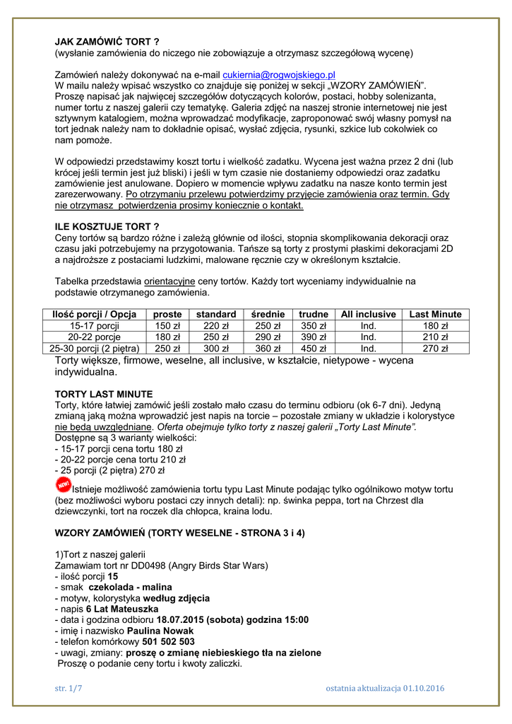 JAK ZAMÓWIĆ TORT ? (wysłanie zamówienia do niczego nie zobowiązuje a otrzymasz szczegółową wycenę) Zamówień należy dokonywać na e-mail [email protected] W mailu należy wpisać wszystko co znajduje się poniżej w sekcji „WZORY ZAMÓWIEŃ”. Proszę napisać jak najwięcej szczegółów dotyczących kolorów, postaci, hobby solenizanta, numer tortu z naszej galerii czy tematykę. Galeria zdjęć na naszej stronie internetowej nie jest sztywnym katalogiem, można wprowadzać modyfikacje, zaproponować swój własny pomysł na tort jednak należy nam to dokładnie opisać, wysłać zdjęcia, rysunki, szkice lub cokolwiek co nam pomoże. W odpowiedzi przedstawimy koszt tortu i wielkość zadatku. Wycena jest ważna przez 2 dni (lub krócej jeśli termin jest już bliski) i jeśli w tym czasie nie dostaniemy odpowiedzi oraz zadatku zamówienie jest anulowane. Dopiero w momencie wpływu zadatku na nasze konto termin jest zarezerwowany. Po otrzymaniu przelewu potwierdzimy przyjęcie zamówienia oraz termin. Gdy nie otrzymasz potwierdzenia prosimy koniecznie o kontakt. ILE KOSZTUJE TORT ? Ceny tortów są bardzo różne i zależą głównie od ilości, stopnia skomplikowania dekoracji oraz czasu jaki potrzebujemy na przygotowania. Tańsze są torty z prostymi płaskimi dekoracjami 2D a najdroższe z postaciami ludzkimi, malowane ręcznie czy w określonym kształcie. Tabelka przedstawia orientacyjne ceny tortów. Każdy tort wyceniamy indywidualnie na podstawie otrzymanego zamówienia. Ilość porcji / Opcja 15-17 porcji 20-22 porcje 25-30 porcji (2 piętra) proste 150 zł 180 zł 250 zł standard 220 zł 250 zł 300 zł średnie 250 zł 290 zł 360 zł trudne 350 zł 390 zł 450 zł All inclusive Ind. Ind. Ind. Last Minute 180 zł 210 zł 270 zł Torty większe, firmowe, weselne, all inclusive, w kształcie, nietypowe - wycena indywidualna. TORTY LAST MINUTE Torty, które łatwiej zamówić jeśli zostało mało czasu do terminu odbioru (ok 6-7 dni). Jedyną zmianą jaką można wprowadzić jest napis na torcie – pozostałe zmiany w układzie i kolorystyce nie będą uwzględniane. Oferta obejmuje tylko torty z naszej galerii „Torty Last Minute”. Dostępne są 3 warianty wielkości: - 15-17 porcji cena tortu 180 zł - 20-22 porcje cena tortu 210 zł - 25 porcji (2 piętra) 270 zł Istnieje możliwość zamówienia tortu typu Last Minute podając tylko ogólnikowo motyw tortu (bez możliwości wyboru postaci czy innych detali): np. świnka peppa, tort na Chrzest dla dziewczynki, tort na roczek dla chłopca, kraina lodu. WZORY ZAMÓWIEŃ (TORTY WESELNE - STRONA 3 i 4) 1)Tort z naszej galerii Zamawiam tort nr DD0498 (Angry Birds Star Wars) - ilość porcji 15 - smak czekolada - malina - motyw, kolorystyka według zdjęcia - napis 6 Lat Mateuszka - data i godzina odbioru 18.07.2015 (sobota) godzina 15:00 - imię i nazwisko Paulina Nowak - telefon komórkowy 501 502 503 - uwagi, zmiany: proszę o zmianę niebieskiego tła na zielone Proszę o podanie ceny tortu i kwoty zaliczki. str. 1/7 ostatnia aktualizacja 01.10.2016 2) Tort wg Państwa pomysłu /projektu Zamawiam tort dla dwóch dziewczynek (Marta 3 i Lilka 7 ) - dziewczynki uwielbiają nowy film Disney ‘a "Kraina Lodu" - z dwiema siostrami Elsą, Anną, i bałwankiem Olafem - czy istnieje szansa, że stworzylibyście Państwo taką tortową krainę lodu? Załączam zdjęcia postaci oraz tortu, który mi się spodobał. - ilość porcji 15 - smak truskawkowy - motyw, kolorystyka według zdjęcia z załącznika - napis Marta 3 latka , Lilka 7 lat - data i godzina odbioru 18.07.2015 (sobota) godzina 15:00 - imię i nazwisko Paulina Nowak - telefon komórkowy 501 502 503 - uwagi, zmiany: zostawiam Wam wolną rękę w kompozycji dekoracji Proszę o wycenę tortu i podanie kwoty zaliczki. 3) Tort „all inclusive” Zamawiam tort dla córki na 18 urodziny i mam na ten cel przeznaczone ok 900-1000 zł. Córka lubi zakupy, modę i prowadzi bloga z tym związanego. Załączam zdjęcia córki, jej ulubionej torebki i butów. Chciałabym aby na torcie znalazła się figurka córki upodobniona do niej. - ilość porcji 40-50 - smak różne smaki zostawiam to państwu, córka lubi czekoladę i maliny - napis Marta 18 - data i godzina odbioru 18.07.2015 (sobota) godzina 16:00 - imię i nazwisko Paulina Nowak - telefon komórkowy 501 502 503 - uwagi, zmiany: zostawiam Wam wolną rękę w kompozycji dekoracji Proszę o wycenę tortu i podanie kwoty zaliczki. 4) Tort Last Minute (Oferta obejmuje tylko torty z naszej galerii „Torty Last Minute”) Zamawiam tort nr LM0032 (Angry Birds) - ilość porcji 15 - smak czekolada - malina - napis 6 Lat Gracjanka - data i godzina odbioru 18.07.2015 (sobota) godzina 15:00 - imię i nazwisko Paulina Nowak - telefon komórkowy 501 502 503 Proszę o podanie ceny tortu i kwoty zaliczki. Orientacyjne rozmiary okrągłych tortów z dekoracją: (przyjmuje się ok 100g samego tortu bez dekoracji na 1 osobę): 10-12 porcji średnica 20 cm 15-17 porcji średnica 22 cm 20-22 porcje średnica 25 cm 25+ porcji tort 2 piętrowy Podane średnice mogą się zmienić ponieważ każdorazowo dostosowujemy je do ilości porcji i dekoracji. CZAS REALIZACJI Torty proszę zamawiać z 2-3 tygodniowym wyprzedzeniem (nie dotyczy tortów weselnych - te należy zamawiać z większym wyprzedzeniem). Da nam to odpowiednią ilość czasu na ustalenie szczegółów i staranne przygotowania. Gdy nasz kalendarz się wypełni nie jesteśmy w stanie przyjąć więcej zamówień i odmawiamy. str. 2/7 ostatnia aktualizacja 01.10.2016 SMAKI TORTÓW Śmietanowe (domyślne) - najbardziej popularne, puszysta masa z naturalnej bitej śmietany - biała czekolada + wiśnie - czekolada-malina (½ czekoladowy ½ malinowy) - czekolada + maliny - śmietankowy - biała czekolada + maliny - kawowy (na bazie świeżo mielonej kawy z palarni La Brasiliana® lub Maseta®) - malinowy - wiśniowy - czekolada - W-Z - czekolada-czarna porzeczka (½ czek