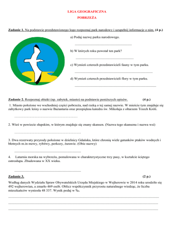 LIGA GEOGRAFICZNA POBRZEŻA Zadanie 1. Na podstawie przedstawionego logo rozpoznaj park narodowy i uzupełnij informacje o nim. (4 p.) a) Podaj nazwę parku narodowego. ................................................................. b) W których roku powstał ten park? .................................................................. c) Wymień czterech przedstawicieli fauny w tym parku. ......................................................................................... d) Wymień czterech przedstawicieli flory w tym parku. ............................................................................................. Zadanie 2. Rozpoznaj obiekt (np. zabytek, miasto) na podstawie poniższych opisów. (4 p.) 1. Miasto położone we wschodniej części pobrzeża, nad rzeką o tej samej nazwie. W mieście tym znajduje się zabytkowy park leśny o nazwie Bażantaria oraz przepiękna katedra św. Mikołaja z ołtarzem Trzech Króli. ……………………………………………… 2. Wieś w powiecie słupskim, w którym znajduje się znany skansen. (Nazwa tego skansenu i nazwa wsi) ………………………………………………… 3. Dwa rezerwaty przyrody położone w dzielnicy Gdańska, które chronią wiele gatunków ptaków wodnych i błotnych m.in mewy, rybitwy, perkozy, żurawie. (Obie nazwy) ............................................................................ 4. Latarnia morska na wybrzeżu, pomalowana w charakterystyczne trzy pasy, w kształcie ściętego ostrosłupa. Zbudowana w XX wieku. ............................................................................ Zadanie 3. (2 p.) Według danych Wydziału Spraw Obywatelskich Urzędu Miejskiego w Wejherowie w 2014 roku urodziło się 492 wejherowian, a zmarło 469 osób. Oblicz współczynnik przyrostu naturalnego wiedząc, że liczba mieszkańców wyniosła 48 337. Wynik podaj w ‰. ............................................................................................................................................................................ ........................................................................................................................................................................... ........................................................................................................................................................................... ............................................................................................................................................................................ Zadanie 4. Rozpoznaj miejsca przedstawione na poniższych zdjęciach. ….………………………………………… ….………………………………………… (4 p.) ….………………………………………… ….………………………………………… Zadanie 5. Znajdź ciekawostkę na temat wybranego miejsca, obiektu, zabytku leżącego w pasie pobrzeży. (1 p.) …………………………………………………………………………………………………………………… …………………………………………………………………………………………………………………… …………………………………………………………………………………………………………………… …………………………………………………………………………………………………………………… …………………………………………………………………………………………………………………… Zadanie 6. Na podstawie poniższej mapy wykonaj polecenia. (8 p.) a) Rozpoznaj zaznaczone obiekty geograficzne na poniższej mapie i wpisz ich nazwy. Lp. 1. 2. 3. 4. 5. 6. 7. 8. OBIEKT jezioro wyspa surowiec rzeka rzeka zalew nizina zatoka NAZWA Zadanie 7. Uzupełnij tekst charakteryzujący pas pobrzeży. W pasie pobrzeży wyróżniamy trzy regiony: Pobrzeże Szczecińskie, (10 p.) ............................................. i ................................................................ . Rzeźba terenu jest lekko falista o niedużych wysokościach ............................................................. . Najniżej położonym punktem w pasie pobrzeży jest miejscowość ............................................. Występują dwa typy wybrzeży: niskie, którego plaża jest ..................................................... i ............................................... oraz wybrzeże .........................................., które charakteryzuje się kamienistą i wąską plażą. Głównymi procesami kształtującymi powierzchnię wybrzeża jest erozyjna działalność morza, którą nazywamy ............................................ oraz działalność akumulacyjna, która tworzy m.in. .............................................. . Duże znaczenie ma również wiatr, którego efektem są .......................................... .