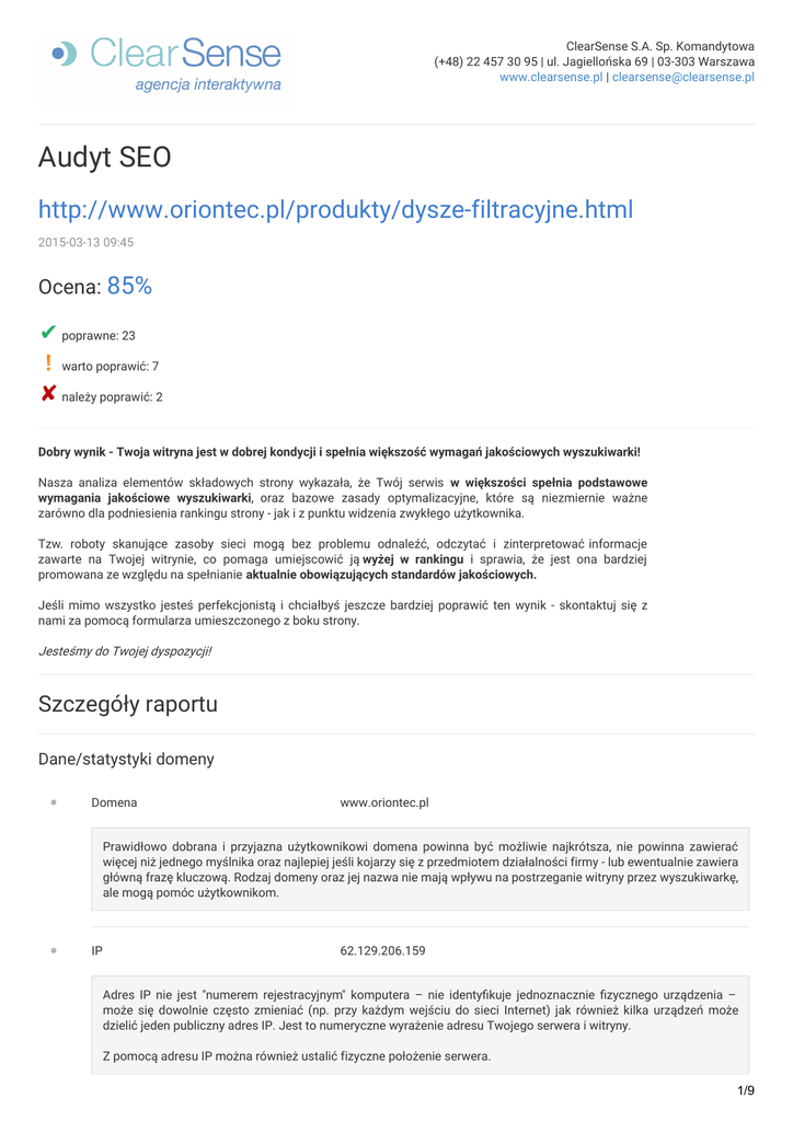 ClearSense S.A. Sp. Komandytowa (+48) 22 457 30 95 | ul. Jagiellońska 69 | 03-303 Warszawa www.clearsense.pl | [email protected] Audyt SEO http://www.oriontec.pl/produkty/dysze-filtracyjne.html 2015-03-13 09:45 Ocena: 85% ✔ poprawne: 23 ! warto poprawić: 7 ✘ należy poprawić: 2 Dobry wynik - Twoja witryna jest w dobrej kondycji i spełnia większość wymagań jakościowych wyszukiwarki! Nasza analiza elementów składowych strony wykazała, że Twój serwis w większości spełnia podstawowe wymagania jakościowe wyszukiwarki, oraz bazowe zasady optymalizacyjne, które są niezmiernie ważne zarówno dla podniesienia rankingu strony - jak i z punktu widzenia zwykłego użytkownika. Tzw. roboty skanujące zasoby sieci mogą bez problemu odnaleźć, odczytać i zinterpretować informacje zawarte na Twojej witrynie, co pomaga umiejscowić ją wyżej w rankingu i sprawia, że jest ona bardziej promowana ze względu na spełnianie aktualnie obowiązujących standardów jakościowych. Jeśli mimo wszystko jesteś perfekcjonistą i chciałbyś jeszcze bardziej poprawić ten wynik - skontaktuj się z nami za pomocą formularza umieszczonego z boku strony. Jesteśmy do Twojej dyspozycji! Szczegóły raportu Dane/statystyki domeny • Domena www.oriontec.pl Prawidłowo dobrana i przyjazna użytkownikowi domena powinna być możliwie najkrótsza, nie powinna zawierać więcej niż jednego myślnika oraz najlepiej jeśli kojarzy się z przedmiotem działalności firmy - lub ewentualnie zawiera główną frazę kluczową. Rodzaj domeny oraz jej nazwa nie mają wpływu na postrzeganie witryny przez wyszukiwarkę, ale mogą pomóc użytkownikom. • IP 62.129.206.159 Adres IP nie jest "numerem rejestracyjnym" komputera – nie identy kuje jednoznacznie zycznego urządzenia – może się dowolnie często zmieniać (np. przy każdym wejściu do sieci Internet) jak również kilka urządzeń może dzielić jeden publiczny adres IP. Jest to numeryczne wyrażenie adresu Twojego serwera i witryny. Z pomocą adresu IP można również ustalić fizyczne położenie serwera. 1/9 • Wiek domeny brak danych Wiek domeny jest istotnym parametrem określającym jej wartość, pod warunkiem, że jej historia jest dobra i nie była naznaczona działaniami spammerskimi lub problemami technicznymi. Dłuższa historia może oznaczać, że strona posiada wiele linków polecających. Jeśli była od początku pozycjonowana i optymalizowana konkurowanie z nią może być o wiele trudniejsze, niż ze stroną która ruszyła niedawno. • Geolokalizacja serwera Polska (PL) Jest to parametr czysto informacyjny. Geolokalizacja serwera jest jedynie ciekawostką i nie ma wpływu na SEO. Wiele współdzielonych, polskich hostingów ma wykupione serwery dedykowane za granicą. • Page Rank brak danych Page Rank to metoda nadawania indeksowanym stronom internetowym określonej wartości liczbowej, oznaczającej ich jakość oraz dobrą historię. Wyrażany jest w skali od 0 do 10. • Alexa Rank brak danych Alexa Rank to orientacyjny ranking najpopularniejszych witryn w internecie. Wartość, którą widzisz przy swojej domenie to umowne miejsce na światowej liście, które zajmuje Twoja witryna pod względem popularności. Ogólne parametry SEO istotne dla wyszukiwarki ✔ Widoczność/indeksowanie serwisu meta robots: ok - strona widoczna dla wyszukiwarki robots.txt: ok - strona widoczna dla wyszukiwarki Aby strona mogła pojawić się w wynikach wyszukiwania, niezbędna jest jej wcześniejsza indeksacja - czyli zapisanie w bazie wyszukiwarki danych o stronie internetowej. Domeny, które nie pozwalają na indeksowanie swojej zawartości zwyczajnie nie są brane pod uwagę w wynikach wyszukiwania. Zablokowane indeksowanie to całkowite wyeliminowanie witryny z gry! ! Liczba zaindeksowanych stron brak danych Liczba zaindeksowanych stron to nic innego, jak zakładki i podstrony Twojego serwisu, które odnalazła wyszukiwarka i zapisała w swoich zasobach. Serwisy o większej liczbie zaindeksowanych podstron mają większy potencjał, ze względu na szersze możliwości zamieszczania treści, zdjęć i linków. Jeśli zauważyłeś, że przy Twojej stronie wynik jest niski, mimo, iż posiadasz wiele zakładek - być może masz problemy z indeksowaniem własnych zasobów. Należy to poprawić! ✘ Przekierowanie WWW / bez WWW nie 2/9 Jeśli powyższe przekierowanie nie jest ustawione poprawnie, to www.strona.pl i strona.pl, w interpretacji wyszukiwarki, to dwie osobne domeny a zarazem kopie treści. Niepoprawne przekierowania znacząco wpływają na atrakcyjność Twojej witryny dla robotów Google. Jeśli Twoja domena www/bez www nie przekierowuje na jeden adres (do wyboru) - należy to koniecznie poprawić! ✘ Przekierowanie index.php / index.html index.php: nie index.html: nie Dokument Index.php lub Index.html to zazwyczaj nic innego jak strona główna serwisu, która znajduje się na domenie głównej i tam powinno przekierowywać zapytanie typu www.strona.pl/index.php. Jeśli tak się nie dzieje i możemy wywołać taki adres w przeglądarce, oznacza to, że mamy do czynienia z kopią treści oraz obniżeniem wartości serwisu w oczach wyszukiwarki. Taki błąd powinien zostać poprawiony w procesie optymalizacji. ✔ Długość adresu URL 54 Wyszukiwarka może wyświetlić ograniczoną liczbę znaków w adresach URL. Długość adresu wraz z rozszerzeniem nie powinna przekraczać 115 znaków. ✔ Określenie języka strony pl Zde niowanie języka, jakim posługuje się witryna jest istotne z punktu widzenia międzynarodowych wyszukiwań, planowania kampanii reklamowych na rynki zagraniczne oraz określania poprawności kodu strony. Każdorazowo powinien on być określony na samym początku budowy serwisu. ✔ Określenie rodzaju kodowania (np. UTF-8) utf-8 Kodowanie to zbiór znaków właściwych dla danego języka strony kodowej użytego w serwisie. Jeśli posłużono się znakami spoza palety znaków podstawowych