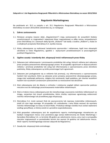 Załącznik nr 1 do Regulaminu Rozgrywek Piłkarskich o Mistrzostwo Ekstraklasy na sezon 2015/2016 Regulamin Marketingowy Na podstawie art. 35.5 w związku z art. 35.1 Regulaminu Rozgrywek Piłkarskich o Mistrzostwo Ekstraklasy na sezon 2015/2016 zatwierdza się, co następuje: 1. Zakres zastosowania 1.1. Niniejsze przepisy (zwane dalej „Regulaminem”) mają zastosowanie do wszystkich klubów uczestniczących w rozgrywkach najwyższej klasy rozgrywkowej w piłkę nożną, prowadzonych przez Ekstraklasę S.A. (zwanych dalej łącznie „Klubami” lub każdy z osobna „Klubem”), chyba że z odrębnych przepisów Ekstraklasy S.A. wynika inaczej. 1.2. Kluby zobowiązane są realizować świadczenia sponsorskie i reklamowe, bądź inne obowiązki określone w treści Regulaminu, zgodnie z wytycznymi przedstawionymi w poszczególnych punktach Regulaminu. 2. Ogólne zasady i standardy dot. ekspozycji treści reklamowych przez Kluby 2.1. Zakazane jest reklamowanie i promowanie produktów lub usług, których reklama jest zakazana przez przepisy powszechnie obowiązującego prawa. W przypadku ograniczeń w dopuszczalności reklamy i promocji produktów lub usług lub informowania o sponsorowaniu przez określone podmioty, Kluby zobowiązane są ściśle przestrzegać tych ograniczeń. 2.2. Zakazane jest posługiwanie się w reklamie lub promocji, czy informowaniu o sponsorowaniu hasłami lub rysunkami, które są zakazane przez przepisy powszechnie obowiązującego prawa, mogą mieć wydźwięk polityczny, religijny lub rasistowski, bądź podobny, jak również wszelkimi hasłami lub rysunkami uznawanymi powszechnie za niestosowne lub obraźliwe. 2.3. Klub zobowiązany jest do dbania o schludny i estetyczny wygląd reklam sponsorów podczas meczów oraz do należytego przechowywania materiałów reklamowych. 2.4. Klub w trakcie meczu zobowiązany jest do niezwłocznego czyszczenia nośników reklamowych ze śniegu, serpentyn lub innych przedmiotów, które choćby częściowo ograniczają widoczność nośnika reklamowego lub prawidłową jego ekspozycję. 2.5. Ekstraklasa S.A. może wezwać Klub do wyczyszczenia lub naprawy materiałów reklamowych, jeżeli ich stan tego wymaga. W przypadku ich uszkodzenia z winy Kluby wezwać do wymiany nośnika reklamowego na nowy na koszt Klubu. Produkcja takiego nośnika musi zostać wykonana według specyfikacji, w której został on uprzednio wyprodukowany. 2.6. Klub gospodarz zobowiązany jest do wypełnienia raportu marketingowego niezwłocznie po każdym rozegranym meczu oraz przesłania jego wersji elektronicznej do Działu Marketingu i Sprzedaży Ekstraklasy S.A. w terminie 48 godzin po zakończeniu meczu, przy czym w przypadku meczów rozgrywanych w poniedziałek termin ten wynosi 24 godziny od zakończenia meczu. Wzór raportu marketingowego stanowi załącznik do Regulaminu. 2.7. Zasady dot. ekspozycji koła centralnego: 1 a. przed meczem: koło powinno być eksponowane na 20 minut przed rozpoczęciem każdego z meczów – do momentu zakończenia prezentacji drużyn. W chwili witania się obu zespołów należy niezwłocznie zdjąć koło centralne z murawy. W momencie ustawienia się obydwu drużyn w tunelu, podający piłki zobowiązani są do falowania kołem centralnym trzymając je za specjalnie do tego celu przygotowane uchwyty; b. podczas przerwy: po zakończeniu pierwszej połowy (w momencie zejścia ostatniego piłkarza z murawy) do momentu wejścia pierwszych zawodników na murawę po przerwie. 3. Zasady dot. przestrzeni reklamowej wokół boiska 3.1. Zasady ogólne 3.1.1.Przestrzeń reklamowa wokół boiska obejmuje następujące elementy: a. b. c. d. e. f. g. h. i. j. k. l. m. n. tablica centralna bandy LED bandy statyczne koło centralne kubiki reklamowe pole reklamowe nad kołem centralnym reklamy 3D reklamy za bramką pole reklamowe na wyjście piłkarzy reklamy przy bramce bramę na wyjście piłkarzy stojak na piłkę reklamy przed pierwszą linią band reklamy przy strefie technicznej ławki 3.1.2. Bandy statyczne oraz LED powinny się znajdować minimum 4 metry od linii bocznych oraz 5 metrów od środka linii bramkowej. 3.1.3. Bandy statyczne oraz LED muszą być tak ustawione i skonstruowane, aby nie stwarzały zagrożenia dla żadnej z osób obecnych na stadionie, w szczególności nie utrudniały ewakuacji ze stadionu. 3.1.4. Bandy statyczne oraz LED muszą być skonstruowane z materiału nie zagrażającego zawodnikom oraz nie utrudniającego rozgrywania zawodów (np. przez zbyt intensywne odbijanie światła). 3.1.5. Bandy statyczne oraz LED powinny być proste bez zaokrągleń w żadną ze stron, a konstrukcja stelaży powinna umożliwiać eksponowanie tablic prostopadle do linii boiska. 3.1.6. Technologia łączeń segmentów band statycznych oraz LED powinna umożliwiać ich rozsuwanie w dowolnych miejscach. 2 3.2. Bandy statyczne Schemat rozmieszczenia ekspozycji reklamowych przy zastosowaniu band statycznych: Grafika nr 1: Wyjaśnienia do grafiki: powierzchnie będące w posiadaniu Klubu – oznaczone kolorem białym; powierzchnie będące w posiadaniu Sponsora Tytularnego Ekstraklasy – oznaczone kolorem czerwonym; powierzchnie będące w posiadaniu Sponsora Oficjalnego Ekstraklasy – oznaczone kolorem żółtym; powierzchnie będące w posiadaniu Ekstraklasy S.A. – zaznaczone kolorem niebieskim. 3.3. Bandy LED 3.3.1.Stosowanie band LED jest zalecane na wszystkich meczach w ramach Rozgrywek Ekstraklasy. 3.3.2. Łączna długość band LED powinna wynosić minimum 210 metrów. 3.3.3. Bandy LED nie mogą być niższe niż 0,8 metra i wyższe niż 1,1 metra. 3 Schemat rozmieszczenia ekspozycji reklamowych przy zastosowaniu band LED: Grafika nr 2: Wyjaśnienia do grafiki: powierzchnie będące w posiadaniu Klubu – oznaczone kolorem białym; powierzchnie będące w posiadaniu Sponsora Tytularnego Ekstraklasy – oznaczone kolorem czerwonym. Dodatkowo ekwiwalent czasowy w postaci 5 minut i 30 sekund na bandac