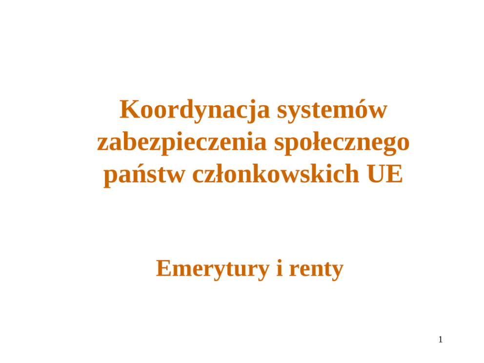 Koordynacja systemów zabezpieczenia społecznego państw członkowskich UE Emerytury i renty 1 Artykuł 48 (dawny artykuł 42 TWE) Parlament Europejski i Rada, stanowiąc zgodnie ze zwykłą procedurą prawodawczą, przyjmują w dziedzinie zabezpieczenia społecznego środki niezbędne do ustanowienia swobodnego przepływu pracowników; w tym celu Rada ustanawia system umożliwiający migrującym pracownikom najemnym i osobom prowadzącym działalność na własny rachunek oraz uprawnionym osobom od nich zależnym: a) zaliczenie wszystkich okresów uwzględnianych w prawie poszczególnych państw, w celu nabycia i zachowania prawa do świadczeń oraz naliczenia wysokości świadczeń; b) wypłatę świadczeń osobom mającym miejsce zamieszkania na terytoriach Państw Członkowskich. 2 Zasady koordynacji Zasada równego traktowania Zasada przynależności do jednego systemu Zasada zachowania praw w trakcie nabywania Zasada zachowania praw nabytych Zasada współpracy instytucji zabezpieczenia społecznego (pomocy urzędowej, lojalnej współpracy) 3 Zasada zachowania praw w trakcie nabywania • Zaliczanie okresów (koordynacja okresów) • Zniesienie innych klauzul terytorialnych • Obliczanie wysokości świadczeń – Zasada łączenia – Zasada proporcjonalności 4 Artykuł 5 Równe traktowanie świadczeń, dochodów, okoliczności lub zdarzeń O ile niniejsze rozporządzenie nie stanowi inaczej oraz w świetle specjalnych wprowadzonych przepisów wykonawczych, zastosowanie mają następujące przepisy: a) w przypadkach, w których na podstawie ustawodawstwa właściwego Państwa Członkowskiego, otrzymywanie świadczeń z zabezpieczenia społecznego i inny dochód ma pewne skutki prawne, odpowiednie przepisy tego ustawodawstwa mają zastosowanie także do otrzymywanych świadczeń równoważnych nabytych na podstawie prawodawstwa innego Państwa Członkowskiego lub dochodów osiągniętych w innym 5 Państwie Członkowskim; Artykuł 5 Równe traktowanie świadczeń, dochodów, okoliczności lub zdarzeń O ile niniejsze rozporządzenie nie stanowi inaczej oraz w świetle specjalnych wprowadzonych przepisów wykonawczych, zastosowanie mają następujące przepisy: b) w przypadkach, w których na podstawie ustawodawstwa właściwego Państwa Członkowskiego, zaistnieniu pewnych okoliczności lub zdarzeń przypisywane są określone skutki prawne, to Państwo Członkowskie uwzględnia podobne okoliczności lub zdarzenia zaistniałe w każdym Państwie Członkowskiego tak jak gdyby miały one miejsce na jego własnym terytorium. 6 Artykuł 6 Sumowanie okresów O ile niniejsze rozporządzenie nie stanowi inaczej, właściwa instytucja Państwa Członkowskiego, której ustawodawstwo uzależnia: – nabycie, zachowanie, przysługiwanie lub odzyskanie prawa do świadczeń, – objęcie przez ustawodawstwo, lub – dostęp do lub zwolnienie z ubezpieczenia obowiązkowego, fakultatywnego kontynuowanego lub dobrowolnego, od spełnienia okresów ubezpieczenia, zatrudnienia, pracy na własny rachunek lub zamieszkania, bierze pod uwagę w niezbędnym zakresie okresy ubezpieczenia, zatrudnienia, pracy na własny rachunek lub zamieszkania spełnione na podstawie ustawodawstwa każdego innego Państwa Członkowskiego, tak jakby były to okresy spełnione na podstawie stosowanego przez 7 nie ustawodawstwa. Obliczanie wysokości świadczeń Zasada łączenia • stosowanie jednego ustawodawstwa wskazanego jako ustawodawstwo, według którego udzielane są świadczenia. Brak jest szczegółowych postanowień rozporządzeń dotyczących obliczania wysokości świadczeń, gdyż jest ona regulowana właściwym prawem krajowym. • głównie dla świadczeń krótkookresowych. • zaliczanie okresów służy tylko do ustalania prawa do świadczeń, nie znajduje zwykle odzwierciedlenia w ich wysokości. 8 Zasada łączenia - świadczenia rodzinne Artykuł 75 1408 Udzielanie świadczeń 1. Świadczenia rodzinne udzielane są … przez instytucję właściwą państwa, którego ustawodawstwu podlega pracownik najemny lub osoba prowadząca działalność na własny rachunek ... Świadczenia udzielane są zgodnie z przepisami stosowanymi przez te instytucje, niezależnie od tego, czy osoba fizyczna lub prawna, której mają być wypłacane świadczenia zamieszkuje lub przebywa na terytorium państwa właściwego lub innego Państwa Członkowskiego. 9 Artykuł 21 883 Świadczenia pieniężne (z tyt. choroby) 1. Ubezpieczony i członkowie jego rodziny zamieszkujący lub przebywający w Państwie Członkowskim innym niż właściwe Państwo Członkowskie, są uprawnieni do świadczeń pieniężnych wypłacanych przez instytucję właściwą zgodnie ze stosowanym przez nią ustawodawstwem. W drodze umowy miedzy instytucja właściwą a instytucją miejsca zamieszkania lub pobytu, świadczenia takie mogą jednak być wypłacane przez instytucję miejsca zamieszkania lub pobytu na koszt instytucji właściwej zgodnie z ustawodawstwem właściwego Państwa Członkowskiego. 2. Instytucja właściwa Państwa Członkowskiego, którego ustawodawstwo przewiduje, że ustalanie wysokości świadczeń pieniężnych opiera się na średnim dochodzie lub na średniej stawce składki, określa taki średni dochód lub średnią stawkę składki wyłącznie w odniesieniu do dochodów potwierdzonych jako wypłacone lub zastosowanych stawek składki, w okresach spełnionych na podstawie wspomnianego ustawodawstwa. 3. Instytucja właściwa Państwa Członkowskiego, którego ustawodawstwo przewiduje, że ustalanie wysokości świadczeń pieniężnych opiera się na dochodzie standardowym, bierze pod uwagę wyłącznie dochód standardowy lub, w odpowiednim przypadku, średnią dochodów standardowych dla okresów 10 spełnionych na podstawie wspomnianego ustawodawstwa. Świadczenia inwalidzkie • Renty inwalidzkie typu A – ich wysokość nie zależy od długości osiągniętych okresów • Renty inwalidzkie typu B – ich wysok