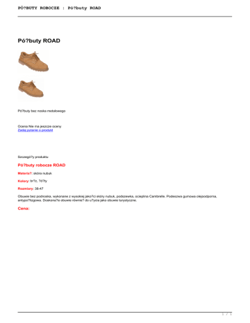 PÓ?BUTY ROBOCZE : Pó?buty ROAD Pó?buty ROAD Pó?buty bez noska metalowego Ocena Nie ma jeszcze oceny Zadaj pytanie o produkt Szczegó?y produktu Pó?buty robocze ROAD Materia?: skóra nubuk Kolory: br?z, ?ó?ty Rozmiary: 38-47 Obuwie bez podnoska, wykonane z wysokiej jako?ci skóry nubuk, podszewka, ocieplina Cambrelle. Podeszwa gumowa olejoodporna, antypo?lizgowa. Doskona?e obuwie równie? do u?ycia jako obuwie turystyczne. Cena: 1 / 1 Powered by TCPDF (www.tcpdf.org)