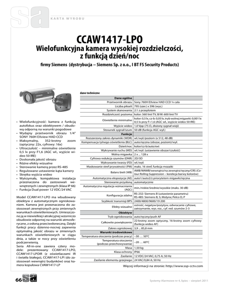 k a r ta w y r o b u CCAW1417-LPO Wielofunkcyjna kamera wysokiej rozdzielczości, z funkcją dzień/noc firmy Siemens (dystrybucja – Siemens Sp. z o.o., I BT FS Security Products) dane techniczne Dane ogólne Przetwornik obrazu Liczba pikseli System skanowania Rozdzielczość pozioma • Wielofunkcyjność: kamera z funkcją autofokus oraz obiektywem / obudową odporną na warunki pogodowe • Wydajny przetwornik obrazu 1/4" SONY 760H EXview HAD CCD • Maksymalny, 352-krotny zoom (optyczny: 22x, cyfrowy: 16x) • Ultraczułość – minimalne oświetlenie 0,5 lx przy F1,6 (AGC wł., wyjście wideo 50 IRE) • Doskonała jakość obrazu • Różne efekty wizualne • Sterowanie kamerą przez RS-485 • Regulowane ustawienie kąta kamery • Skrętka wyjścia wideo • Wytrzymała, kompaktowa instalacja przeznaczona do zastosowań wewnętrznych i zewnętrznych (klasa IP 66) • Funkcja Dual power 12 VDC/24 VAC Model CCAW1417-LPO ma wbudowany obiektyw z automatycznym ogniskowaniem. Kamera jest przeznaczona do zastosowań zewnętrznych przy zmiennych warunkach oświetleniowych. Umieszczono ją w niewielkiej i atrakcyjnej wzorniczo obudowie odpornej na warunki atmosferyczne, z osłoną przeciwsłoneczną. Dzięki funkcji pracy dzienno-nocnej zapewnia optymalną jakość obrazu w zmiennych warunkach oświetleniowych w ciągu dnia, a także w nocy przy oświetleniu podczerwienią. Seria All-in-one zawiera cztery modele: prezentowany CCAW1417-LPO, CCAW1417-LPOIR (z oświetlaczami IR i światła białego), CCAW1417-LPI (do zastosowań wewnątrz budynków) oraz kamera kopułowa CVAW1417-LP 66 Sony 760H EXview HAD CCD ¼ cala 795 (szer.) x 596 (wys.) 2:1 z przeplotem kolor: 560 linii TV, B/W: 600 linii TV kolor: 0,5 lx, cz-b: 0,05 lx, tryb wolnej migawki: 0,001 lx Oświetlenie minimalne 0,5 lx przy F=1,6 (AGC wł., wyjście wideo 50 IRE) Wyjście wideo 1,0 Vpp (75 Ω, złożony sygnał wizji) Stosunek sygnał/szum 50 dB (funkcja AGC wył.) Funkcje Rozszerzony zakres dynamiki (WDR) wł./wył./poziom (x 512, 48 dB) Kompensacja tylnego oświetlenia (BLC) auto/ręczna (obszar, poziom)/wył. Dzień/noc kolor/cz-b/auto/ext Wykrywanie ruchu (MD) wł./wył. (ustawienie obszar/czułość) Wolna migawka 2 x ... 128 x Cyfrowa redukcja szumów (DNR) 2D/3D Wykrywanie twarzy (FD) wł./wył. Maskowanie stref prywatności (PM) maks. 16 stref, funkcja mozaiki AWB/WAWB/wewnątrz/na zewnątrz/ręczny/CRS (CoBalans bieli (WB) lour Rolling Suppression – korekcja barwy kolorów) Automatyczna ekspozycja (AE) auto1/auto2/z priorytetem migawki/ręczna Sterowanie przysłoną automatycznie Automatyczna regulacja wzmacniania min./niskie/średnie/wysokie (maks. 30 dB) (AGC) RS-232: Siemens B (ustawienie parametru) Konfiguracja zdalna RS-485: Siemens B, S; Molynx; Pelco D, P Szybkość transmisji BPS 2400/4800/9600/19 200 ostrość, negatyw/pozytyw, odwracanie cyfrowe, Efekty wizualne zatrzymanie, wys. roz., cyf. red. szumów 2-3 Obiektyw Tryb ogniskowania auto/ręczny/push AF 22-krotny zoom optyczny, 16-krotny zoom cyfrowy Całkowite powiększenie (funkcja wideo AF) Zakres ogniskowej 3,9 ... 85,8 mm Warunki środowiskowe Temperatura otoczenia (podczas pracy) –30 … 50°C Temperatura otoczenia –20 … 60°C (podczas przechowywania) Masa 1,50 kg Klasa ochrony IP66 Zasilanie 12 VDC/24 VAC; 0,75 A; 50 Hz Zasilanie elementu grzejnego 24 VAC/0,84 A; 50 Hz Więcej informacji na stronie: http://www.ssp-cctv.com Systemy Alarmowe nr 4, lipiec – sierpień 2011