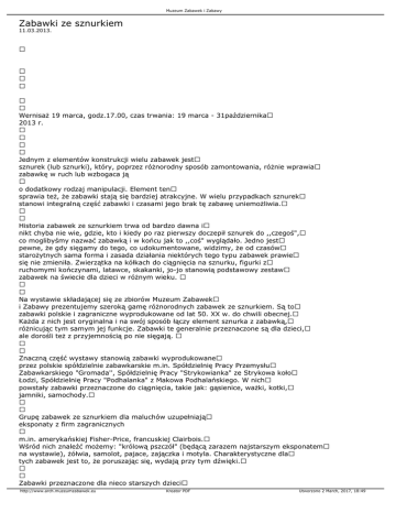 Muzeum Zabawek i Zabawy Zabawki ze sznurkiem 11.03.2013. Wernisaż 19 marca, godz.17.00, czas trwania: 19 marca - 31października 2013 r. Jednym z elementów konstrukcji wielu zabawek jest sznurek (lub sznurki), który, poprzez różnorodny sposób zamontowania, różnie wprawia zabawkę w ruch lub wzbogaca ją o dodatkowy rodzaj manipulacji. Element ten sprawia też, że zabawki stają się bardziej atrakcyjne. W wielu przypadkach sznurek stanowi integralną część zabawki i czasami jego brak tę zabawę uniemożliwia. Historia zabawek ze sznurkiem trwa od bardzo dawna i nikt chyba nie wie, gdzie, kto i kiedy po raz pierwszy doczepił sznurek do ,,czegoś", co moglibyśmy nazwać zabawką i w końcu jak to ,,coś" wyglądało. Jedno jest pewne, że gdy sięgamy do tego, co udokumentowane, widzimy, że od czasów starożytnych sama forma i zasada działania niektórych tego typu zabawek prawie się nie zmieniła. Zwierzątka na kółkach do ciągnięcia na sznurku, figurki z ruchomymi kończynami, latawce, skakanki, jo-jo stanowią podstawowy zestaw zabawek na świecie dla dzieci w różnym wieku. Na wystawie składającej się ze zbiorów Muzeum Zabawek i Zabawy prezentujemy szeroką gamę różnorodnych zabawek ze sznurkiem. Są to zabawki polskie i zagraniczne wyprodukowane od lat 50. XX w. do chwili obecnej. Każda z nich jest oryginalna i na swój sposób łączy element sznurka z zabawką, różnicując tym samym jej funkcje. Zabawki te generalnie przeznaczone są dla dzieci, ale dorośli też z przyjemnością po nie sięgają. Znaczną część wystawy stanowią zabawki wyprodukowane przez polskie spółdzielnie zabawkarskie m.in. Spółdzielnię Pracy Przemysłu Zabawkarskiego "Gromada'', Spółdzielnię Pracy "Strykowianka" ze Strykowa koło Łodzi, Spółdzielnię Pracy "Podhalanka" z Makowa Podhalańskiego. W nich powstały zabawki przeznaczone do ciągnięcia, takie jak: gąsienice, ważki, kotki, jamniki, samochody. Grupę zabawek ze sznurkiem dla maluchów uzupełniają eksponaty z firm zagranicznych m.in. amerykańskiej Fisher-Price, francuskiej Clairbois. Wśród nich znaleźć możemy: "królową pszczół" (będącą zarazem najstarszym eksponatem na wystawie), żółwia, samolot, pajace, zajączka i motyla. Charakterystyczne dla tych zabawek jest to, że poruszając się, wydają przy tym dźwięki. Zabawki przeznaczone dla nieco starszych dzieci http://www.arch.muzeumzabawek.eu Kreator PDF Utworzono 2 March, 2017, 18:49 Muzeum Zabawek i Zabawy pochodzą m.in. z: Zabawkarskiej Spółdzielni Pracy "Puszczykowo" z Puszczykowa, Zabawkarskiej Spółdzielni Pracy "Bajka" z Lublina, Spółdzielni Pracy im. St. Dubois i firmy Drapinos z Warszawy. Są to latawce, skakanki i różnego rodzaju gry zręcznościowe. Niektóre eksponaty na pierwszy rzut oka zdają się mieć niewiele wspólnego ze sznurkiem, ponieważ jest on ukryty w środku zabawki. Przykładem jest osiołek na podeście firmy Straume z ZSRR. Sznurkowy dodatek przy zabawkach pojawia się także często w twórczości ludowej. Przykładem tego są zabawki Stanisława Naroga z Żołyni, Adeli Siwek z Leżajska, Mariana Mółki-Gronia z Nowego Sącza, Tadeusza Żaka z Łazów. Wśród nich znalazły się barwne koniki, pukawki, frucki, wiatraczki, łuki i różnego rodzaju kurki dziobiące. Wszystkie prezentowane zabawki spełniają szereg istotnych funkcji w rozwoju dziecka. Wpływają na percepcję, koordynację ruchową i manualną oraz uczą zabawy w grupie. Na wystawie będzie można spróbować swoich sił w zabawie latającymi bilami, diabolo, poi i jo-jo. Film Kilka ciekawostek o zabawkach ze sznurkiem: Zwierzątka na kółkach - już w starożytnym Egipcie ok. 2000 lat p.n.e. wykonywano drewniane zabawki w formie koników, krokodyli czy hipopotamów, które, dzięki kółkom i sznurkowi, można było ciągnąć po ziemi. Jo-jo - początkowo było bronią myśliwską w formie kamienia z przymocowanym sznurkiem. W Chinach, skąd najprawdopodobniej dotarło do Europy wraz z wymianami handlowymi, znane było już ok. 1000 lat p.n.e. Wizerunki dzieci bawiących się jo-jo zachowały się na greckich wazach sprzed 500 roku p.n.e. Powszechnie używana nazwa jo-jo pochodzi od filipińskiego ,,yóyo", co oznacza ,,chodź, chodź" albo wróć. http://www.arch.muzeumzabawek.eu Kreator PDF Utworzono 2 March, 2017, 18:49 Muzeum Zabawek i Zabawy Latawce - ok. 600 lat p.n.e. Chińczycy poznawszy zasady aerodynamiki, wypuszczali latawce w niebo w celu sygnalizacji wojennej podczas bitew. Latawiec, który poruszał się w odpowiedni sposób, miał określony kolor i kształt, oznaczał konkretne informacje. Hetki - czyli kościane guziki - to jedna ze średniowiecznych dziecięcych zabawek. Przez wywiercone w nich otwory przewlekano sznurek. Skręcano go, a później, gdy zostawał rozprostowany, hetki furkotały. Młynek z orzecha - dość powszechna zabawka w okresie renesansu. Do wydrążonego orzecha wkładano patyk. Do dolnego końca patyka przymocowany był sznurek, który z kolei przeciągano przez otwór w boku orzecha. Jeżeli pociągało się za sznurek z odpowiednią siłą, wówczas patyk obracał się i sznur nawijał się ponownie. Do wierzchołka wystającego patyka doczepiano malutkie śmigiełka, które dookoła wirowały. Zasada działania „młynka z orzecha" zbliżona była do zasady działania jo-jo. Skakanka - jej prototypu można szukać w starożytności, kiedy do skoków używano pnączy winorośli. Współczesna skakanka wywodzi się z gier i zabaw ludowych znanych na całym świecie. Arabowie znali skakankę pod nazwą „Quito", a Maorysi nazywali ją „piu". Przez sznur skakali mieszkańcy Syberii i Tybetu. W Europie gra znana była niemalże we wszystkich krajach, ale największą popularnością cieszyła się w Holandii, Niemczech, Portugalii i Danii. W XIX w. dzieci udoskonalały metody skakania na skakance: skakały nie tylko pojedynczo, ale i w kilka osób. Warsztaty towarzyszące wys