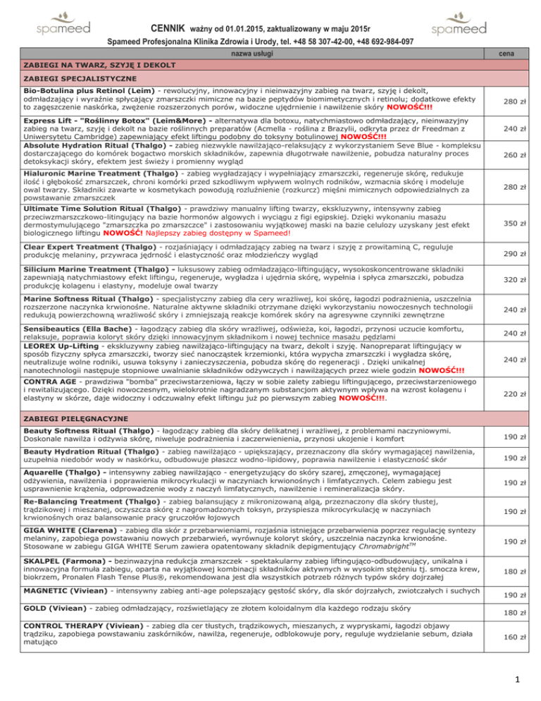 CENNIK ważny od 01.01.2015, zaktualizowany w maju 2015r Spameed Profesjonalna Klinika Zdrowia i Urody, tel. +48 58 307-42-00, +48 692-984-097 nazwa usługi cena ZABIEGI NA TWARZ, SZYJĘ I DEKOLT ZABIEGI SPECJALISTYCZNE Bio-Botulina plus Retinol (Leim) - rewolucyjny, innowacyjny i nieinwazyjny zabieg na twarz, szyję i dekolt, odmładzający i wyraźnie spłycający zmarszczki mimiczne na bazie peptydów biomimetycznych i retinolu; dodatkowe efekty to zagęszczenie naskórka, zwężenie rozszerzonych porów, widoczne ujędrnienie i nawilżenie skóry NOWOŚĆ!!! Express Lift - "Roślinny Botox" (Leim&More) - alternatywa dla botoxu, natychmiastowo odmładzający, nieinwazyjny zabieg na twarz, szyję i dekolt na bazie roślinnych preparatów (Acmella - roślina z Brazylii, odkryta przez dr Freedman z Uniwersytetu Cambridge) zapewniający efekt liftingu podobny do toksyny botulinowej NOWOŚĆ!!! Absolute Hydration Ritual (Thalgo) - zabieg niezwykle nawilżająco-relaksujący z wykorzystaniem Seve Blue - kompleksu dostarczającego do komórek bogactwo morskich składników, zapewnia długotrwałe nawilżenie, pobudza naturalny proces detoksykacji skóry, efektem jest świeży i promienny wygląd 280 zł 240 zł 260 zł Hialuronic Marine Treatment (Thalgo) - zabieg wygładzający i wypełniający zmarszczki, regeneruje skórę, redukuje ilość i głębokość zmarszczek, chroni komórki przed szkodliwym wpływem wolnych rodników, wzmacnia skórę i modeluje owal twarzy. Składniki zawarte w kosmetykach powodują rozluźnienie (rozkurcz) mięśni mimicznych odpowiedzialnych za powstawanie zmarszczek 280 zł Ultimate Time Solution Ritual (Thalgo) - prawdziwy manualny lifting twarzy, ekskluzywny, intensywny zabieg przeciwzmarszczkowo-litingujący na bazie hormonów algowych i wyciągu z figi egipskiej. Dzięki wykonaniu masażu dermostymulującego "zmarszczka po zmarszczce" i zastosowaniu wyjątkowej maski na bazie celulozy uzyskany jest efekt biologicznego liftingu NOWOŚĆ! Najlepszy zabieg dostępny w Spameed! 350 zł Clear Expert Treatment (Thalgo) - rozjaśniający i odmładzający zabieg na twarz i szyję z prowitaminą C, reguluje produkcję melaniny, przywraca jędrność i elastyczność oraz młodzieńczy wygląd 290 zł Silicium Marine Treatment (Thalgo) - luksusowy zabieg odmładzająco-liftingujący, wysokoskoncentrowane skladniki zapewniają natychmiastowy efekt liftingu, regeneruje, wygładza i ujędrnia skórę, wypełnia i spłyca zmarszczki, pobudza produkcję kolagenu i elastyny, modeluje owal twarzy 320 zł Marine Softness Ritual (Thalgo) - specjalistyczny zabieg dla cery wrażliwej, koi skórę, łagodzi podrażnienia, uszczelnia rozszerzone naczynka krwionośne. Naturalne aktywne składniki otrzymane dzięki wykorzystaniu nowoczesnych technologii redukują powierzchowną wrażliwość skóry i zmniejszają reakcje komórek skóry na agresywne czynniki zewnętrzne 240 zł Sensibeautics (Ella Bache) - łagodzący zabieg dla skóry wrażliwej, odświeża, koi, łagodzi, przynosi uczucie komfortu, relaksuje, poprawia koloryt skóry dzięki innowacyjnym składnikom i nowej technice masażu pędzlami LEOREX Up-Lifting - ekskluzywny zabieg nawilżająco-liftingujący na twarz, dekolt i szyję. Nanopreparat liftingujący w sposób fizyczny spłyca zmarszczki, tworzy sieć nanocząstek krzemionki, która wypycha zmarszczki i wygładza skórę, neutralizuje wolne rodniki, usuwa toksyny i zanieczyszczenia, pobudza skórę do regeneracji . Dzięki unikalnej nanotechnologii następuje stopniowe uwalnianie składników odżywczych i nawilżających przez wiele godzin NOWOŚĆ!!! CONTRA AGE - prawdziwa "bomba" przeciwstarzeniowa, łączy w sobie zalety zabiegu liftingującego, przeciwstarzeniowego i rewitalizującego. Dzięki nowoczesnym, wielokrotnie nagradzanym substancjom aktywnym wpływa na wzrost kolagenu i elastyny w skórze, daje widoczny i odczuwalny efekt liftingu już po pierwszym zabieg NOWOŚĆ!!!. 240 zł 240 zł 220 zł ZABIEGI PIELĘGNACYJNE Beauty Softness Ritual (Thalgo) - łagodzący zabieg dla skóry delikatnej i wrażliwej, z problemami naczyniowymi. Doskonale nawilża i odżywia skórę, niweluje podrażnienia i zaczerwienienia, przynosi ukojenie i komfort 190 zł Beauty Hydration Ritual (Thalgo) - zabieg nawilżająco - upiększający, przeznaczony dla skóry wymagającej nawilżenia, uzupełnia niedobór wody w naskórku, odbudowuje płaszcz wodno-lipidowy, poprawia nawilżenie i elastyczność skór 190 zł Aquarelle (Thalgo) - intensywny zabieg nawilżająco - energetyzujący do skóry szarej, zmęczonej, wymagającej odżywienia, nawilżenia i poprawienia mikrocyrkulacji w naczyniach krwionośnych i limfatycznych. Celem zabiegu jest usprawnienie krążenia, odprowadzenie wody z naczyń limfatycznych, nawilżenie i remineralizacja skóry. 190 zł Re-Balancing Treatment (Thalgo) - zabieg balansujący z mikronizowaną algą, przeznaczony dla skóry tłustej, trądzikowej i mieszanej, oczyszcza skórę z nagromadzonych toksyn, przyspiesza mikrocyrkulację w naczyniach krwionośnych oraz balansowanie pracy gruczołów łojowych 190 zł GIGA WHITE (Clarena) - zabieg dla skór z przebarwieniami, rozjaśnia istniejące przebarwienia poprzez regulację syntezy melaniny, zapobiega powstawaniu nowych przebarwień, wyrównuje koloryt skóry, uszczelnia naczynka krwionośne. Stosowane w zabiegu GIGA WHITE Serum zawiera opatentowany składnik depigmentujący ChromabrightTM 190 zł SKALPEL (Farmona) - bezinwazyjna redukcja zmarszczek - spektakularny zabieg liftingująco-odbudowujący, unikalna i innowacyjna formuła zabiegu, oparta na wyjątkowej kombinacji składników aktywnych w wysokim stężeniu tj. smocza krew, biokrzem, Pronalen Flash Tense Plus®, rekomendowana jest dla wszystkich potrzeb różnych typów skóry dojrzałej 180 zł MAGNETIC (Viviean) - intensywny zabieg anti-age polepszający gęstość skóry, dla skór dojrzałych, zwiotczałych i suchych GOLD (Vivie