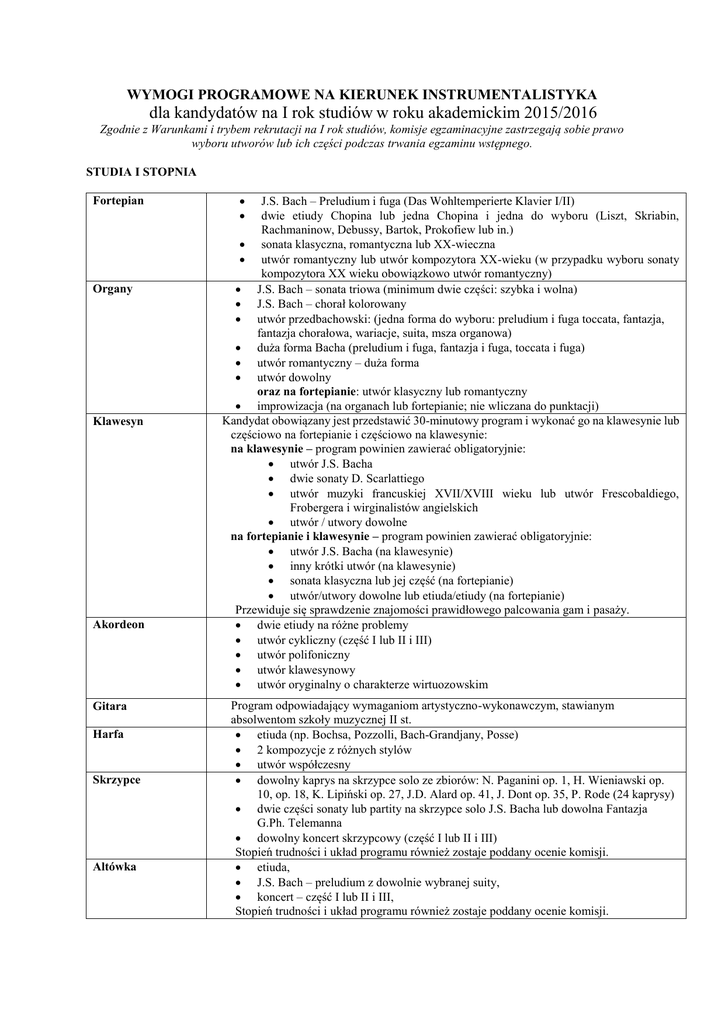 WYMOGI PROGRAMOWE NA KIERUNEK INSTRUMENTALISTYKA dla kandydatów na I rok studiów w roku akademickim 2015/2016 Zgodnie z Warunkami i trybem rekrutacji na I rok studiów, komisje egzaminacyjne zastrzegają sobie prawo wyboru utworów lub ich części podczas trwania egzaminu wstępnego. STUDIA I STOPNIA Fortepian Organy Klawesyn Akordeon Gitara Harfa Skrzypce Altówka J.S. Bach – Preludium i fuga (Das Wohltemperierte Klavier I/II) dwie etiudy Chopina lub jedna Chopina i jedna do wyboru (Liszt, Skriabin, Rachmaninow, Debussy, Bartok, Prokofiew lub in.) sonata klasyczna, romantyczna lub XX-wieczna utwór romantyczny lub utwór kompozytora XX-wieku (w przypadku wyboru sonaty kompozytora XX wieku obowiązkowo utwór romantyczny) J.S. Bach – sonata triowa (minimum dwie części: szybka i wolna) J.S. Bach – chorał kolorowany utwór przedbachowski: (jedna forma do wyboru: preludium i fuga toccata, fantazja, fantazja chorałowa, wariacje, suita, msza organowa) duża forma Bacha (preludium i fuga, fantazja i fuga, toccata i fuga) utwór romantyczny – duża forma utwór dowolny oraz na fortepianie: utwór klasyczny lub romantyczny improwizacja (na organach lub fortepianie; nie wliczana do punktacji) Kandydat obowiązany jest przedstawić 30-minutowy program i wykonać go na klawesynie lub częściowo na fortepianie i częściowo na klawesynie: na klawesynie – program powinien zawierać obligatoryjnie: utwór J.S. Bacha dwie sonaty D. Scarlattiego utwór muzyki francuskiej XVII/XVIII wieku lub utwór Frescobaldiego, Frobergera i wirginalistów angielskich utwór / utwory dowolne na fortepianie i klawesynie – program powinien zawierać obligatoryjnie: utwór J.S. Bacha (na klawesynie) inny krótki utwór (na klawesynie) sonata klasyczna lub jej część (na fortepianie) utwór/utwory dowolne lub etiuda/etiudy (na fortepianie) Przewiduje się sprawdzenie znajomości prawidłowego palcowania gam i pasaży. dwie etiudy na różne problemy utwór cykliczny (część I lub II i III) utwór polifoniczny utwór klawesynowy utwór oryginalny o charakterze wirtuozowskim Program odpowiadający wymaganiom artystyczno-wykonawczym, stawianym absolwentom szkoły muzycznej II st. etiuda (np. Bochsa, Pozzolli, Bach-Grandjany, Posse) 2 kompozycje z różnych stylów utwór współczesny dowolny kaprys na skrzypce solo ze zbiorów: N. Paganini op. 1, H. Wieniawski op. 10, op. 18, K. Lipiński op. 27, J.D. Alard op. 41, J. Dont op. 35, P. Rode (24 kaprysy) dwie części sonaty lub partity na skrzypce solo J.S. Bacha lub dowolna Fantazja G.Ph. Telemanna dowolny koncert skrzypcowy (część I lub II i III) Stopień trudności i układ programu również zostaje poddany ocenie komisji. etiuda, J.S. Bach – preludium z dowolnie wybranej suity, koncert – część I lub II i III, Stopień trudności i układ programu również zostaje poddany ocenie komisji. Wiolonczela Kontrabas Instrumenty dęte i perkusja J.S. Bach – preludium z dowolnie wybranej suity wiolonczelowej (oprócz I Suity) lub dwie części koncert – część I lub II i III etiuda Stopień trudności i układ programu również zostaje poddany ocenie komisji. sonata – dwie kontrastujące ze sobą części koncert – część I lub II i III utwór dowolny Stopień trudności i układ programu również zostaje poddany ocenie komisji. Program odpowiadający poziomowi egzaminu dyplomowego i egzaminu technicznego szkoły muzycznej II stopnia – do wyboru komisji. Skrzypce barokowe Program obejmujący ok. 25 minut muzyki może być wykonany na skrzypcach barokowych lub współczesnych. Pozycje obowiązkowe: Utwór na skrzypce solo skomponowany pomiędzy 1650-1760 (do wyboru: -G.Ph.Telemann- Fantazja na skrzypce solo -J.S. Bach- 2 części z sonaty lub partity na skrzypce solo -J.H. Roman- Assaggio na skrzypce solo -N. Matteis- Ayres for the Violin -HIF. Biber- Passacaglia) Sonata włoskiego kompozytora z okresu 1610-1760 F. Couperin- jedna część dowolnego „Concert royaux” lub „Les Goûts réunis” Ograny- muzyka kościelna Utwory do wykonania na egzaminie praktycznym: J.S.Bach - preludium i fuga (lub toccata, fantazja, fantazja i fuga) J.S.Bach – preludium chorałowe z Orgelbüchlein utwór romantyczny (cykliczny lub dwa utwory zróżnicowane pod względem charakteru) przygrywka do dowolnej pieśni i wykonanie harmonizacji do pieśni podanej przez komisję wykonanie głosem dowolnej pieśni kościelnej Improwizacja (niepunktowana – jedynie w celu sprawdzenia predyspozycji) STUDIA II stopnia Fortepian Organy Klawesyn Akordeon Gitara Harfa Egzamin wstępny obejmuje wykonanie zróżnicowanego programu 25-minutowego oraz rozmowę kwalifikacyjną. Egzamin wstępny obejmuje wykonanie zróżnicowanego programu 25-minutowego oraz rozmowę kwalifikacyjną. Egzamin wstępny obejmuje wykonanie zróżnicowanego programu 25-minutowego (obowiązkowo II i III część Koncertu włoskiego J.S.Bacha) oraz rozmowę kwalifikacyjną. Egzamin wstępny obejmuje wykonanie zróżnicowanego programu 25-minutowego (w tym obowiązkowo utwór polifoniczny) oraz rozmowę kwalifikacyjną. suita barokowa cykliczna forma sonaty forma wariacyjna utwór dowolny – do wyboru komisji koncert na harfę (np. Dittersdorf, Haendel, Boieldieu, Mozart) 3 utwory z różnych stylów (w tym jeden wirtuozowski) utwór współczesny (napisany po 1945 r.) 3 kadencje utworów orkiestrowych (np. Donizetti Lucia di Lammermoor, Ravel Tzigane, Britten Young Person’s Guide) ewentualnie muzyka kameralna (akompaniament/instrumenty towarzyszące we własnym zakresie). Skrzypce Altówka Wiolonczela Kontrabas Instrumenty dęte i perkusja Skrzypce barokowe Wiolonczela barokowa Wiola da gamba Ograny-muzyka kościelna Egzamin wstępny obejmuje wykonanie zróżnicowanego programu 25-minutowego oraz rozmowę kwalifikacyjną. Egzamin wstępny obejmuje wykonanie zróżnicowanego programu 25-minutowego oraz rozmowę kwalifikacyjną. Egzamin wstępny obejmuje wykonanie zróżnicowanego prog