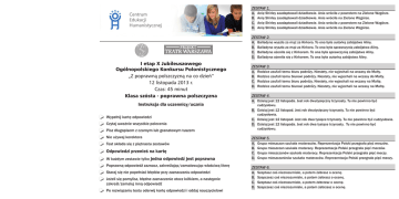 ZESTAW 1. ZESTAW 1. Anię Shirley zaadoptowali dziadkowie. Ania wróciła z powrotem na Zielone Wzgórze. A. B. C. D. Shirley zaadaptowali dziadkowie. Ania wróciła na Zielone Wzgórze. A.Anię Cofnij kroki. ZESTAW 1.się dwa Anię Shirley zaadaptowali dziadkowie. Ania wróciła z powrotem na Zielone Wzgórze. Anię Shirley zaadoptowali dziadkowie. Ania wróciła na Zielone Wzgórze. B. A. Cofnij się dwa kroki kroki.do tyłu. ZESTAW 2. „Z poprawną polszczyzną na co dzień” I etap IX Ogólnopolskiego Konkursu Polonistycznego I etap Jubileuszowego 12 X listopada 2013 „Z poprawną polszczyzną nar.co dzień” Ogólnopolskiego Konkursu Polonistycznego 45 minut 12Czas: listopada 2013na r. co dzień” „Z poprawną polszczyzną 12 Czas: listopada 2013polszczyzna r. 45 minut Klasa pierwsza – poprawna Czas: 45 minut Instrukcja uczennicy/ucznia Klasaszósta pierwsza – poprawna polszczyzna Klasa - dla poprawna polszczyzna Instrukcja dla uczennicy/ucznia Wypełnij kartę odpowiedzi Czytaj uważnie wszystkie polecenia Wypełnij kartę odpowiedzi Pisz długopisem z czarnym lub granatowym tuszem Czytaj uważnie wszystkie polecenia Nie używaj korektora Pisz długopisem z czarnym lub granatowym tuszem Test składa się z piętnastu zestawów Nie używaj korektora Odpowiedzi przenieś na kartę Test składa się z piętnastu zestawów W każdym zestawie tylko jedna odpowiedź jest poprawna Odpowiedzi przenieś na kartę Poprawną odpowiedź zaznacz, zakreślając/zamalowując właściwą literę W każdym zestawie tylko jedna odpowiedź jest poprawna Staraj się nie popełniać błędów przy zaznaczaniu odpowiedzi Poprawną odpowiedź zaznacz, zakreślając/zamalowując właściwą literę Jeżeli się pomylisz, błędne zaznaczenie otocz kółkiem, a następnie Staraj się nie popełniać błędów przy zaznaczaniu odpowiedzi zakreśl/zamaluj inną odpowiedź Jeżeli się pomylisz, błędne zaznaczenie otocz kółkiem, a następnie Po rozwiązaniu testu oderwij kartę odpowiedzi i oddaj nauczycielowi zakreśl/zamaluj inną odpowiedź Po rozwiązaniu testu oderwij kartę odpowiedzi i oddaj nauczycielowi PP OO KK PP L L RR AA AA SS WW A A NNPP A A IE IE PPRR O O WW LSLS S S ZCZCZAZA ZYZY ZNZN AA I etap IX Ogólnopolskiego Konkursu Polonistycznego B.Balladyna Cofnij się dwa krokiTodo tyłu. wyszła za mąż za Kirkora. ona była autorką zabójstwa Aliny. Balladyna wyszła za mąż za Kirkora. To ona była sprawczynią zabójstwa Aliny. ZESTAW 2. się z Kirkorem. To ona była sprawczynią zabójstwa Aliny. Balladyna ożeniła A. B. C. D. Balladyna ożeniła się z Kirkorem. To ona była autorką zabójstwa Aliny. A. Czuję2. się okey. ZESTAW ZESTAW 3. A.Rodzice Czuję okey. A.B. zaufalisię temudobrze. biuru podróży. Niestety, nie wyjechali na wczasy do Malty. B. Rodzice zaufali temu biurowi podróży. Niestety, nie wyjechali na wczasy do Malty. C. Rodzice zaufali temu biuru podróży. Niestety, nie wyjechali na wczasy na Maltę. D. Rodzice zaufali temu biurowi podróży. Niestety, nie wyjechali na wczasy na Maltę. B. Czuję się dobrze. ZESTAW 3. ZESTAW 4. A. Książka ZESTAW 3. jest fajna. B. ciekawa. A. Książka jest fajna. A. Dzisiaj jest 12 listopada. Jest rok dwutysięczny trzynasty. Tu nie powinno być cudzysłowu. B. Dzisiaj jest 12 listopad. Jest rok dwutysięczny trzynasty. Tu nie powinno być cudzysłowia. C. Dzisiaj jest 12 listopad. Jest rok dwa tysiące trzynasty. Tu nie powinno być cudzysłowia. D. Dzisiaj jest 12 listopada. Jest rok dwa tysiące trzynasty. Tu nie powinno być cudzysłowu. B. Książka jest ciekawa. ZESTAW 4. ZESTAW 5. A. Dzisiaj ZESTAW 4.jest 12 listopad. Grupa mieszczan szukała materaców. Reprezentacja Polski przegrała pięć meczów. mieszczan szukała materacy. Reprezentacja Polski przegrała pięć meczów. B. listopada. A.Grupa Dzisiaj jest 12 listopad. Grupa mieszczanów szukała materacy. Reprezentacja Polski przegrała pięć meczy. A. B. C. D. mieszczaninów szukała materaców. Reprezentacja Polski przegrała pięć meczy. B.Grupa Dzisiaj jest 12 listopada. ZESTAW 6. ZESTAW 5. A. Szeptasz coś niezrozumiale, a potem żebrasz o ocenę. A. Mam 5. przyjacieli. ZESTAW B. A. Mam przyjaciół. przyjacieli. B. Szepczesz coś niezrozumiale, a potem żebrasz o ocenę. C. Szeptasz coś niezrozumiale, a potem żebrzesz o ocenę. D. Szepczesz coś niezrozumiale, a potem żebrzesz o ocenę. ZESTAW 7. ZESTAW 11. A. Był Romeem w szkolnym przedstawieniu. Ponadto zasłynął z bardzo przekonywujących ról w spektaklach Macieja Wojtyszko. B. Był Romeo w szkolnym przedstawieniu. Ponadto zasłynął z bardzo przekonujących ról w spektaklach Macieja Wojtyszki. C. Był Romeo w szkolnym przedstawieniu. Ponadto zasłynął z bardzo przekonywających ról w spektaklach Macieja Wojtyszki. D. Był Romeem w szkolnym przedstawieniu. Ponadto zasłynął z bardzo przekonywających ról w spektaklach Macieja Wojtyszki. A. Pyrrusowe zwycięstwo - oznacza zwycięstwo nadmiernym kosztem, nieproporcjonalnym do osiągniętych efektów. B. Pyrrusowe zwycięstwo - oznacza zwycięstwo niskim kosztem, proporcjonalnym do osiągniętych efektów. C. Pyrrusowe zwycięstwo - oznacza zwycięstwo nadmiernym kosztem, ale proporcjonalnym do osiągniętych efektów. D. Pyrrusowe zwycięstwo - oznacza zwycięstwo nad kimś słabszym. ZESTAW 8. A. B. C. D. P KL R A A S W A N P A IE P R O W LS S ZC Z A ZY ZN ZESTAW 7. A B. Nie skacz po łóżku. się kakao. Koleżanka z Jabłonny założyła zielony swetr. A.Ubrudziłeś Nie lubię kiślu. A. B. C. D. Ubrudziłeś się kakao. Koleżanka z Jabłonny założyła zielony sweter. Ubrudziłeś się kakaem. Koleżanka z Jabłonnej ubrała zielony sweter. Ubrudziłeś się kakaem. Koleżanka z Jabłonnej ubrała zielony swetr. B. Nie lubię kisielu. ZESTAW 9. A. Mówią, że do dwóch razy sztuka. B. Mówią, że do trzech razy sztuka. ZESTAW ZESTAW 12. Proszę dzwonić na numer 7665647. Przegraliśmy dzięki słabej grze Bartka. Proszę d