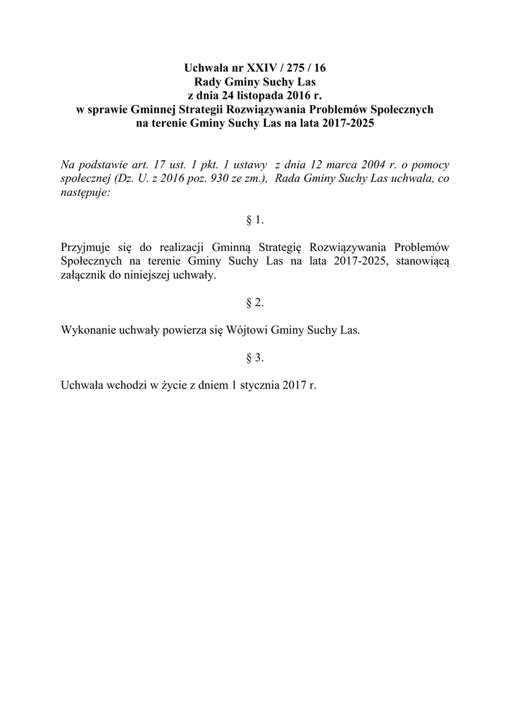 Uchwała nr XXIV / 275 / 16 Rady Gminy Suchy Las z dnia 24