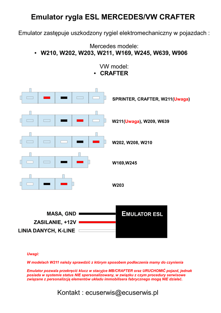 Emulator rygla ESL MERCEDES/VW CRAFTER Emulator zastępuje uszkodzony rygiel elektromechaniczny w pojazdach : ● Mercedes modele: W210, W202, W203, W211, W169, W245, W639, W906 ● VW model: CRAFTER SPRINTER, CRAFTER, W211(Uwaga) W211(Uwaga), W209, W639 W202, W208, W210 W169,W245 W203 MASA, GND EMULATOR ESL ZASILANIE, +12V LINIA DANYCH, K-LINE Uwagi: W modelach W211 należy sprawdzić z którym sposobem podłaczenia mamy do czynienia Emulator pozwala przekręcić klucz w stacyjce MB/CRAFTER oraz URUCHOMIĆ pojazd, jednak posiada w systemie status NIE spersonalizowany, w związku z czym procedury serwisowe związane z personalizcją elementów układu immobilisera fabrycznego mogą NIE działać. Kontakt : [email protected]