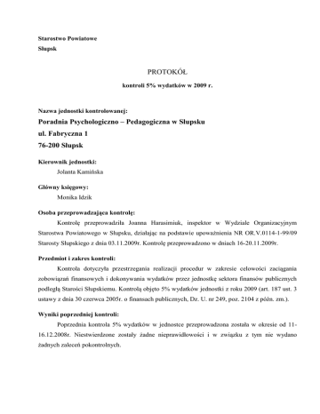 Starostwo Powiatowe Słupsk PROTOKÓŁ kontroli 5% wydatków w 2009 r. Nazwa jednostki kontrolowanej: Poradnia Psychologiczno – Pedagogiczna w Słupsku ul. Fabryczna 1 76-200 Słupsk Kierownik jednostki: Jolanta Kamińska Główny księgowy: Monika Idzik Osoba przeprowadzająca kontrolę: Kontrolę przeprowadziła Joanna Harasimiuk, inspektor w Wydziale Organizacyjnym Starostwa Powiatowego w Słupsku, działając na podstawie upoważnienia NR OR.V.0114-1-99/09 Starosty Słupskiego z dnia 03.11.2009r. Kontrolę przeprowadzono w dniach 16-20.11.2009r. Przedmiot i zakres kontroli: Kontrola dotyczyła przestrzegania realizacji procedur w zakresie celowości zaciągania zobowiązań finansowych i dokonywania wydatków przez jednostkę sektora finansów publicznych podległą Starości Słupskiemu. Kontrolą objęto 5% wydatków jednostki z roku 2009 (art. 187 ust. 3 ustawy z dnia 30 czerwca 2005r. o finansach publicznych, Dz. U. nr 249, poz. 2104 z późn. zm.). Wyniki poprzedniej kontroli: Poprzednia kontrola 5% wydatków w jednostce przeprowadzona została w okresie od 1116.12.2008r. Niestwierdzone zostały żadne nieprawidłowości i w związku z tym nie wydano żadnych zaleceń pokontrolnych. Ustalenia ogólne: Poradnia Psychologiczno-Pedagogiczna jest placówką publiczną prowadzoną przez Powiat Słupski, działającą w formie jednostki budżetowej. Jest to placówka oświatowa, wchodząca w skład systemu oświaty (zgodnie z art. 2 ust. 4 ustawy z dnia 07.09.1991r. o systemie oświaty, Dz. U. z 2004r., Nr 256, poz. 2572 z późn. zm.). Nadzór pedagogiczny sprawuje Pomorski Kurator Oświaty w Gdańsku. Terenem działania Poradni jest obszar powiatu słupskiego składający się z dziesięciu gmin. W celu wykonania zadań statutowych pracownicy pedagogiczni poradni mogą korzystać z siedziby tymczasowej na terenie każdej z gmin. Celem poradni jest udzielanie dzieciom i młodzieży pomocy psychologiczno - pedagogicznej, w tym pomocy logopedycznej, pomocy w wyborze kierunku kształcenia i zawodu, a także udzielanie rodzicom i nauczycielom pomocy psychologiczno - pedagogicznej związanej z wychowaniem i kształceniem dzieci i młodzieży. Dyrektorem jest Pani Jolanta Kamińska, powołana na stanowisko Uchwałą Zarządu Powiatu nr 17/2006 z dnia 28.12.2006r. Uchwałą Zarządu Powiatu nr 18/2006 z dnia 28.12.2006r. udzielono Pani Jolancie Kamińskiej pełnomocnictwa do dokonywania czynności prawnych związanych z prowadzeniem bieżącej działalności powiatu w zakresie wynikającym z działania Poradni Psychologiczno – Pedagogicznej, do dnia 31.08.2011 r. Obowiązki Głównego Księgowego w Poradni Psychologiczno - Pedagogicznej, od dnia 01.10.2002 r. pełni Pani Monika Idzik. Działania badanej jednostki regulowane są poprzez Zarządzenia wewnętrzne Dyrektora: 1. Zarządzenie nr 04/07 z 09.02.2007r. – w sprawie wprowadzenia Regulaminu Zakładowego Funduszu Świadczeń Socjalnych, 2. Zarządzenie nr 20/07 z dnia 30.07.2007r. – w sprawie wprowadzenia instrukcji magazynowej, 3. Zarządzenie nr 29/07 z dnia 29.11.2007r. – w sprawie wprowadzenia instrukcji inwentaryzacyjnej, 4. Zarządzenie nr 07/07 z dnia 30.11.2007r. – w sprawie wprowadzenia procedury dokumentów polityki rachunkowości oraz Zakładowego Planu Kont, 5. Zarządzenie nr 12/08 z dnia 18.08.2008r. – w sprawie procedur kontroli wydatków dokonywanych ze środków publicznych, będących w dyspozycji Poradni Psychologiczno – Pedagogicznej w Słupsku, 6. Zarządzenie nr 13/08 z dnia 18.08.2008r. – w sprawie zasad gospodarki kasowej, 2 7. Zarządzenie nr 7/09 z dnia 18.03.2009 r. – w sprawie wprowadzenia Regulaminu wynagradzania pracowników niebędących nauczycielami zatrudnionych w Poradni Psychologiczno – Pedagogicznej w Słupsku, 8. Zarządzenie nr 12/09 z dnia 06.04.2009 r. – w sprawie procedur kontroli majątku rzeczowego i finansowego w Poradni Psychologiczno – Pedagogicznej, 9. Zarządzenie nr 13/2009 z dnia 28.04.2009 r. – w sprawie prowadzenia gospodarki samochodowej. Ustalenia kontroli: Kontrolę wydatków jednostki za 2009 r. w zakresie gospodarowania środkami publicznymi przeprowadzono na podstawie art. 46 ust. 1 i 2 ustawy o finansach publicznych z dnia 30 czerwca 2005 r. Kontrolę przeprowadzono sposobem wyrywkowym, badając dowody księgowe za m-c od stycznia do października 2009 r. Uchwałą nr 252/2009 Zarządu Powiatu Słupskiego z dnia 08.01.2009 zatwierdzony został plan wydatków dla Poradni Psychologiczno – Pedagogicznej w Słupsku: DZIAŁ ROZDZIAŁ 854 TREŚĆ Edukacyjna opieka wychowawcza Poradnia psychologiczno85406 pedagogiczna, w tym poradnie specjalistyczne Dokształcanie i doskonalenie 85446 nauczycieli 85495 Pozostała działalność WARTOŚĆ 1 441 443,00 1 420 241,00 8 000,00 13 202,00 Uchwałą nr 347/2009 Zarządu Powiatu Słupskiego z dnia 27.10.2009 zwiększone zostały wydatki w planie badanej jednostki: DZIAŁ ROZDZIAŁ 854 TREŚĆ Edukacyjna opieka wychowawcza Poradnia psychologiczno-pedagogiczna, w 85406 tym poradnie specjalistyczne 85446 Dokształcanie i doskonalenie nauczycieli 85495 Pozostała działalność Plan po zmianach 1 444 733,00 1 423 531,00 8 000,00 13 202,00 Kwota 72.236,65 zł stanowi 5% planu wydatków jednostki na 2009r. (1.444.733,00 x 5% = 72.236,65 zł). Badana jednostka za okres od 01.01.2009 do 30.09.2009 sporządziła i przekazała w wymaganym terminie do Starostwa Powiatowego w Słupsku sprawozdania Rb-27S, Rb-28S, Rb-N, 3 Rb-Z, zgodnie z rozporządzeniem Ministra Finansów z dn. 26.06.2006r. (Dz. U. Nr 115, poz. 781 ze zm.). Ze względu na omyłkowe wpisanie należności w pozycji „bank centralny” zamiast „banki” sporządzona została korekta sprawozdania Rb-N. Kopie sprawozdań stanowią załączniki nr 1 do protokołu. Dokumenty zostały zatwierdzone przez kierownika jednostki i głównego księgowego. Stwierdzono, że wykazane w sprawozdaniu wydatki w rozdziałach: - 85406 – 1.087.568,43 zł - 85446 – 6.313,54 z