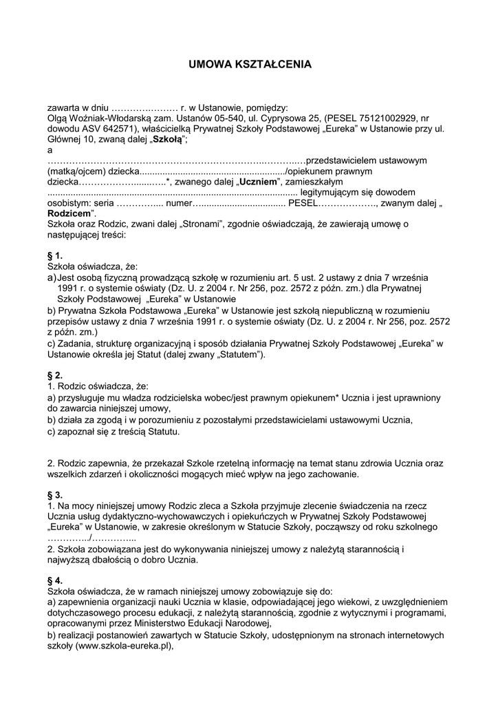 UMOWA KSZTAŁCENIA zawarta w dniu ………….……… r. w Ustanowie, pomiędzy: Olgą Woźniak-Włodarską zam. Ustanów 05-540, ul. Cyprysowa 25, (PESEL 75121002929, nr dowodu ASV 642571), właścicielką Prywatnej Szkoły Podstawowej „Eureka” w Ustanowie przy ul. Głównej 10, zwaną dalej „Szkołą”; a ……………………………………………………………..………..…przedstawicielem ustawowym (matką/ojcem) dziecka........................................................./opiekunem prawnym dziecka……………….......…..*, zwanego dalej „Uczniem”, zamieszkałym .................................................................................................. legitymującym się dowodem osobistym: seria ………….... numer…................................. PESEL………………., zwanym dalej „ Rodzicem”. Szkoła oraz Rodzic, zwani dalej „Stronami”, zgodnie oświadczają, że zawierają umowę o następującej treści: § 1. Szkoła oświadcza, że: a) Jest osobą fizyczną prowadzącą szkołę w rozumieniu art. 5 ust. 2 ustawy z dnia 7 września 1991 r. o systemie oświaty (Dz. U. z 2004 r. Nr 256, poz. 2572 z późn. zm.) dla Prywatnej Szkoły Podstawowej „Eureka” w Ustanowie b) Prywatna Szkoła Podstawowa „Eureka” w Ustanowie jest szkołą niepubliczną w rozumieniu przepisów ustawy z dnia 7 września 1991 r. o systemie oświaty (Dz. U. z 2004 r. Nr 256, poz. 2572 z późn. zm.) c) Zadania, strukturę organizacyjną i sposób działania Prywatnej Szkoły Podstawowej „Eureka” w Ustanowie określa jej Statut (dalej zwany „Statutem”). § 2. 1. Rodzic oświadcza, że: a) przysługuje mu władza rodzicielska wobec/jest prawnym opiekunem* Ucznia i jest uprawniony do zawarcia niniejszej umowy, b) działa za zgodą i w porozumieniu z pozostałymi przedstawicielami ustawowymi Ucznia, c) zapoznał się z treścią Statutu. 2. Rodzic zapewnia, że przekazał Szkole rzetelną informację na temat stanu zdrowia Ucznia oraz wszelkich zdarzeń i okoliczności mogących mieć wpływ na jego zachowanie. § 3. 1. Na mocy niniejszej umowy Rodzic zleca a Szkoła przyjmuje zlecenie świadczenia na rzecz Ucznia usług dydaktyczno-wychowawczych i opiekuńczych w Prywatnej Szkoły Podstawowej „Eureka” w Ustanowie, w zakresie określonym w Statucie Szkoły, począwszy od roku szkolnego …………../…………... 2. Szkoła zobowiązana jest do wykonywania niniejszej umowy z należytą starannością i najwyższą dbałością o dobro Ucznia. § 4. Szkoła oświadcza, że w ramach niniejszej umowy zobowiązuje się do: a) zapewnienia organizacji nauki Ucznia w klasie, odpowiadającej jego wiekowi, z uwzględnieniem dotychczasowego procesu edukacji, z należytą starannością, zgodnie z wytycznymi i programami, opracowanymi przez Ministerstwo Edukacji Narodowej, b) realizacji postanowień zawartych w Statucie Szkoły, udostępnionym na stronach internetowych szkoły (www.szkola-eureka.pl), c) potwierdzenia właściwymi świadectwami ukończenia nauki w klasie w każdym kolejnym roku szkolnym oraz zakończenia nauki w Szkole. § 5. Szkoła zobowiązuje się zapewnić: a) odpowiednie warunki działania Szkoły, w szczególności bezpieczne i higieniczne warunku nauki, wychowania i opieki, b) obsługę administracyjną, finansową i organizacyjną Szkoły, c) wyposażenie Szkoły w pomoce dydaktyczne i inny sprzęt niezbędny do realizacji programów nauczania, wychowania i innych zadań przewidzianych w Statucie Szkoły, d) organizację zajęć dydaktycznych w klasach o liczebności przewidzianej w Statucie Szkoły, e) organizację zajęć dydaktycznych z języka obcego i zajęć dodatkowych opisanych w Statucie Szkoły, f) współpracę z Rodzicem w procesie dydaktyczno-wychowawczym, g) dwa posiłki: obiad oraz podwieczorek. Koszt posiłków nie zawiera się w czesnym i wynosi 10 zł za dzień. Zainteresowany rodzic składa deklarację, w której informuje, że dziecko będzie korzystać z posiłków. Może przy tym wykupić dowolną liczbę posiłków przez dowolny okres. Zwrot kosztów za niewykorzystane posiłki zostanie przyznany, o ile rodzic zawiadomi szkołę o nieobecności dziecka przynajmniej z jednodniowym wyprzedzeniem. § 6. Rodzic zobowiązuje się do: a) współpracy ze szkołą w procesie dydaktyczno-wychowawczym, b) wyposażenia ucznia w powszechnie obowiązujące pomoce naukowe oraz stroje sportowe, c) poniesienia odpowiedzialności materialnej za szkody wyrządzone przez ucznia, d) przestrzegania warunków niniejszej umowy, a w szczególności wnoszenia w terminie opłat, ustalonych niniejszą umową, e) niezwłocznego informowania Szkoły o zmianie danych kontaktowych, f) przeglądania na bieżąco dzienniczka Ucznia lub dziennika elektronicznego, g) udzielania informacji o stanie zdrowia Ucznia, mogących mieć wpływ na bezpieczeństwo Ucznia i innych uczniów w Szkole, h) uczestniczenia w zebraniach rodziców, a także w niezbędnych w procesie kształcenia spotkaniach indywidualnych, i) zapewnienia regularnego uczęszczania Ucznia na zajęcia prowadzone przez Szkołę i zapewnienia Uczniowi warunków umożliwiających przygotowywanie się do zajęć w celu wypełniania obowiązku szkolnego, j) przestrzegania Statutu w zakresie dotyczącym praw i obowiązków Rodziców. § 7. Rodzic oświadcza, że: a) Powierza Szkole kształcenie Ucznia w klasie …...... w roku szkolnym ……....…....…….., trwającym od dn. 1 września …………...… r. do dn. 31 sierpnia …........…… r., b) Uczeń przeszedł wszystkie obowiązkowe szczepienia, c) Dane kontaktowe Rodzica na potrzeby przedmiotu niniejszej umowy są następujące: - adres do korespondencji: ………………………...................……....................., - telefon domowy: ……….……..…..............… telefon w miejscu pracy: ……..., - telefon komórkowy: ………….............…........…....……… faks: …