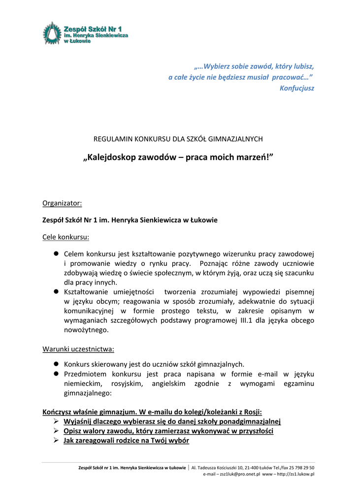 „…Wybierz sobie zawód, który lubisz, a całe życie nie będziesz musiał pracować…” Konfucjusz REGULAMIN KONKURSU DLA SZKÓŁ GIMNAZJALNYCH „Kalejdoskop zawodów – praca moich marzeń!” Organizator: Zespół Szkół Nr 1 im. Henryka Sienkiewicza w Łukowie Cele konkursu: Celem konkursu jest kształtowanie pozytywnego wizerunku pracy zawodowej i promowanie wiedzy o rynku pracy. Poznając różne zawody uczniowie zdobywają wiedzę o świecie społecznym, w którym żyją, oraz uczą się szacunku dla pracy innych. Kształtowanie umiejętności tworzenia zrozumiałej wypowiedzi pisemnej w języku obcym; reagowania w sposób zrozumiały, adekwatnie do sytuacji komunikacyjnej w formie prostego tekstu, w zakresie opisanym w wymaganiach szczegółowych podstawy programowej III.1 dla języka obcego nowożytnego. Warunki uczestnictwa: Konkurs skierowany jest do uczniów szkół gimnazjalnych. Przedmiotem konkursu jest praca napisana w formie e-mail w języku niemieckim, rosyjskim, angielskim zgodnie z wymogami egzaminu gimnazjalnego: Kończysz właśnie gimnazjum. W e-mailu do kolegi/koleżanki z Rosji: Wyjaśnij dlaczego wybierasz się do danej szkoły ponadgimnazjalnej Opisz walory zawodu, który zamierzasz wykonywać w przyszłości Jak zareagowali rodzice na Twój wybór Zespół Szkół nr 1 im. Henryka Sienkiewicza w Łukowie | Al. Tadeusza Kościuszki 10, 21-400 Łuków Tel./fax 25 798 29 50 e-mail – [email protected] www – http://zs1.lukow.pl Rozwiń swoją wypowiedź w każdym z trzech podpunktów, pamiętając, że długość e-maila powinna wynosić od 50 do 100 słów. Oceniana jest umiejętność pełnego przekazania informacji, spójność i logika wypowiedzi oraz zakres i poprawność środków językowych. Praca powinny być tak napisana, aby określając jej główna myśl można było nadać jej jeden z poniższych tytułów: 1. 2. 3. 4. 5. 6. „Postaw na pewną pracę – przedstawiciel handlowy” „Zawód pewnej przyszłości – informatyk” „Moja przyszłość w moich rękach – mechanik” „Praca moich marzeń - technik pojazdów samochodowych” „Mądry wybór, to dobry zawód – elektryk” „Praca z pasją, to szansa na trwały sukces – kierowca mechanik” Nie przyjmujemy prac zbiorowych. Każda szkoła może nadesłać maksymalnie po dwie prace w każdym z języków – niemiecki, rosyjski, angielski (łącznie 6 prac). Prace niezgodne z regulaminem nie będą brane pod uwagę. Każda praca powinna być dokładnie opisana: imię i nazwisko autora, klasa, dokładny adres szkoły, imię i nazwisko opiekuna. Zasady oceniania: Zadanie polega na napisaniu krótkiego (50–100 słów) tekstu użytkowego z elementami opisu, relacjonowania, wyrażania i uzasadniania opinii i uczuć itp., zgodnie ze szczegółowymi wskazówkami podanymi w poleceniu. W każdym poleceniu podane są trzy elementy, które uczeń powinien rozwinąć w wypowiedzi. Każda wypowiedź jest oceniana w następujących kryteriach: treść, spójność i logika wypowiedzi, zakres środków językowych, poprawność środków językowych. Kryteria oceniania wypowiedzi pisemnych są zamieszczone poniżej wraz z krótkim komentarzem. Treść. W ocenie treści bierze się najpierw pod uwagę, do ilu elementów z polecenia uczeń się odniósł w swojej wypowiedzi, a następnie ile z tych elementów rozwinął w zadowalającym stopniu. Wypowiedź kwalifikuje się do jednego z pięciu poziomów zgodnie z Informatorem gimnazjalnym/ Języki obce nowożytne str. 102 Zespół Szkół nr 1 im. Henryka Sienkiewicza w Łukowie | Al. Tadeusza Kościuszki 10, 21-400 Łuków Tel./fax 25 798 29 50 e-mail – [email protected] www – http://zs1.lukow.pl Spójność i logika wypowiedzi. W ocenie spójności bierze się pod uwagę, czy i w jakim stopniu tekst funkcjonuje jako całość dzięki jasnym powiązaniom (np. leksykalnym, gramatycznym) wewnątrz zdań oraz między zdaniami lub akapitami tekstu. W ocenie logiki wypowiedzi bierze się pod uwagę, czy i w jakim stopniu wypowiedź jest klarowna (np. czy nie jest jedynie zbiorem przypadkowych myśli). (zgodnie z Informatorem gimnazjalnym/ Języki obce nowożytne str. 103) Zakres środków językowych. W ocenie zakresu środków językowych bierze się pod uwagę zróżnicowanie struktur leksykalno-gramatycznych użytych w wypowiedzi. (zgodnie z Informatorem gimnazjalnym/ Języki obce nowożytne str. 103) Poprawność środków językowych. W ocenie poprawności środków językowych bierze się pod uwagę błędy gramatyczne, leksykalne i ortograficzne oraz ich wpływ na komunikatywność wypowiedzi. (zgodnie z Informatorem gimnazjalnym/ Języki obce nowożytne str. 103, 104) Nagrody: Na zwycięzców czekają atrakcyjne nagrody rzeczowe i liczne niespodzianki. Jury: Jury wybierze trzy prace (po jednej w każdym języku). Przewidziane są wyróżnienia. Rozstrzygnięcie jury jest ostateczne, od werdyktu nie przysługuje odwołanie. Wyniki konkursu: Wyniki konkursu oraz dokładny termin rozdania nagród zostaną podane na stronie szkoły w zakładkach: Aktualności i Dla Gimnazjalistów/Konkursy. Prace prosimy nadsyłać drogą elektroniczną do 28 lutego 2017r. na adres: [email protected], lub pocztą tradycyjną: Zespół Szkół Nr 1 im. Henryka Sienkiewicza w Łukowie Al. Tadeusza Kościuszki 10 21 – 400 Łuków z dopiskiem „KONKURS”. Opiekunowie projektu: Renata Łozowska-Kopeć, Aneta Domańska-Szklarz, Hanna Michalak SERDECZNIE ZAPRASZAMY DO UDZIAŁU W KONKURSIE Zespół Szkół nr 1 im. Henryka Sienkiewicza w Łukowie | Al. Tadeusza Kościuszki 10, 21-400 Łuków Tel./fax 25 798 29 50 e-mail – [email protected] www – http://zs1.lukow.pl