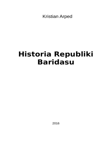 Kristian Arped Historia Republiki Baridasu 2016 © 2016 Kristian Arped Opublikowano w „Heroldzie” www.sarmacja.org/instytucja/profil/D00002 2 Historia Republiki Baridasu Spis treści I Republika................................................................................5 Wybory parlamentarne — jesień 2002 r.........................7 Pierwszy kryzys................................................................10 Przebłysk...........................................................................13 Upadek...............................................................................15 II Republika............................................................................17 Secesja................................................................................19 III Republika...........................................................................23 Konfederacja Juweńska...................................................24 Nowe porządki..................................................................25 Wybory prezydenckie — zima 2005..............................26 Koncept — unia................................................................28 Przewrót Lutowy..............................................................29 Stan wyjątkowy i zmiana ustroju..................................30 3 4 Historia Republiki Baridasu I Republika Republika Baridas (tak, Baridas; nie odmieniano wówczas tej nazwy) powstała 25 czerwca 2002 r. z inicjatywy Krzysztofa „Christofy” Parkoły, który został jej pierwszym prezydentem. Pierwszą stolicą młodej Republiki została Cracoffia. Tego samego miesiąca Baridas rozpoczął proces nawiązywania stosunków dyplomatycznych z innymi mikronacjami. W efekcie, w czerwcu i lipcu Republika nawiązała stosunki dyplomatyczne z Cesarstwem Leblandii, Sułtanatem Al-Farun, Królestwem Podlandu, Chanlandią, Cesarstwem Aztec i Baronią Zarakatą, a krócej mówiąc — z państwami Paktu Leblandzkiego; 30 czerwca 2002 roku Republika Baridasu i Cesarstwo Leblandii podpisały traktat o współpracy, a już 1 lipca 2002 r. Sułtanat Al-Farun otworzył swoją placówkę dyplomatyczną na terytorium Baridasu. Kontakty z dwoma mikronacjami, z którymi Baridas niejednokrotnie w przyszłości będzie wchodził w interakcje — mniej lub bardziej przyjemne, czyli z Królestwem Dreamlandu oraz Księstwem Sarmacji, zostały ustabilizowane 4 lipca tego samego roku. Młody Baridas korzystał w pełni z dobrodziejstw Syriusza — systemu gospodarczego autorstwa Sarmatów, posługując się dinarem (skrót: DN) jako swoją walutą. I Republika 5 Ważnym przełomem w relacjach baridajsko-leblandzkich był tzw. „incydent lipcowo-sierpniowy”: „Wywiady Sułtanatu Al-Farun i Cesarstwa Leblandii podejrzewają powiązania Republiki Baridas z Dreamlandem. Kilka dni później Cesarstwo Leblandii korzystając z luk prawnych młodego państwa jakim jest Baridas tworzy na naszym terenie bazę wojskową. Otwarcie bazy wojskowej rozpoczyna pierwszy konflikt wśród państw wirtualnych. Oficjalne stanowisko Baridasu (które w między czasie szukając wyjścia z całej sytuacji) brzmiało: „Republika jest w stanie zaakceptować obecność wojsk paktu i podejmie chęć rozmów i rozwiązania problemu jaki zaistniał. Jednakże wymogiem zatwierdzenia traktatu jest dopisanie aneksu w którym pakt zapewni brak ingerencji w media, kulturę, gospodarkę i sport, politykę wewnętrzną kraju oraz handel i system bankowy”.1 Konflikt baridajsko-leblandzki był pierwszym tego typu sporem w mikroświecie, który jednak nie trwał długo, bo już 3 września tego samego roku Prezydent Republiki Baridasu zapytał obywateli, czy jest z ich strony chęć pojednania się z Cesarstwem. Tego samego dnia został skierowany do sądu pierwszy w historii Baridasu akt oskarżenia — w dodatku przeciwko cudzoziemcowi, obywatelowi Księstwa Sarmacji — Superchunkowi, o nawoływanie do konfliktu pomiędzy Republiką Baridasu a Księstwem Sarmacji, działanie mające na celu nienależyte funkcjonowanie Republiki oraz znieważanie obywateli Baridasu. Cała sprawa skończyła się 1 6 Krzysztof „Christofo” Parkoła, Powstanie Baridasu (fragment), http://baridas.sarmacja.org/historia_baridasu.html, dostęp: 16.02.2016 Historia Republiki Baridasu ugodowo — akt oskarżenia przeciwko Sarmacie dzień później został wycofany, ze względu na zawarty kompromis oraz zaniechanie przez Superchunka dalszego obrażania Republiki Baridasu. Wybory parlamentarne — jesień 2002 r. 4 września 2002 r. rozpisane zostały przez Prezydenta Republiki Baridasu wybory parlamentarne. Kalendarz obejmował czterodniowy okres zgłaszania kandydatur, sześciodniową kampanię wyborczą, trzydniową ciszę wyborczą oraz głosowanie, które — wg ustalonych terminów — miało planowo się odbyć 29 września tego samego roku. Bezpośrednią reakcją na wybory było powstanie dwóch ugrupowań: Baridaskiej Centro-Prawicy, skupionej wokół Patryka „ciapka” Bita oraz Jana „hidema” Mauscha, oraz Baridaskiej Partii Demokratycznej, załozonej przez Łukasza Iliję Pietraczuka. W wyborach startowało 5 kandydatów: Przemek Rogowski (niezależny), Łukasz Ilija Pietraczuk (BPD), Jan Mausch (BCP), Patryk Bit (BCP), Tomasz Goliński (BCP). Kontrowersje wzbudziła I Republika 7 kandydatura tego przedostatniego — w trakcie kampanii sprawował funkcję sędziego, który — wg części obywateli — powinien pozostać neutralny i apolityczny. Piątka kandydatów została oficjalnie zarejestrowana, a kampania ruszyła z kopyta oraz została zdominowana przez największą wówczas partię w Baridasie — Baridajską Centro-Prawicę. Z jej dość ogólnikowych postulatów rzucał w oczy się następujący, którego pojawienie się zostało spowodowane „incydentem lipcowo-sierpniowym”: „Nasze działania nigdy nie będą zmierzały do przystąpienia Republiki Baridasu do paktów militarnych”.2 Resz