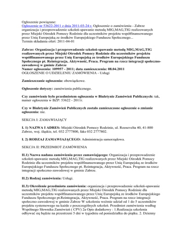Ogłoszenie powiązane: Ogłoszenie nr 53622-2011 z dnia 2011-03-24 r. Ogłoszenie o zamówieniu - Zabrze organizacja i przeprowadzenie szkoleń-spawanie metodą MIG,MAG,TIG realizowanych przez Miejski Ośrodek Pomocy Rodzinie dla uczestników projektu współfinansowanego przez Unię Europejską ze środków Europejskiego Funduszu Społecznego... Termin składania ofert: 2011-04-01 Zabrze: Organizacja i przeprowadzenie szkoleń-spawanie metodą MIG,MAG,TIG realizowanych przez Miejski Ośrodek Pomocy Rodzinie dla uczestników projektu współfinansowanego przez Unię Europejską ze środków Europejskiego Funduszu Społecznego pt. Reintegracja, Aktywność, Praca. Program na rzecz integracji społecznozawodowej w gminie Zabrze Numer ogłoszenia: 109957 - 2011; data zamieszczenia: 08.04.2011 OGŁOSZENIE O UDZIELENIU ZAMÓWIENIA - Usługi Zamieszczanie ogłoszenia: obowiązkowe. Ogłoszenie dotyczy: zamówienia publicznego. Czy zamówienie było przedmiotem ogłoszenia w Biuletynie Zamówień Publicznych: tak, numer ogłoszenia w BZP: 53622 - 2011r. Czy w Biuletynie Zamówień Publicznych zostało zamieszczone ogłoszenie o zmianie ogłoszenia: nie. SEKCJA I: ZAMAWIAJĄCY I. 1) NAZWA I ADRES: Miejski Ośrodek Pomocy Rodzinie, ul. Roosevelta 40, 41-800 Zabrze, woj. śląskie, tel. 032 2777800, faks 032 2777802. I. 2) RODZAJ ZAMAWIAJĄCEGO: Administracja samorządowa. SEKCJA II: PRZEDMIOT ZAMÓWIENIA II.1) Nazwa nadana zamówieniu przez zamawiającego: Organizacja i przeprowadzenie szkoleń-spawanie metodą MIG,MAG,TIG realizowanych przez Miejski Ośrodek Pomocy Rodzinie dla uczestników projektu współfinansowanego przez Unię Europejską ze środków Europejskiego Funduszu Społecznego pt. Reintegracja, Aktywność, Praca. Program na rzecz integracji społeczno-zawodowej w gminie Zabrze. II.2) Rodzaj zamówienia: Usługi. II.3) Określenie przedmiotu zamówienia: organizacja i przeprowadzenie szkoleń-spawanie metodą MIG,MAG,TIG realizowanych przez Miejski Ośrodek Pomocy Rodzinie dla uczestników projektu współfinansowanego przez Unię Europejską ze środków Europejskiego Funduszu Społecznego pt.Reintegracja, Aktywność, Praca. Program na rzecz integracji społeczno-zawodowej w gminie Zabrze W szkoleniu weźmie udział od 1 do 5 uczestników projektu systemowego na każde z poszczególnych szkoleń. Przedmiot zamówienia według Wspólnego Słownika Zamówień ( CPV) 2a Opis dodatkowy : 1.Realizacja szkolenia odbywać się będzie na przestrzeni 5 dni w tygodniu od poniedziałku do piątku. 2. Dzienny wymiar godzin dydaktycznych nie powinien przekroczyć 5 godzin lekcyjnych ( 1 godzina lekcyjna = 45 minut) z uwzględnieniem przerwy kawowej 15 minut oraz przerwy na obiad 30 minut. 3. Ilość godzin szkolenia na każdego uczestnika: - Spawanie metodą MIG(131) w zakresie podstawowym : 151 w tym zajęć praktycznych min.120 oraz 31 teoretycznych; Spawanie metodą MAG(135) w zakresie podstawowym : 145 w tym zajęć praktycznych min.120 oraz 25 teoretycznych; - Spawanie metodą TIG (141) w zakresie podstawowym: 103 w tym zajęć praktycznych min. 90 oraz 13 teoretycznych; 4. Miejsce realizacji szkolenia pomieszczenia i ośrodki na terenie miasta Zabrze lub w odległości do 30 km od Zabrza. 5. Minimalny program szkolenia musi być zgodny z wytycznym Instytutu Spawalnictwa w Gliwicach i zgodny ze standardami kwalifikacji zawodowych. 6. Warunki lokalowe, sale szkoleniowe oraz wykorzystywany sprzęt muszą spełniać wymogi prawne w zakresie BHP i p.poż. Zapewnione pomieszczenie,sala wyposażona będzie w odpowiednią do liczby uczestników liczbę stolików i miejsc siedzących, właściwie oświetloną, ogrzewaną, przewietrzaną i odizolowaną od innych pomieszczeń. 7. Organizator kursu zapewnia : sprzęt niezbędny do przeprowadzenia szkolenia , odzież ochronną ( spodnie, kurtka, buty-wydawaną po zakończeniu kursu na własność uczestników ), a także inne elementy stroju roboczego wypożyczanego uczestnikom, materiały szkoleniowe w tym jeden dodatkowy do dokumentacji projektu, egzamin wewnętrzny, stanowiska do praktycznych zajęć na rzeczywistych, przemysłowych stanowiskach spawalniczych - Wykonawca zapewni kursantowi odpowiednie przeszkolenie do pracy na takich stanowiskach. 8. W koszt kursu należy doliczyć opłatę za badania lekarskie o braku przeciwwskazań do wykonywania zawodu, które należy przeprowadzić na początku szkolenia. W przypadku negatywnego wyniku badań Zamawiający zapłaci jedynie za koszt badań lekarskich na podstawie przedstawionej faktury VAT. W koszt należy wliczyć opłatę za egzamin na zdobycie uprawnień - książeczki spawacza wg. wymogów norm europejskich w ilości jednego podejścia dla każdego uczestnika. 9. Organizator kursu zapewnia w kosztach zajęć teoretycznych i praktycznych usługę cateringu rozumianą jako przygotowanie i serwowanie posiłków, przez które Zamawiający rozumie podanie uczestnikom szkolenia w trakcie jednego dnia szkolenia praktycznego i teoretycznego dobrej jakości kawy, herbaty, kruchych ciastek (min 50 g na osobę) oraz zimnych napojów (wody i mineralnej i soków) w ilości 0,5l na osobę, a także ciepłego dwudaniowego obiadu na który składać się będzie np. : zupa oraz mięso ok.250 - 300g, ziemniaki lub frytki lub ryż oraz sałatka. Zamawiający nie dopuszcza możliwości serwowania jako obiadu gotowych dań typu fast food oraz gotowych sproszkowanych zup. Waga podanych porcji liczona jest osobno na danie pierwsze i drugie. 10. Zaświadczenia, certyfikaty, materiały szkoleniowe, program szkolenia, ankiety ewaluacyjne muszą posiadać informację: Szkolenie realizowane na potrzeby projektu współfinansowanego przez Unię Europejską ze środków Europejskiego Funduszu Społecznego pt.Reintegracja, Aktywność, Praca. Program na rzecz integracji społecznozawodowej w gminie Zabrze oraz oznaczenia logo EFS, Unii Europejskiej i logo PO KL zgodnie z zasadą wizualizacji dostępną na stronie ww