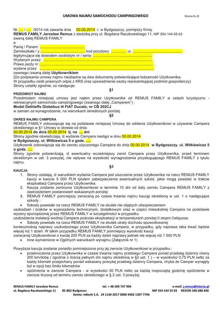 UMOWA NAJMU SAMOCHODU CAMPINGOWEGO Strona 1 z 2 Nr …. / …. /2014 rok zawarta dnia 00.00.2014 r. w Bydgoszczy, pomiędzy firmą: REMUS FAMILY Jarosław Remus z siedzibą przy ul. Bogdana Raczkowskiego 11, NIP 554-144-55-03 zwaną dalej REMUS FAMILY a Panią / Panem ........................................... Zamieszkała / y ........................................... kod pocztowy ............... ul. ................................................ legitymująca się dowodem osobistym nr / seria: ......................................................... Wydanym przez: ......................................................................................................... , Prawo jazdy nr .............................................................................................................. , wydane przez .............................................................................................................. zwanego /zwaną dalej Użytkownikiem (Do podpisania umowy najmu niezbędne są dwa dokumenty potwierdzające tożsamość Użytkownika. W przypadku osób prawnych odpis z KRS oraz upoważnienie osoby reprezentującej podmiot gospodarczy) Strony ustaliły zgodnie, co następuje: §1 PRZEDMIOT NAJMU Przedmiotem niniejszej umowy jest najem przez Użytkownika od REMUS FAMILY w celach turystyczno rekreacyjnych samochodu campingowego (zwanego dalej „Camperem”) : Model Dethleffs Globebus I4 FIAT Ducato, nr CB 202CJ w zamian za wynagrodzenie, na warunkach określonych poniżej. §2 OKRES NAJMU CAMPERA REMUS FAMILY zobowiązuje się na podstawie niniejszej Umowy do oddania Użytkownikowi w używanie Campera określonego w §1 Umowy w okresie od dnia: 00.00.2014 do dnia 00.00.2014 tj. na … dni Strony zgodnie oświadczają, iż wydanie Campera nastąpi w dniu 00.00.2014 w Bydgoszczy, ul. Witkiewicza 5 o godz. …. Użytkownik zobowiązuje się do zwrotu użyczonego Campera do dnia 00.00.2014 w Bydgoszczy, ul. Witkiewicza 5 o godz. …. Strony zgodnie potwierdzają, iż ewentualny wcześniejszy zwrot Campera przez Użytkownika, przed terminem określonym w ust. 3 powyżej, nie wpływa na wysokość wynagrodzenia przysługującego REMUS FAMILY z tytułu najmu. §3 KAUCJA 1. Strony ustalają, iż warunkiem wydania Campera jest uiszczenie przez Użytkownika na rzecz REMUS FAMILY kaucji w kwocie 5 000 PLN tytułem zabezpieczenia ewentualnych szkód, jakie mogą powstać w trakcie eksploatacji Campera przez Użytkownika. 2. Kaucja zostanie zwrócona Użytkownikowi w terminie 10 dni od daty zwrotu Campera REMUS FAMILY z zastrzeżeniem postanowień wskazanych poniżej: 3. REMUS FAMILY pomniejszy zwracaną po czasie trwania najmu kaucję określoną w ust. 1 o następujące szkody : Szkody powstałe na rzecz REMUS FAMILY na skutek nie objętych ubezpieczeniem uszkodzeń i braków w wyposażeniu technicznym, dodatkowym oraz w części mieszkalnej Campera na podstawie wyceny sporządzonej przez REMUS FAMILY w szczególności w przypadku uszkodzenia instalacji wodnej Campera podczas eksploatacji w temperaturach poniżej 0 stopni Celsjusza. Szkody powstałe na rzecz REMUS FAMILY na skutek utraty dochodu spowodowanej koniecznością naprawy uszkodzonego przez Użytkownika Campera, w przypadku, gdy naprawa taka trwać będzie więcej niż 1 dzień. W takim przypadku REMUS FAMILY pomniejszy wysokość kaucji zwracanej Użytkownikowi o kwotę 200 PLN za każdy dzień naprawy jednak nie więcej niż 1 000 PLN Inne wymienione w Ogólnych warunkach wynajmu (Załącznik nr 1) Powyższa kaucja zostanie ponadto pomniejszona przy jej zwrocie Użytkownikowi w przypadku : przekroczenia przez Użytkownika w czasie trwania najmu przebiegu Campera ponad przebieg dzienny równy 200 km/dobę ( zgodnie z ilością pełnych dni najmu określoną w §2 ust. 1 ) – w wysokości 0,75 PLN netto za każdy kilometr przejechany ponad wskazany powyżej przebieg dzienny Campera, chyba że Camper wynajęty był w opcji bez limitu kilometrów opóźnienia w zwrocie Campera - w wysokości 50 PLN netto za każdą rozpoczętą godzinę opóźnienia w zwrocie liczoną od terminu zwrotu określonego w § 2 ust. 3 powyżej REMUS FAMILY Jarosław Remus ul. Bogdana Raczkowskiego 11 tel. + 48 509 747 904 e-mail: [email protected] 85-862 Bydgoszcz NIP 554 144 55 03 REGON 340 688 846 Konto: mBank S.A. 19 1140 2017 0000 4902 1307 7796 UMOWA NAJMU SAMOCHODU CAMPINGOWEGO Strona 2 z 2 §4 WYNAGRODZENIE Tytułem wynagrodzenia za używanie samochodu campingowego określonego w §1 Umowy Użytkownik zobowiązuje się do zapłaty kwoty: ....................................... PLN Netto powiększonej o podatek VAT w wysokości 23 % tj.: ....................................... PLN Brutto (słownie : ......................................................................................................................................../100 ) + kaucja 5 000,00 PLN Brutto ..............................................................................................................................RAZEM DO ZAPŁATY Wynagrodzenie będzie płatne w następujących transzach: I TRANSZA ........................................PLN Brutto – zaliczka, wpłata na konto do dnia 00.00.2014 II TRANSZA ........................................PLN Brutto – wpłata na konto do dnia 00.00.2014 5 000,00 PLN Brutto – kaucja, wpłata na konto do dnia 00.00.2014 Zapłata wskazanego powyżej wynagrodzenia nastąpi przelewem na wskazany poniżej rachunek bankowy: mBank S.A. 19 1140 2017 0000 4902 1307 7796 §5 ZOBOWIĄZANIA I OŚWIADCZENIA UŻYTKOWNIKA 1. Użytkownik zobowiązuje się korzystać z Campera wyłącznie w celach rekreacyjno - turystycznych. Tym samym zabronione jest użytkowanie Campera w jakichkolwiek innych celach. 2. Użytkownik zobowiązuje się do nie oddawania Campera w czasie trwania najmu w dalszy podnajem innym osobom. Ponadto Użytkownik nie może użytkować Campera w następujących celach: udział w imprezach samochodowych, testac