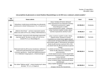 Tarnów, 27 maja 2014 r. SPR.3020.7.2014 Lista projektów do głosowania w ramach Budżetu Obywatelskiego na rok 2015 wraz z nadanymi „kodami projektu”. Kod projektu Nazwa zadania 01 Rozbudowa i modernizacja monitoringu oraz odnowienie pomieszczeń w Szkole Podstawowej nr 15, ul. Krupnicza 8. 02 „Bajkowe dzieciństwo” - wymiana wyposażenia ogrodu zabaw oraz szatni w PP nr 26, ul. Bitwy o Wał Pomorski 11. 03 Modernizacja i utworzenie strefy aktywnego wypoczynku „Sportowy ogród” dla dzieci w wieku od 2 do 6 lat na terenie PP nr 6, ul. Waryńskiego 19. 04 05 Opis - zakup i instalacja 24 kamer cyfrowych - zakup rejestratorów oraz wykonanie instalacji; - odnowienie pomieszczeń i ciągów komunikacyjnych w szkole; - remont pomieszczeń w szkole – malowanie. - zakup i wymiana urządzeń na placu zabaw; - wymiana wyposażenia szkolnych szatni; - zakup i wymiana urządzeń na placu zabaw; - sadzenie drzew i krzewów na terenie Przedszkola oraz modernizacja ciągów pieszych. - wykorzystanie istniejącej podbudowy asfaltowej (stare boisko wzdłuż ul. Narutowicza), do budowy boiska do piłki ręcznej o wymiarze 22m x 42m oraz dwóch boisk do piłki koszykowej (w poprzek boiska) Wykonanie boisk do piłki ręcznej, koszykowej i siatkowej o - na działce od strony ul. Bema powstanie nowe boisko do piłki siatkowej o nawierzchni nawierzchni poliuretanowej wraz z wyposażeniem i poliuretanowej; remontem ogrodzenia – Zespół Szkół Ogólnokształcących - z boisko będzie korzystać również Zespół Szkół nr 6 z Oddziałami Integracyjnymi, ul. Bandrowskiego 4. Ekonomiczno-Gastronomicznych, a także młodzież z terenu Starówki - szkoła posiada projekt wykonawczy ogrodzenia terenu, na którym będzie zlokalizowane boisko dwufunkcyjne - zakup urządzeń ogrodowych na plac zabaw dla Plac zabaw "Bajkowy ogród" - miejsce bezpiecznych zabaw dzieci; dla dzieci - PP nr 3, ul. Chopina 8. - dostępny również dla mieszkańców; Koszt Osiedle 150 000,00 zł Grabówka 50 000,00 zł Jasna 150 000,00 zł Starówka 300 000,00 zł Starówka 100 000,00 zł Starówka - dołączono kosztorys zakupu urządzeń na plac zabaw 06 07 08 09 - modernizacja i przebudowa wejścia głównego do placówki; - wymiana stolarki okiennej oraz grzejników, wymalowanie części pomieszczeń; - doposażenie w sprzęt komputerowy, maszynę „Bądź wsparciem w realizacji naszych pasji”- modernizacja do szycia, kserokopiarkę, drukarkę, placu zabaw i świetlicy – PP nr 20, ul. Sportowa 4. specjalistyczne pomoce i oprogramowanie komputerowe do pracy logopedycznej i socjoterapeutycznej; - doposażenie placu zabaw; - doposażenie świetlicy. - remont nawierzchni asfaltowej; - lekkie powiększenie boiska; - docelowo ma to być boisko wielofunkcyjne i plac dla modelarzy oraz miasteczko rowerowe z Remont boiska asfaltowego na terenie Pałacu Młodzieży, infrastrukturą drogową, tor do wyścigów zwiększający możliwości jego wykorzystania – ul. rowerowych; Piłsudskiego 24. - wniosek z wyceną obejmują wykonanie robót ziemnych, kanalizacyjnych, położenie warstwy asfaltowej, usunięcie ogrodzenia, przeniesienie i naprawę podestu; - usunięcie nieodpowiednich elementów z terenu placu; - odnowienie miasteczka drogowego; Modernizacja placu zabaw przy PP nr 24, ul. Westerplatte - wymiana nawierzchni betonowej na placu do 11 występów na nawierzchnię atestowaną; - modernizacja piaskownic; - montaż nowoczesnych i bezpiecznych urządzeń. - burzenie niebezpiecznych elementów betonowych; „Bezpieczny ogród radosnym miejscem naszych zabaw”, - częściowa wymiana ogrodzenia; PP 18, ul. Westerplatte 10 - renowacja ogrodu – ławki, sprzęty, urządzenia; - zakup i montaż nowych sprzętów; 85 000,00 zł Krakowska 298 000,00 zł Starówka 223 000,00 zł Westerplatte 100 000,00 zł Westerplatte - wyrównanie terenu, wzbogacenie ogrodu w nowe rośliny. 10 11 12 13 14 15 - wykonanie mini amfiteatru z drewna z wyposażeniem – podest, ławeczki, stoliki; - możliwość pobytu na zewnątrz bez względu na „Mini-amfiteatr z wyposażeniem” - ogród przy PP nr 19 pogodę; ul. Paderewskiego 24 - prowadzenie imprez środowiskowych, uroczystości, pikników; - prowadzenie zajęć z muzyki, plastyki, techniki. - remont chodników wokół szkoły – ok. 800m2; Remont infrastruktury SP9- ul. Marii Dąbrowskiej 6 - konserwacja i malowanie ogrodzenia szkoły; - modernizacja boiska - szkoła nie posiada miejsca na prowadzenie zajęć wychowania fizycznego; - adaptacja terenu za budynkiem szkoły – bieżnia Urządzenie placu rekreacyjno-sportowego dla uczniów do skoku w dal, Zespołu Szkół Muzycznych, ul. Lippóczyego 4 - budowa niewymiarowego boiska do siatkówki, równoważni; - zakup szlabanu i wykonanie wiatrołapu przy wejściu do szkoły. - z boiska korzystają: SP2, Niepubliczne Modernizacja i remont przyszkolnego wielofunkcyjnego Gimnazjum „U Konarskiego”, Międzyszkolny boiska sportowego z uwzględnieniem skoczni w dal – SP 2, Uczniowski Klub Sportowy „Sokół” Gumniska oraz ul. Szewska 7. harcerze „Bezpiecznie poruszamy się przy Gimnazjum nr 4” remont drogi wewnątrzszkolnej i pożarowej z wymianą bramy wjazdowej, ul. Bitwy pod Studziankami 5 - główna droga dojazdowa do SP8 oraz Gim. 4; - poprawa bezpieczeństwa na osiedlu - wymiana urządzeń zabawowych na placu zabaw: piaskownice, huśtawki, bujaki, karuzela, sprężynowce, zestawy sprawnościowe z wieżą, Utworzenie międzypokoleniowego mini-parku równoważnie, zjeżdżalnie, drabinki, pociąg; rekreacyjnego "Od przedszkola do seniora" przy PP29 oraz kompleksowa wymiana wyposażenia i pomocy - kilka stanowisk siłowni plenerowej; dydaktycznych w PP29 - ul. Wilsona 50 - stoły do gry w szachy; - postawienie ławek i koszy na śmieci; - wymiana mebelków dla dzieci w PP29; 30 000,00 zł Piaskówka 278 104,00 zł Rzędzin 70 000,00 zł Piaskówka 274 290,00 zł Gumniska 297 660,00 zł Jasna 200 000,00 zł Strusina - zakup pomoc