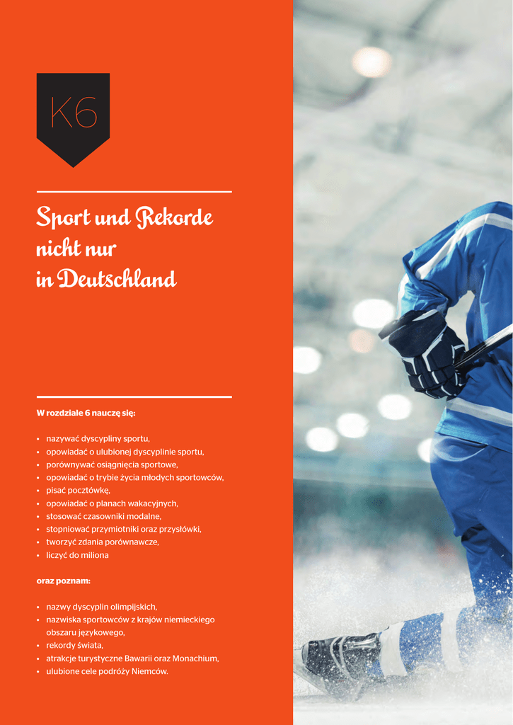 K6 Sport und Rekorde nicht nur in Deutschland W rozdziale 6 nauczę się: • • • • • • • • • • nazywać dyscypliny sportu, opowiadać o ulubionej dyscyplinie sportu, porównywać osiągnięcia sportowe, opowiadać o trybie życia młodych sportowców, pisać pocztówkę, opowiadać o planach wakacyjnych, stosować czasowniki modalne, stopniować przymiotniki oraz przysłówki, tworzyć zdania porównawcze, liczyć do miliona oraz poznam: • nazwy dyscyplin olimpijskich, • nazwiska sportowców z krajów niemieckiego obszaru językowego, • rekordy świata, • atrakcje turystyczne Bawarii oraz Monachium, • ulubione cele podróży Niemców. Sport und Rekorde nicht nur in Deutschland K6 Wie heißen die Sportarten? L1 65 1 2 Sportarten. Hör zu und sprich nach. Trage dann die fehlenden Wörter ein. Dyscypliny sportowe. Posłuchaj i powtórz. Następnie wpisz brakujące słowa. A B C Hockey D Ski Alpin F G H I Boxen E Ski springen J Verbinde die Namen der Sportler mit den Sportarten und bilde Sätze gemäß dem Beispiel. Połącz nazwiska sportowców z właściwymi dyscyplinami sportu i utwórz zdania według przykładu. Sportler / Sportlerin Sebastian Vettel Roger Federer Maria Höfl-Riesch Gregor Schlierenzauer Simon Ammann Sportart Ski alpin Skispringen Formel 1 Tennis Skispringen Maria Höfl-Riesch kommt aus Deutschland. Sie macht Ski alpin. Roger Federer … 3 Ordne den Fragen die richtigen Antworten zu und beantworte dann die Fragen in ganzen Sätzen. Przyporządkuj pytaniom właściwe odpowiedzi i odpowiedz na pytania całymi zdaniami. 1. Wo trainierst du? 2. Was möchtest du machen? 3. Was spielt ihr? 4. Wie heißt dein Lieblingssportler? 66 4 A. Basketball. B. In der Sporthalle. C. Thomas Müller. D. Sport machen. Mach die Ausspracheübung auf der Seite 193. Przejdź na stronę 193 i ćwicz wymowę. Znam nazwy popularnych dyscyplin sportu. Potrafię wymienić sportowców z krajów niemieckiego obszaru językowego. 162 einhundertzweiundsechzig LEKTION 1 Hausaufgabe H1 1 Połącz linią niemiecką nazwę dyscypliny sportu z nazwą angielską. ski jumping Laufen Basketball football basketball Boxen Fußball alpine skiing swimming Gehen Ski alpin boxing 2 run Schwimmen Skispringen race walking Znajdź nazwy dyscyplin sportu i je zaznacz. 1. SKIVOLLEYBALLING 4. BASKEHANDBALLUNG 2. ALPINHOCKEYJUMP 5. AUFJUDOSPOR 3. BALTENNISRUN 3 Napisz zdania poprawnie. Pamiętaj o interpunkcji i o pisowni rzeczowników wielką literą. 1. SIMONAMMANNKOMMTAUSDERSCHWEIZERMACHTSKISPRINGEN 2. MARIAHÖFL-RIESCHKOMMTAUSDEUTSCHLANDSIEMACHTSKIALPIN 3. ROGERFEDERERKOMMTAUSDERSCHWEIZERSPIELTTENNIS 4. GREGORSCHLIERENZAUERKOMMTAUSÖSTERREICHERMACHTSKISPRINGEN 5. SEBASTIANVETTELKOMMTAUSDEUTSCHLANDERFÄHRTFORMEL1 4 Uzupełnij „sp” lub „sch” i wpisz odpowiednio wyrazy. ielen • wimmen • „sp“ 163 einhundertdreiundsechzig weiz • ort • Ski ringen • ortler „sch“ Sport und Rekorde nicht nur in Deutschland K6 Machst du Sport? Bist du aktiv? L2 1 Internetforum „Machst du Sport? Bist du aktiv?“ Lies die Aussagen der Jugendlichen und trage ihre Namen ein. Forum młodzieżowe w Internecie „Czy uprawiasz sport? Jesteś aktywny?”. Przeczytaj wypowiedzi nastolatków i wpisz ich imiona. 22.06.2012 Wolfi Ich spiele Fußball im Sportverein. Ich habe zweimal in der Woche Training. Macht ihr Sport? Seid ihr aktiv? Antwort 25.06.2012 Lukas Ich bin in einem Verein und bin sehr aktiv. Ich trainiere Schwimmen siebenmal in der Woche. Antwort 27.06.2012 Toni Ich mache gern Aikido und Judo. Ich spiele auch gern Badminton. 06.07.2012 Marita Regelmäßig mache ich nur Schulsport. Meine Freunde spielen täglich Handball. Ich mache nicht gern Sport. 1. und in einem Verein. 2. macht gern Judo. 2 trainieren 3. 4. 5. Antwort trainiert zweimal in der Woche. macht Wassersport. mag nicht Sport. Welches Wort passt nicht? Streiche es durch. Przekreśl wyraz, który nie pasuje do pozostałych. 1. in der Schule – in der Woche – in der Halle 2. gern – zweimal in der Woche – regelmäßig – oft 3 Antwort 3. Badminton – Aikido – Judo – Boxen 4. Handball – Basketball – Fußball – Schwimmen Arbeitet zu zweit. Fragt und antwortet. Pracujcie w parach. Zadawajcie pytania i na nie odpowiadajcie. Welchen Sport machst du? Was spielst du gern? Ich mache … / Ich spiele … / Ich trainiere … Wie oft trainierst du? Ich trainiere einmal / zweimal in der Woche / regelmäßig / täglich. Wo trainierst du? Ich trainiere in der Schule / im Verein / in der Sporthalle. Wie heißt dein Lieblingssportler? Mein Lieblingssportler heißt Sebastian Vettel. Er ist … 4 Sieh dir das Foto auf der Titelseite des Kapitels an und beantworte die Fragen. Popatrz na zdjęcie na stronie tytułowej rodziału i odpowiedz na pytania. Wo ist der Junge? • Was trainert er? 67 5 Mach die Ausspracheübung auf der Seite 193. Przejdź na stronę 193 i ćwicz wymowę. Umiem powiedzieć, jaką dyscyplinę sportu uprawiam. Potrafię poinformować, jak często uprawiam sport. 164 einhundertvierundsechzig LEKTION 2 Hausaufgabe H2 1 Ułóż z sylab czasowniki i zapisz powstałe zwroty. 1. Judo CHEN • MA 2. Fußball LEN • SPIE 3. Schwimmen REN • TRAI • NIE 4. Sport GEN • MÖ 5. Training BEN • HA 2 Przyporządkuj odpowiednio wyrazy i wyrażenia. im Verein • Aikido • in der Schule • einmal in der Woche • Handball • täglich welchen Sport? wo? wie oft? 3 , , , Przekreśl zdjęcie niepasujące do wyrażenia. A B A 1. Wassersport machen A B 2. Badminton spielen B A 3. Basketball spielen B 4. aktiv sein A B 5. Schulsport machen 4 Zaznacz właściwą końcówkę przymiotnika. 1. 2. 3. 165 täg regelmäß sport -ig -ig -ig einhundertfünfundsechzig -lich -lich -lich 4. 5. langweil freund -ig -ig -lich -lich Sport und Rekorde nicht nur in Deutschland K6 Er muss Sport machen L3 68 1 Hör dir die Sätze an und verbinde sie mit den polnischen Entsprechungen. Posłuchaj zdań i połącz je z polskimi tłumaczeniami. 1