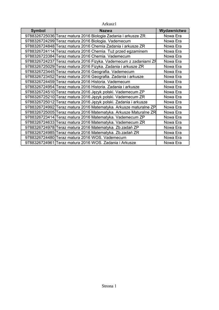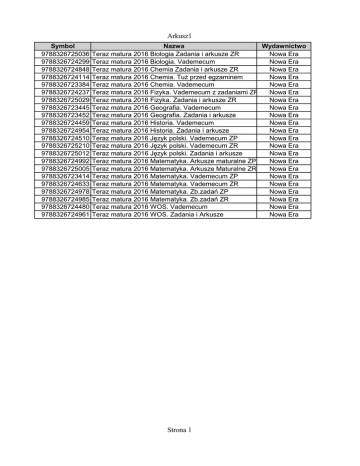 Arkusz1 Symbol 9788326725036 9788326724299 9788326724848 9788326724114 9788326723384 9788326724237 9788326725029 9788326723445 9788326723452 9788326724459 9788326724954 9788326724510 9788326725210 9788326725012 9788326724992 9788326725005 9788326723414 9788326724633 9788326724978 9788326724985 9788326724480 9788326724961 Nazwa Wydawnictwo Teraz matura 2016 Biologia Zadania i arkusze ZR Nowa Era Teraz matura 2016 Biologia. Vademecum Nowa Era Teraz matura 2016 Chemia Zadania i arkusze ZR Nowa Era Teraz matura 2016 Chemia. Tuż przed egzaminem Nowa Era Teraz matura 2016 Chemia. Vademecum Nowa Era Teraz matura 2016 Fizyka. Vademecum z zadaniami ZR Nowa Era Teraz matura 2016 Fizyka. Zadania i arkusze ZR Nowa Era Teraz matura 2016 Geografia. Vademecum Nowa Era Teraz matura 2016 Geografia. Zadania i arkusze Nowa Era Teraz matura 2016 Historia. Vademecum Nowa Era Teraz matura 2016 Historia. Zadania i arkusze Nowa Era Teraz matura 2016 Język polski. Vademecum ZP Nowa Era Teraz matura 2016 Język polski. Vademecum ZR Nowa Era Teraz matura 2016 Język polski. Zadania i arkusze Nowa Era Teraz matura 2016 Matematyka. Arkusze maturalne ZP Nowa Era Teraz matura 2016 Matematyka. Arkusze Maturalne ZR Nowa Era Teraz matura 2016 Matematyka. Vademecum ZP Nowa Era Teraz matura 2016 Matematyka. Vademecum ZR Nowa Era Teraz matura 2016 Matematyka. Zb.zadań ZP Nowa Era Teraz matura 2016 Matematyka. Zb.zadań ZR Nowa Era Teraz matura 2016 WOS. Vademecum Nowa Era Teraz matura 2016 WOS. Zadania i Arkusze Nowa Era Strona 1