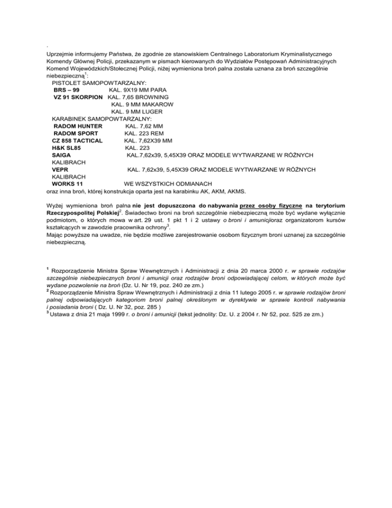 · Uprzejmie informujemy Pañstwa, ¿e zgodnie ze stanowiskiem Centralnego Laboratorium Kryminalistycznego Komendy Gùównej Policji, przekazanym w pismach kierowanych do Wydziaùów Postêpowañ Administracyjnych Komend Wojewódzkich/Stoùecznej Policji, ni¿ej wymieniona broñ palna zostaùa uznana za broñ szczególnie 1 niebezpieczn¹ : PISTOLET SAMOPOWTARZALNY: BRS – 99 KAL. 9X19 MM PARA VZ 91 SKORPION KAL. 7,65 BROWNING KAL. 9 MM MAKAROW KAL. 9 MM LUGER KARABINEK SAMOPOWTARZALNY: RADOM HUNTER KAL. 7,62 MM RADOM SPORT KAL. 223 REM CZ 858 TACTICAL KAL. 7,62X39 MM H&K SL85 KAL. 223 SAIGA KAL.7,62x39, 5,45X39 ORAZ MODELE WYTWARZANE W RÓÝNYCH KALIBRACH VEPR KAL. 7,62x39, 5,45X39 ORAZ MODELE WYTWARZANE W RÓÝNYCH KALIBRACH WORKS 11 WE WSZYSTKICH ODMIANACH oraz inna broñ, której konstrukcja oparta jest na karabinku AK, AKM, AKMS. Wy¿ej wymieniona broñ palna nie jest dopuszczona do nabywania przez osoby fizyczne na terytorium 2 Rzeczypospolitej Polskiej . Úwiadectwo broni na broñ szczególnie niebezpieczn¹ mo¿e byã wydane wyù¹cznie podmiotom, o których mowa w art. 29 ust. 1 pkt 1 i 2 ustawy o broni i amunicjioraz organizatorom kursów 3 ksztaùc¹cych w zawodzie pracownika ochrony . Maj¹c powy¿sze na uwadze, nie bêdzie mo¿liwe zarejestrowanie osobom fizycznym broni uznanej za szczególnie niebezpieczn¹. 1 Rozporz¹dzenie Ministra Spraw Wewnêtrznych i Administracji z dnia 20 marca 2000 r. w sprawie rodzajów szczególnie niebezpiecznych broni i amunicji oraz rodzajów broni odpowiadaj¹cej celom, w których mo¿e byã wydane pozwolenie na broñ (Dz. U. Nr 19, poz. 240 ze zm.) 2 Rozporz¹dzenie Ministra Spraw Wewnêtrznych i Administracji z dnia 11 lutego 2005 r. w sprawie rodzajów broni palnej odpowiadaj¹cych kategoriom broni palnej okreœlonym w dyrektywie w sprawie kontroli nabywania i posiadania broni ( Dz. U. Nr 32, poz. 285 ) 3 Ustawa z dnia 21 maja 1999 r. o broni i amunicji (tekst jednolity: Dz. U. z 2004 r. Nr 52, poz. 525 ze zm.)
