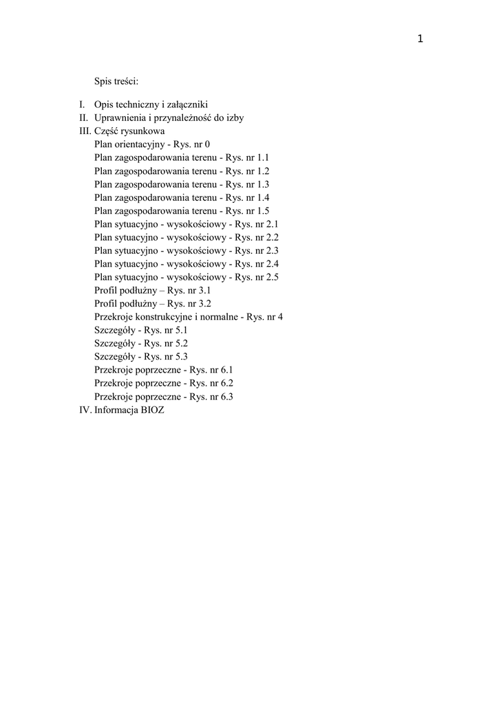 1 Spis treści: I. Opis techniczny i załączniki II. Uprawnienia i przynależność do izby III. Część rysunkowa Plan orientacyjny - Rys. nr 0 Plan zagospodarowania terenu - Rys. nr 1.1 Plan zagospodarowania terenu - Rys. nr 1.2 Plan zagospodarowania terenu - Rys. nr 1.3 Plan zagospodarowania terenu - Rys. nr 1.4 Plan zagospodarowania terenu - Rys. nr 1.5 Plan sytuacyjno - wysokościowy - Rys. nr 2.1 Plan sytuacyjno - wysokościowy - Rys. nr 2.2 Plan sytuacyjno - wysokościowy - Rys. nr 2.3 Plan sytuacyjno - wysokościowy - Rys. nr 2.4 Plan sytuacyjno - wysokościowy - Rys. nr 2.5 Profil podłużny – Rys. nr 3.1 Profil podłużny – Rys. nr 3.2 Przekroje konstrukcyjne i normalne - Rys. nr 4 Szczegóły - Rys. nr 5.1 Szczegóły - Rys. nr 5.2 Szczegóły - Rys. nr 5.3 Przekroje poprzeczne - Rys. nr 6.1 Przekroje poprzeczne - Rys. nr 6.2 Przekroje poprzeczne - Rys. nr 6.3 IV. Informacja BIOZ 2 OPIS TECHNICZNY do projektu budowlano - wykonawczego, budowy ciągu pieszo - rowerowego wzdłuż ul. Kołobrzeskiej, ul. Szybowników, ul. Spadochroniarzy wraz z sygnalizacją wzbudną i budową oświetlenia ulicznego. 1. Podstawa opracowania 1.1. Mapa sytuacyjno - wysokościowa terenu opracowania, sporządzona przez Usługi Geodezyjne „GeoMARK” ul. Szosa Dworcowa 36B, 64-731 Drawski Młyn, aktualna na dzień 05.10. 2012 r. 1.2. Rozporządzenie Ministra Transportu i Gospodarki Morskiej z dnia 02.03.1999 r. w sprawie warunków technicznych jakim powinny odpowiadać drogi publiczne i ich usytuowanie. ( Dz. Ustaw Nr 43 z 14.05.1999 r. ) 1.3. Normy projektowania poszczególnych elementów robót drogowych i ziemnych. 1.4. Wizja projektanta w terenie i inwentaryzacja istniejącej nawierzchni. 1.5. Projekt budowlany budowy ciągu pieszo - rowerowego wzdłuż ul. Kołobrzeskiej, ul. Szybowników, ul. Spadochroniarzy wraz z sygnalizacją wzbudną i budową oświetlenia ulicznego oraz pozwolenie na budowę. 2. Cel i zakres opracowania Niniejszym projektem budowlano - wykonawczym objęta jest budowa ciągu pieszo - rowerowego wzdłuż ul. Kołobrzeskiej, ul. Szybowników, ul. Spadochroniarzy wraz z sygnalizacją wzbudną i budową oświetlenia ulicznego. Długość projektowanego ciągu wynosi 1191,66 m. Szerokość ścieżki rowerowej wynosi 2,00 m a szerokość chodnika 1,50 m z miejscowym przewężeniem na ul. Kołobrzeskiej do 1,00 m. Opracowanie zawiera także przebudowę odcinka jezdni ul. Kołobrzeskiej o długości 129,97 m i szerokości 6,00 m. W oddzielnych tomach zawarto projekt oświetlenia ulic na długości projektowanego ciągu pieszo - rowerowego, projekt usunięcia kolizji z istniejącymi latarniami na ul. Kołobrzeskiej oraz projekt sygnalizacji wzbudnej na przejściu ścieżki rowerowej i chodnika w ul. Koszalińskiej. Zestawienie projektowanych powierzchni: - ścieżka rowerowa – 2154,00 m2 - chodnik – 1670,00 m2 - zjazdy – 630,00 m2 ( chodnik 215,00 m2 + ścieżka 415,00 m2 ) - pas zieleni – 66,00 m2 - przebudowywana jezdnia i poszerzenia – 719,00 m2 + 143,00 m2 = 862,00 m2 3. Opis stanu istniejącego Projektowany ciąg pieszo - rowerowy zlokalizowany jest na działkach nr 138, 125, 170, 114, 116, 100/2, 103, 28 w mieście Piła obręb geodezyjny nr 2. Trasa projektowanego ciągu biegnie wzdłuż ulic Szybowników, Spadochroniarzy, Koszalińskiej i Kołobrzeskiej. - Ulica Szybowników posiada jezdnię szerokości 9,50 m o nawierzchni asfaltowej, ograniczoną krawężnikiem ulicznym od strony północnej 3 i częściowo od strony południowej. Ulica łączy ul. Koszalińską z ul. Lotniczą. Po północnej stronie jezdni zlokalizowane jest osiedle o zabudowie wielorodzinnej, natomiast po południowej zlokalizowane są obiekty usługowe. Uzbrojenie podziemne w liniach regulacyjnych ulicy stanowią: kanał sanitarny, kanał deszczowy, wodociąg, kable energetyczny, kabel telefoniczny. Ulica Szybowników posiada wyeksploatowane słupy oświetleniowe, brak latarń oświetleniowych. W liniach regulacyjnych ulicy zieleń wysoką stanowią pojedyncze drzewa ozdobne. Ulica nie posiada chodników a pobocza są nieuporządkowane. Widok od strony ul. Lotniczej na ul. Szybowników położonej na działce nr 103, 100/2 i 116. - Ulica Spadochroniarzy posiada jezdnię szerokości 7,50 m o nawierzchni asfaltowej, ograniczoną krawężnikami ulicznymi z obu stron. Po wschodniej stronie jezdni zlokalizowane są obiekty usługowe. Uzbrojenie podziemne w liniach regulacyjnych ulicy stanowią kable energetyczne. W jezdni zlokalizowany jest kanał deszczowy w budowie. Ulica posiada wyeksploatowane słupy oświetleniowe, brak latarń oświetleniowych. W liniach regulacyjnych ulicy zieleń wysoką stanowią pojedyncze drzewa ozdobne. Ulica nie posiada chodników a pobocza są nieuporządkowane. - Ulica Koszalińska posiada jezdnię szerokości 7,30 m o nawierzchni asfaltowej, ograniczoną krawężnikami ulicznymi z obu stron. Po stronie wschodniej zlokalizowany ciąg pieszo - rowerowy oddzielony od jezdni 4 pasem zieleni o szerokości 3,50 m. Po stronie północnej brak chodnika. Odprowadzenie wód opadowych odbywa się za pomocą wpustów ulicznych. - Ulica Kołobrzeska posiada jezdnię o nawierzchni asfaltowej. Szerokość jezdni jest zmienna i zawiera się w granicach od 6,90 do 8,00 m. Jezdnia przebiega stycznie do jezdni ulicy Koszalińskiej oddzielonej pasem zieleni o szerokości od 6,00 do 8,00 na odcinku długości około 250,00 m. Pas zieleni jest obsadzony krzewami do wysokości około 1 m. Ulica ograniczona jest z obu stron krawężnikami ulicznymi do granicy działki nr 125. Odwodnienie na tym odcinku ulicy odbywa się poprzez istniejące wpusty deszczowe włączone do istniejącego kanału deszczowego. Na dalszym odcinku ulicy jezdnia posiada krawężniki typu drogowego. W pasie chodnikowym po stronie zachodniej brak jest chodnika. W pasie tym występuje kabel energetyczny oraz kanał deszczowy. Oświetlenie ulicy stanowią latarnie zasilane kablem energetycznym podziemnym na odci