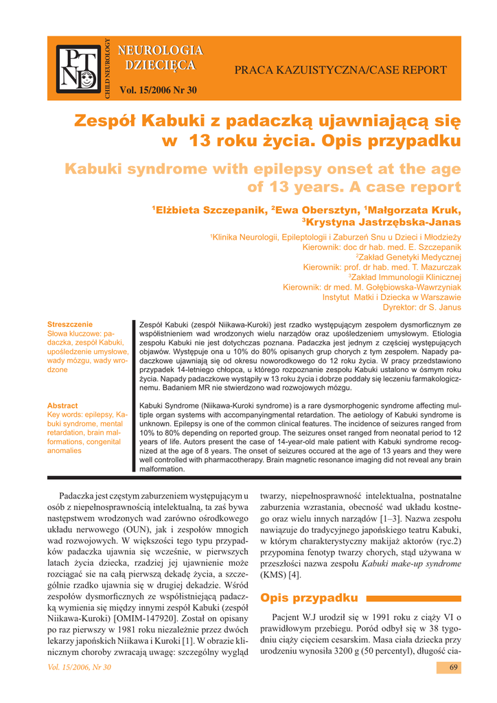 CHILD NEUROLOGY NEUROLOGIA DZIECIĘCA PRACA KAZUISTYCZNA/CASE REPORT Vol. 15/2006 Nr 30 Zespół Kabuki z padaczką ujawniającą się w 13 roku życia. Opis przypadku Kabuki syndrome with epilepsy onset at the age of 13 years. A case report 1 Elżbieta Szczepanik, 2Ewa Obersztyn, 1Małgorzata Kruk, 3 Krystyna Jastrzębska-Janas 1 Klinika Neurologii, Epileptologii i Zaburzeń Snu u Dzieci i Młodzieży Kierownik: doc dr hab. med. E. Szczepanik 2 Zakład Genetyki Medycznej Kierownik: prof. dr hab. med. T. Mazurczak 3 Zakład Immunologii Klinicznej Kierownik: dr med. M. Gołębiowska-Wawrzyniak Instytut Matki i Dziecka w Warszawie Dyrektor: dr S. Janus Streszczenie Słowa kluczowe: padaczka, zespół Kabuki, upośledzenie umysłowe, wady mózgu, wady wrodzone Zespół Kabuki (zespół Niikawa-Kuroki) jest rzadko występującym zespołem dysmorficznym ze współistnieniem wad wrodzonych wielu narządów oraz upośledzeniem umysłowym. Etiologia zespołu Kabuki nie jest dotychczas poznana. Padaczka jest jednym z częściej występujących objawów. Występuje ona u 10% do 80% opisanych grup chorych z tym zespołem. Napady padaczkowe ujawniają się od okresu noworodkowego do 12 roku życia. W pracy przedstawiono przypadek 14-letniego chłopca, u którego rozpoznanie zespołu Kabuki ustalono w ósmym roku życia. Napady padaczkowe wystąpiły w 13 roku życia i dobrze poddały się leczeniu farmakologicznemu. Badaniem MR nie stwierdzono wad rozwojowych mózgu. Abstract Key words: epilepsy, Kabuki syndrome, mental retardation, brain malformations, congenital anomalies Kabuki Syndrome (Niikawa-Kuroki syndrome) is a rare dysmorphogenic syndrome affecting multiple organ systems with accompanyingmental retardation. The aetiology of Kabuki syndrome is unknown. Epilepsy is one of the common clinical features. The incidence of seizures ranged from 10% to 80% depending on reported group. The seizures onset ranged from neonatal period to 12 years of life. Autors present the case of 14-year-old male patient with Kabuki syndrome recognized at the age of 8 years. The onset of seizures occured at the age of 13 years and they were well controlled with pharmacotherapy. Brain magnetic resonance imaging did not reveal any brain malformation. Padaczka jest częstym zaburzeniem występującym u osób z niepełnosprawnością intelektualną, ta zaś bywa następstwem wrodzonych wad zarówno ośrodkowego układu nerwowego (OUN), jak i zespołów mnogich wad rozwojowych. W większości tego typu przypadków padaczka ujawnia się wcześnie, w pierwszych latach życia dziecka, rzadziej jej ujawnienie może rozciągać sie na całą pierwszą dekadę życia, a szczególnie rzadko ujawnia się w drugiej dekadzie. Wśród zespołów dysmorficznych ze współistniejącą padaczką wymienia się między innymi zespół Kabuki (zespół Niikawa-Kuroki) [OMIM-147920]. Został on opisany po raz pierwszy w 1981 roku niezależnie przez dwóch lekarzy japońskich Niikawa i Kuroki [1]. W obrazie klinicznym choroby zwracają uwagę: szczególny wygląd Vol. 15/2006, Nr 30 twarzy, niepełnosprawność intelektualna, postnatalne zaburzenia wzrastania, obecność wad układu kostnego oraz wielu innych narządów [1–3]. Nazwa zespołu nawiązuje do tradycyjnego japońskiego teatru Kabuki, w którym charakterystyczny makijaż aktorów (ryc.2) przypomina fenotyp twarzy chorych, stąd używana w przeszłości nazwa zespołu Kabuki make-up syndrome (KMS) [4]. Opis przypadku Pacjent W.J urodził się w 1991 roku z ciąży VI o prawidłowym przebiegu. Poród odbył się w 38 tygodniu ciąży cięciem cesarskim. Masa ciała dziecka przy urodzeniu wynosiła 3200 g (50 percentyl), długość cia69 Elżbieta Szczepanik, Ewa Obersztyn, Małgorzata Kruk et al. ła 51 cm (50 percentyl), obwód głowy wynosił 34 cm (50 percentyl). Stan dziecka przy urodzeniu oceniono jako średni, wg skali Apgar 4 punkty w 1 minucie, 8 punktów w 5 minucie. Rodzice chłopca są niespokrewnieni: matka – 32 lata, ojciec – 30 lata, chory na kardiomiopatię przerostową. Dane z analizy rodowodu wskazują na obciążony wywiad położniczy matki pacjenta (CI, CIII, CV – poronienia samoistne, z CII – dziecko urodzone w 28 Hbd – bezczaszkowiec, z CIV – córka zdrowa). Rozwój psychoruchowy chłopca przebiegał ze znacznym opóźnieniem: umiejętność samodzielnego siadania uzyskał dopiero w drugim roku życia, chodził od trzeciego roku zycia. Rozwój mowy był również znacznie opóźniony, z początkiem od 5 roku życia. Mowa była i pozostaje do dziś dyzartryczna. Od pierwszych miesięcy życia u chłopca stwierdzano cechy dysmorfii w budowie ciała (ryc. 1; tab. I). Stan neurologiczny, poza obniżeniem napięcia mięśniowego oraz licznymi stereotypiami ruchowymi, nie wykazywał nieprawidłowości. Badanie psychologiczne wykonane w siódmym roku życia wskazywało na lekki stopień niepełnosprawności intelektualnej. Obecnie chłopiec jest uczniem szkoły specjalnej. W 13 roku życia wśród pełnego zdrowia pojawiły się u dziecka napady padaczkowe częściowe złożone. Pierwszy z nich wystąpił w sierpniu 2004 r., brak jednak dokładnego opisu przebiegu, kolejny – w lipcu 2005 r. w godzinach porannych prawdopodobnie przy wybudzaniu: chłopiec siedział na łóżku, nie nawiązywał kontaktu, obserwowano ślinotok, oddał bezwiednie mocz i stolec, po dwu godzinach wystąpiły intensywne wymioty, skarżył się na bóle głowy. Po upływie miesiąca zarejestrowano trzeci epizod napadowy o morfologii podobnej do poprzedniego, również w godzinach porannych. Po wprowadzeniu leczenia preparatami kwasu walproinowego (22 mg/kg m.c) napady już się nie pojawiły. Badania dodatkowe: Analiza chromosomów barwionych technika prążkową GTG wykazała prawidłowy kariotyp męski 46 XY. Wykluczono również obecność mikrodelecji w regionie 22q11.2. Wyniki kariotypu obojga rodziców były prawidłowe. W obrazie MR mózgu, wykonanym w płaszczyznach c