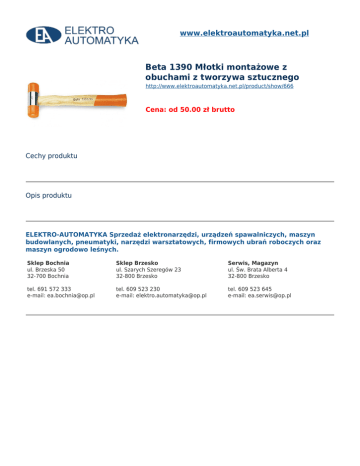 www.elektroautomatyka.net.pl Beta 1390 Młotki montażowe z obuchami z tworzywa sztucznego http://www.elektroautomatyka.net.pl/product/show/666 Cena: od 50.00 zł brutto Cechy produktu Opis produktu ELEKTRO-AUTOMATYKA Sprzedaż elektronarzędzi, urządzeń spawalniczych, maszyn budowlanych, pneumatyki, narzędzi warsztatowych, firmowych ubrań roboczych oraz maszyn ogrodowo leśnych. Sklep Bochnia ul. Brzeska 50 32-700 Bochnia Sklep Brzesko ul. Szarych Szeregów 23 32-800 Brzesko Serwis, Magazyn ul. Św. Brata Alberta 4 32-800 Brzesko tel. 691 572 333 e-mail: [email protected] tel. 609 523 230 e-mail: [email protected] tel. 609 523 645 e-mail: [email protected]