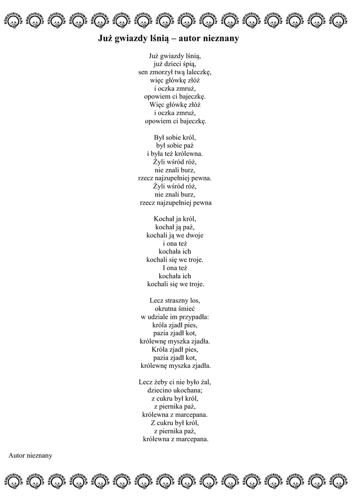 Już gwiazdy lśnią – autor nieznany Już gwiazdy lśnią, już dzieci śpią, sen zmorzył twą laleczkę, więc główkę złóż i oczka zmruż, opowiem ci bajeczkę. Więc główkę złóż i oczka zmruż, opowiem ci bajeczkę. Był sobie król, był sobie paź i była też królewna. Żyli wśród róż, nie znali burz, rzecz najzupełniej pewna. Żyli wśród róż, nie znali burz, rzecz najzupełniej pewna Kochał ja król, kochał ją paź, kochali ją we dwoje i ona też kochała ich kochali się we troje. I ona też kochała ich kochali się we troje. Lecz straszny los, okrutna śmieć w udziale im przypadła: króla zjadł pies, pazia zjadł kot, królewnę myszka zjadła. Króla zjadł pies, pazia zjadł kot, królewnę myszka zjadła. Lecz żeby ci nie było żal, dziecino ukochana; z cukru był król, z piernika paź, królewna z marcepana. Z cukru był król, z piernika paź, królewna z marcepana. Autor nieznany