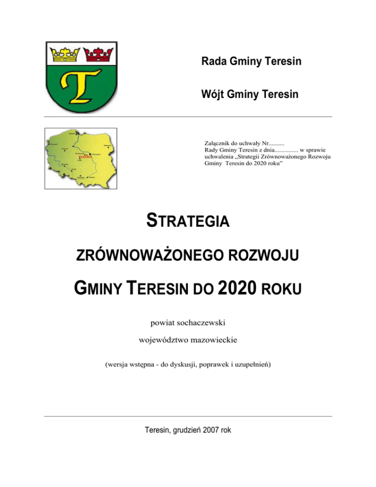 Rada Gminy Teresin Wójt Gminy Teresin Załącznik do uchwały Nr.......... Rady Gminy Teresin z dnia............... w sprawie uchwalenia „Strategii Zrównoważonego Rozwoju Gminy Teresin do 2020 roku” STRATEGIA ZRÓWNOWAŻONEGO ROZWOJU GMINY TERESIN DO 2020 ROKU powiat sochaczewski województwo mazowieckie (wersja wstępna - do dyskusji, poprawek i uzupełnień) Teresin, grudzień 2007 rok Strategia Zrównoważonego Rozwoju Gminy Teresin do 2020 roku Szanowni Państwo, Mieszkańcy Gminy Teresin! STRATEGIA ZRÓWNOWAŻONEGO ROZWOJU GMINY TERESIN DO 2020 roku jest niezmiernie ważnym dokumentem dla naszej społeczności lokalnej, bowiem wskazuje na pożądane kierunki zmian w sferze społecznej gospodarczej i ekologicznej Gminy. Ogólnie biorąc, odpowiada ona na podstawowe pytanie: co powinniśmy zrobić, aby jak najlepiej zaspokajać zbiorowe potrzeby mieszkańców Gminy Teresin? Nie można skutecznie realizować tego podstawowego celu naszego działania opierając się na metodzie „prób i błędów”, czy też na stwierdzeniach: „funkcjonujemy z dnia na dzień i jakoś to będzie” lub „nie myślmy zbyt wiele o przyszłości, bo i tak będzie inaczej niż przewidywaliśmy”. Taki sposób postępowania nie gwarantuje sukcesu, zarówno obecnie, jak i w przyszłości, w zaspokajaniu zbiorowych potrzeb mieszkańców Gminy. Nasze roczne i kadencyjne działania muszą więc wynikać z ustaleń długookresowych. Ponadto, członkostwo Polski w Unii Europejskiej stwarza realne szanse na skorzystanie z pomocy finansowej na realizację różnego rodzaju przedsięwzięć, w tym inwestycji gminnych. Jednak warunkiem wstępnym jej uzyskania jest posiadanie przez Gminę Teresin STRATEGII i wynikających z niej szczegółowych programów i planów działania. Tak więc ustalenia STRATEGII stanowić będą merytoryczną podstawę do prowadzenia długookresowej i systematycznej polityki rozwoju Gminy Teresin, zmierzającej do stałej poprawy jakości życia mieszkańców i funkcjonowania podmiotów gospodarczych oraz racjonalnego gospodarowania budżetem Gminy. Rada Gminy i Wójt Gminy dziękują wszystkim Osobom, które - poprzez zgłaszanie swoich opinii, uwag i propozycji - w istotny sposób przyczyniły się do powstania STRATEGII ZRÓWNOWAŻONEGO ROZWOJU GMINY TERESIN DO 2020 ROKU. Wyrażamy nadzieję, że niniejszy dokument stanie się płaszczyzną obywatelskiego porozumienia „ponad podziałami” wszystkich sił samorządowych, społeczno-politycznych i gospodarczych Gminy Teresin i zostanie uznany za nasze wspólne dzieło oraz w konsekwencji będzie stanowić podstawę wspólnych działań realizacyjnych dla dobra i pomyślności mieszkańców. Przewodniczący Rady Gminy Wójt Gminy Bogdan Linard Marek Olechowski 2 Strategia Zrównoważonego Rozwoju Gminy Teresin do 2020 roku Radni Gminy Teresin: Bogdan Linard - Przewodniczący Rady Gminy Lech Kaźmierczak - Wiceprzewodniczący Rady Gminy Ryszard Śliwiński - Wiceprzewodniczący Rady Zbigniew Biederka Małgorzata Matejka Dariusz Gałecki Włodzimierz Parzydeł Antonina Joanna Gigier Paweł Przedpełski Hanna Jankowska Jacek Szymaniak Ryszard Kacprzak Jerzy Wójcik Hubert Konecki Daniel Zdanowski Wójt Gminy Teresin: MAREK OLECHOWSKI Sekretarz Gminy Teresin: GRAŻYNA CIERPIS-PRZYSUCHA Skarbnik Gminy Teresin: JADWIGA DURCZAK Sołectwa i Sołtysi: Budki Piaseckie - Wiktor Wysocki Nowe Piaski - Helena Chaber Dębówka - Wojciech Cudnik Paprotnia - Jan Mitrowski Elżbietów - Janusz Paradowski Pawłowice - Sylwester Gmurek Gaj - Dariusz Chodak Pawłówek - Jan Bluszcz Granice - Kazimierz Antczak Seroki-Parcela - Krystyna Pietrzak Izbiska - Jerzy Włodarczyk Seroki-Wieś - Krzysztof Antczak Lisice - Tadeusz Mikulski Skrzelew - Maria Tondera Ludwików - Zbigniew Szymański Stare Piaski - Andrzej Szymański Maszna - Małgorzata Sobolewska Szymanów - Zbigniew Jankowski Maurycew - Stanisław Jarzyna Teresin-Gaj - Kazimierz Dąbrowski Mikołajew - Andrzej Szufliński Topołowa - Halina Ziółkowska Nowa Piasecznica - Paweł Bieguszewski Witoldów - Witold Zdanikowski Nowe Gnatowice - Marek Zygmunciak Organizacja i koordynacja prac planistycznych: Julita Kowalska, Kierownik Zespołu ds. Pozyskiwania Funduszy Pozabudżetowych oraz Justyna Poniatowska główny specjalista w Zespole ds. Pozyskiwania Funduszy Pozabudżetowych Urzędu Gminy w Teresinie Opracowanie dokumentu: Dr Jacek Sierak, Dr Marek Ziółkowski - Katedra Ekonomiki i Finansów Samorządu Terytorialnego, Kolegium Zarządzania i Finansów, Szkoła Główna Handlowa, Warszawa 3 Strategia Zrównoważonego Rozwoju Gminy Teresin do 2020 roku SPIS TREŚCI: Wprowadzenie .....................................................................................................................................5 Część I Podstawowe informacje o Gminie Teresin ...................................................................................10 Część II Uwarunkowania i główne problemy dalszego rozwoju Gminy Teresin ..................................13 1. Zewnętrzne uwarunkowania rozwoju .................................................................................................13 2. Wewnętrzne uwarunkowania rozwoju - ocena stanu istniejącego ......................................................21 3. Główne problemy dalszego rozwoju ...................................................................................................31 Część III Rozwój zrównoważony jako podstawa działań planistycznych i realizacyjnych Gminy Teresin ......................................................................................................34 Część IV Cele rozwoju Gminy Teresin............................................................................................................39 1. Zasady i przesłanki formułowania celów rozwoju ...............................................................................39 2. Misja rozwoju (generalny cel kierunkowy) i cele strategic