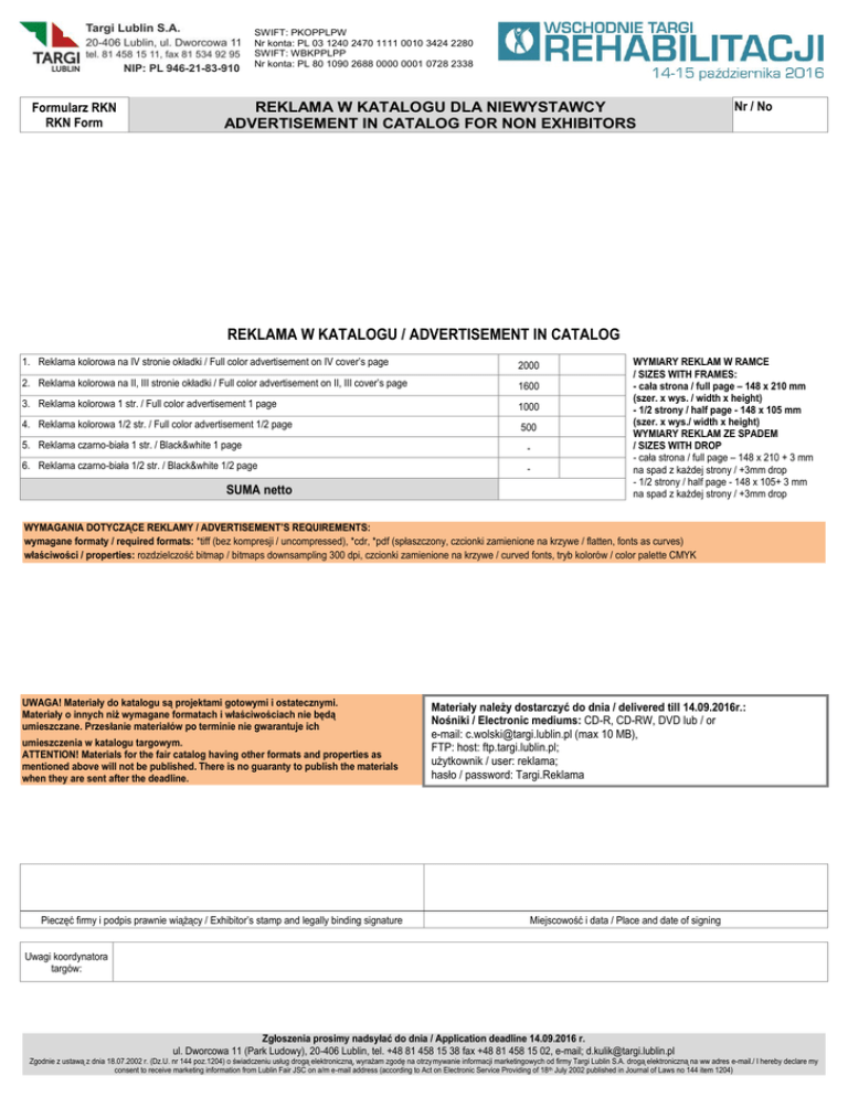 SWIFT: PKOPPLPW Nr konta: PL 03 1240 2470 1111 0010 3424 2280 SWIFT: WBKPPLPP Nr konta: PL 80 1090 2688 0000 0001 0728 2338 Formularz RKN RKN Form REKLAMA W KATALOGU DLA NIEWYSTAWCY ADVERTISEMENT IN CATALOG FOR NON EXHIBITORS Nr / No REKLAMA W KATALOGU / ADVERTISEMENT IN CATALOG 1. Reklama kolorowa na IV stronie okładki / Full color advertisement on IV cover’s page 2000 2. Reklama kolorowa na II, III stronie okładki / Full color advertisement on II, III cover’s page 1600 3. Reklama kolorowa 1 str. / Full color advertisement 1 page 1000 4. Reklama kolorowa 1/2 str. / Full color advertisement 1/2 page 500 5. Reklama czarno-biała 1 str. / Black&white 1 page - 6. Reklama czarno-biała 1/2 str. / Black&white 1/2 page - SUMA netto WYMIARY REKLAM W RAMCE / SIZES WITH FRAMES: - cała strona / full page – 148 x 210 mm (szer. x wys. / width x height) - 1/2 strony / half page - 148 x 105 mm (szer. x wys./ width x height) WYMIARY REKLAM ZE SPADEM / SIZES WITH DROP - cała strona / full page – 148 x 210 + 3 mm na spad z każdej strony / +3mm drop - 1/2 strony / half page - 148 x 105+ 3 mm na spad z każdej strony / +3mm drop WYMAGANIA DOTYCZĄCE REKLAMY / ADVERTISEMENT’S REQUIREMENTS: wymagane formaty / required formats: *tiff (bez kompresji / uncompressed), *cdr, *pdf (spłaszczony, czcionki zamienione na krzywe / flatten, fonts as curves) właściwości / properties: rozdzielczość bitmap / bitmaps downsampling 300 dpi, czcionki zamienione na krzywe / curved fonts, tryb kolorów / color palette CMYK UWAGA! Materiały do katalogu są projektami gotowymi i ostatecznymi. Materiały o innych niż wymagane formatach i właściwościach nie będą umieszczane. Przesłanie materiałów po terminie nie gwarantuje ich umieszczenia w katalogu targowym. ATTENTION! Materials for the fair catalog having other formats and properties as mentioned above will not be published. There is no guaranty to publish the materials when they are sent after the deadline. Pieczęć firmy i podpis prawnie wiążący / Exhibitor’s stamp and legally binding signature Materiały należy dostarczyć do dnia / delivered till 14.09.2016r.: Nośniki / Electronic mediums: CD-R, CD-RW, DVD lub / or e-mail: [email protected] (max 10 MB), FTP: host: ftp.targi.lublin.pl; użytkownik / user: reklama; hasło / password: Targi.Reklama Miejscowość i data / Place and date of signing Uwagi koordynatora targów: Zgłoszenia prosimy nadsyłać do dnia / Application deadline 14.09.2016 r. ul. Dworcowa 11 (Park Ludowy), 20-406 Lublin, tel. +48 81 458 15 38 fax +48 81 458 15 02, e-mail; [email protected] Zgodnie z ustawą z dnia 18.07.2002 r. (Dz.U. nr 144 poz.1204) o świadczeniu usług drogą elektroniczną, wyrażam zgodę na otrzymywanie informacji marketingowych od firmy Targi Lublin S.A. drogą elektroniczną na ww adres e-mail./ I hereby declare my consent to receive marketing information from Lublin Fair JSC on a/m e-mail address (according to Act on Electronic Service Providing of 18 th July 2002 published in Journal of Laws no 144 item 1204)