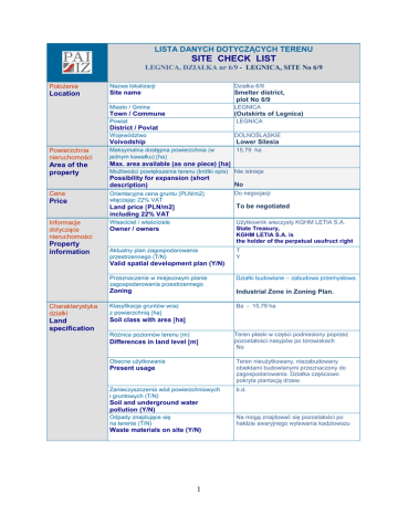 LISTA DANYCH DOTYCZĄCYCH TERENU SITE CHECK LIST LEGNICA, DZIAŁKA nr 6/9 - LEGNICA, SITE No 6/9 Położenie Nazwa lokalizacji Działka 6/9 Location Site name Smelter district, plot No 6/9 Miasto / Gmina LEGNICA Town / Commune (Outskirts of Legnica) Powiat LEGNICA District / Poviat Województwo DOLNOŚLĄSKIE Voivodship Lower Silesia Powierzchnia nieruchomości Maksymalna dostępna powierzchnia (w jednym kawałku) ha 15,79 ha Area of the property Max. area available (as one piece) ha Możliwości powiększenia terenu (krótki opis) Nie istnieje Possibility for expansion (short description) No Cena Orientacyjna cena gruntu PLN/m2 włączając 22% VAT Price Informacje dotyczące nieruchomości Property information Do negocjacji Land price PLN/m2 including 22% VAT To be negotiated Własciciel / właściciele Owner / owners Użytkownik wieczysty KGHM LETIA S.A. State Treasury, KGHM LETIA S.A. is the holder of the perpetual usufruct right Aktualny plan zagospodarowania przestrzennego (T/N) T Y Valid spatial development plan (Y/N) Charakterystyka działki Land specification Przeznaczenie w miejscowym planie zagospodarowania przestrzennego Działki budowlane – zabudowa przemysłowa. Zoning Industrial Zone in Zoning Plan. Klasyfikacja gruntów wraz z powierzchnią ha Ba - 15,79 ha Soil class with area ha Różnica poziomów terenu m Differences in land level m Obecne użytkowanie Teren płaski w części podniesiony poprzez pozostałości nasypów po torowiskach No Present usage Teren nieużytkowany, niezabudowany obiektami budowlanymi przeznaczony do zagospodarowania. Działka częściowo pokryta plantacją drzew. Zanieczyszczenia wód powierzchniowych i gruntowych (T/N) b.d. Soil and underground water pollution (Y/N) Odpady znajdujące się na terenie (T/N) Na mogą znajdować się pozostałości po hałdzie awaryjnego wylewania kadziowozu Waste materials on site (Y/N) 1 Poziom wód podziemnych m Underground water level m Brak precyzyjnych danych, prawdopodobnie poniżej 10,0 – 20,0 m pod poziomem terenu. No data probably 10 to 20 m below the site level Ryzyko wystąpienia zalań lub obsunięć terenu (T/N) N Risk of flooding or land slide (Y/N) No Przeszkody podziemne (T/N) Tak, Rury gazowe Underground obstacles (Y/N) Yes, High pressure pipeline at the area Przeszkody występujące na powierzchni terenu (T/N) Częściowe zadrzewienie – plantacja drzew do usunięcia. Ground and overhead obstacles (Y/N) Ograniczenia budowlane Building restrictions Istniejące ograniczenia ekologiczne (T/N) Pozwolenie zintegrowane dla O/HML Ecological restrictions (Y/N) Integrated permit for Legnica Smelter Budynki i zabudowania na terenie (T/N) N Buildings / other constructions on site (Y/N) No Procent dopuszczalnej zabudowy Do 50% Building coverage % Ograniczenia wysokości budynków m Building height limit m Zgodnie z MPZP maksymalna wysokość budynków: 27 m Strefa buforowa m --- Buffer zone m Inne, jeśli występują --- Others if any Połączenia transportowe Droga dojazdowa do terenu (rodzaj drogi i jej szerokość) Communication Access road to the plot (type and width of the access road) 2 Droga utwardzona budowlana 6 m Hard-surfaced road - 6 m Autostrada / droga krajowa km Nearest motorway / national road km Autostrada A4 w odległości 3 km (węzeł Złotoryja). Motorway A4 highway runs approximately 3 km from the plot. Autostrada A4 i droga międzynarodowa E40 zachód–wschód: Berlin -Olszyna - Legnica Wrocław - Katowice -Kraków - Medyka Lwów. Drogi międzynarodowe północ– południe: do Świnoujścia, oraz przez przejścia graniczne w Czechach do Wiednia i na południe Europy. A4 motorway and the international Road E40 (West-East): Berlin -Olszyna - Legnica - Wrocław -Katowice Kraków - Medyka - Lwów.International roads (North-South): from Świnoujście to the border crossing with the Czech Republic, also to Vienna and the South of Europe. Kolej km Sieć linii kolejowych o znaczeniu międzynarodowym. Linie magistralne łączące Legnicę z Dreznem, Frankfurtem i Berlinem. Railway track km Network of railroads of international importance. Main railroads connecting Legnica with Dresden, Frankfurt and Berlin. Bocznica kolejowa km Istniejąca infrastruktura Existing infrastructure Railway siding km Na terenie Huty znajduje się bocznica kolejowa (możliwość współpracy) Najbliższe lotnisko międzynarodowe km 70km –Wrocław 1km Nearest international airport km 70 km Airport in Wrocław Najbliższe miasto wojewódzkie km 70km – Wrocław Nearest voivodship city km 70km - Wrocław Elektryczność na terenie (T/N) N Electricity (T/N) No Odległość przyłącza od granicy terenu 120 m (OPT – 9 ) Connection point (distance from the border) m 120 m (OPT – 9 ) Napięcie NN 0,4 kV , SN 6,0 kV Voltage kV NN 0,4 kV , SN 6,0 kV Dostępna moc NN 500KW , SN 2MW Available capacity MW NN 500KW , SN 2MW Gaz na terenie (T/N) N Gas (Y/N) No Odległość przyłącza od granicy działki Connection point (distance from the border) m 3 100 m (Stacja red. gazu) 100 m (from a reduction station) Wartość kaloryczna GZ-41,5 Calorific value MJ/Nm3 Średnica rury Brak danych Pipe diameter mm No data Dostępna objętość wg zapotrzebowania Available capacity Nm3/h According to investors needs Woda na terenie (T/N) N Water supply (Y/N) No Odległość przyłącza od granicy terenu 50 m od granicy Connection point (distance from the border) m 50 m form the boarder Dostępna objętość --- Available capacity m3/24h Kanalizacja na terenie (T/N) N Sewage discharge (Y/N) No Odległość przyłącza od granicy terenu 200-250 mb Connection point (distance from the border) m 200 -250 mb Dostępna objętość --- Available capacity m3/24h Ograniczenie zrzutu ścieków Limitation of discharge Stężenia nie mogą przekroczyć wartości ujętych w pozwoleniu wodno- prawnym Allowance in accordance with the legal water requirement. Odprowadzenie wód deszczowych na terenie (T/N) Rain water discharge (Y/N) T Yes Oczy