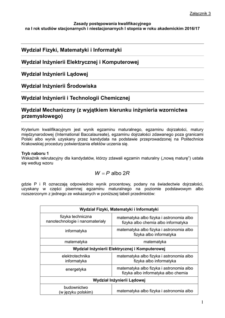 Załącznik 3 Zasady postępowania kwalifikacyjnego na I rok studiów stacjonarnych i niestacjonarnych I stopnia w roku akademickim 2016/17 Wydział Fizyki, Matematyki i Informatyki Wydział Inżynierii Elektrycznej i Komputerowej Wydział Inżynierii Lądowej Wydział Inżynierii Środowiska Wydział Inżynierii i Technologii Chemicznej Wydział Mechaniczny (z wyjątkiem kierunku inżynieria wzornictwa przemysłowego) Kryterium kwalifikacyjnym jest wynik egzaminu maturalnego, egzaminu dojrzałości, matury międzynarodowej (International Baccalaureate), egzaminu dojrzałości zdawanego poza granicami Polski albo wynik uzyskany przez kandydata na podstawie przeprowadzonej na Politechnice Krakowskiej procedury potwierdzania efektów uczenia się. Tryb naboru 1 Wskaźnik rekrutacyjny dla kandydatów, którzy zdawali egzamin maturalny („nową maturę”) ustala się według wzoru W P albo 2R gdzie P i R oznaczają odpowiednio wynik procentowy, podany na świadectwie dojrzałości, uzyskany w części pisemnej egzaminu maturalnego na poziomie podstawowym albo rozszerzonym z jednego ze wskazanych w poniższej tabeli przedmiotów: Wydział Fizyki, Matematyki i Informatyki fizyka techniczna nanotechnologie i nanomateriały matematyka albo fizyka i astronomia albo fizyka albo chemia albo informatyka informatyka matematyka albo fizyka i astronomia albo fizyka albo informatyka matematyka matematyka Wydział Inżynierii Elektrycznej i Komputerowej elektrotechnika informatyka matematyka albo fizyka i astronomia albo fizyka albo informatyka energetyka matematyka albo fizyka i astronomia albo fizyka albo informatyka albo chemia Wydział Inżynierii Lądowej budownictwo (w języku polskim) matematyka albo fizyka i astronomia albo 1 transport fizyka albo informatyka budownictwo (w języku angielskim) matematyka albo fizyka i astronomia albo fizyka albo informatyka udokumentowana znajomość języka angielskiego* gospodarka przestrzenna matematyka albo fizyka i astronomia albo fizyka albo chemia albo biologia albo geografia Wydział Inżynierii Środowiska budownictwo matematyka albo fizyka i astronomia albo fizyka albo chemia gospodarka przestrzenna matematyka albo fizyka i astronomia albo fizyka albo chemia albo biologia albo geografia inżynieria środowiska matematyka albo fizyka i astronomia albo fizyka albo chemia albo biologia Wydział Inżynierii i Technologii Chemicznej biotechnologia chemia budowlana inżynieria chemiczna i procesowa technologia chemiczna matematyka albo fizyka i astronomia albo fizyka albo chemia albo biologia nanotechnologie i nanomateriały matematyka albo fizyka i astronomia albo fizyka albo chemia albo informatyka Wydział Mechaniczny automatyka i robotyka informatyka stosowana matematyka albo fizyka i astronomia albo fizyka albo informatyka energetyka inżynieria produkcji mechanika i budowa maszyn transport matematyka albo fizyka i astronomia albo fizyka albo informatyka albo chemia mechanika i budowa maszyn (w języku angielskim) matematyka albo fizyka i astronomia albo fizyka albo informatyka albo chemia udokumentowana znajomość języka angielskiego* inżynieria bezpieczeństwa inżynieria biomedyczna inżynieria materiałowa matematyka albo fizyka i astronomia albo fizyka albo informatyka albo chemia albo biologia * Od kandydatów na studia prowadzone w języku angielskim na kierunku budownictwo (Wydział Inżynierii Lądowej) oraz na kierunku mechanika i budowa maszyn (Wydział Mechaniczny, specjalność: zaawansowana mechanika obliczeniowa) wymagana jest znajomość języka angielskiego udokumentowana certyfikatem egzaminu CPE albo CAE albo FCE albo TOEFL, świadectwem matury międzynarodowej, świadectwem potwierdzającym ukończenie liceum z wykładowym językiem angielskim albo świadectwem dojrzałości potwierdzającym uzyskanie co najmniej 60% z języka angielskiego zdawanego na poziomie rozszerzonym. Znajomość języka angielskiego można również udokumentować zaliczeniem testu kompetencyjnego przeprowadzanego na Politechnice Krakowskiej w terminie wskazanym w harmonogramie rekrutacji. Tryb naboru 2 Wskaźnik rekrutacyjny dla kandydatów, którzy zdawali egzamin dojrzałości („starą maturę”) oceniany w skali sześciostopniowej od 1 do 6, ustala się przeliczając oceny uzyskane w części 2 pisemnej egzaminu dojrzałości z przedmiotów obowiązujących kandydatów z „nową maturą” (z wyłączeniem informatyki) według poniższej tabeli: liczba punktów 200 170 140 100 60 ocena 6,0 5,0 4,0 3,0 2,0 Wskaźnik rekrutacyjny dla kandydatów, którzy zdawali egzamin dojrzałości („starą maturę”) oceniany w skali czterostopniowej od 2 do 5, ustala się przeliczając oceny uzyskane w części pisemnej egzaminu dojrzałości z przedmiotów obowiązujących kandydatów z „nową maturą” (z wyłączeniem informatyki) według poniższej tabeli: liczba punktów 200 150 100 ocena 5,0 4,0 3,0 Tryb naboru 3 Wskaźnik rekrutacyjny dla kandydatów, którzy zdawali maturę międzynarodową (International Baccalaureate) ustala się przeliczając oceny uzyskane w części pisemnej matury z przedmiotów obowiązujących kandydatów z „nową maturą” według poniższej tabeli: ocena Excellent Very good Good Satisfactory Mediocre Poor Very poor Liczba punktów dla kandydatów zdających na poziomie standard level (SL) 100 85 70 50 30 10 0 Liczba punktów dla kandydatów zdających na poziomie higher level (HL) 200 170 140 100 60 20 0 Tryb naboru 4 W przypadku kandydatów, którzy zdawali egzamin dojrzałości poza granicami Polski, wyniki uzyskane na maturze z przedmiotów obowiązujących kandydatów z „nową maturą” przeliczane są na punkty w skali 200-punktowej przez Wydziałową Komisję Rekrutacyjną. Tryb naboru 5 Wskaźnik rekrutacyjny dla kandydatów ubiegających się o przyjęcie na studia I stopnia na podstawie potwierdzenia efektów uczenia się, ustala się według wzoru W= W1 gdzie uzyskane przez kandydata w wyniku potwierdzenia