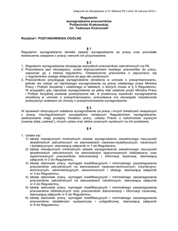 Załącznik do Zarządzenia nr 31 Rektora PK z dnia 18 czerwca 2015 r. Regulamin wynagradzania pracowników Politechniki Krakowskiej im. Tadeusza Kościuszki Rozdział I POSTANOWIENIA OGÓLNE §1 Regulamin wynagradzania określa zasady wynagradzania za pracę oraz pozostałe świadczenia związane z pracą i warunki ich przyznawania. §2 1. Regulamin wynagradzania obowiązuje wszystkich pracowników zatrudnionych na PK. 2. Pracodawca jest obowiązany, przed dopuszczeniem każdego pracownika do pracy, zapoznać go z treścią regulaminu. Oświadczenie pracownika o zapoznaniu się z regulaminem zostaje dołączone do jego akt osobowych. 3. Pracownikowi przysługuje wynagrodzenie określone w umowie o pracę/mianowaniu, jednak nie niższe od najniższego wynagrodzenia za pracę ustalanego przez Ministra Pracy i Polityki Socjalnej i ustalonego w tabelach, o których mowa w § 4 Regulaminu. W przypadku gdy najniższe wynagrodzenie za pełny etat ustalone przez Ministra Pracy i Polityki Socjalnej zostanie podwyższone tak, iż przekroczy wysokość wynagrodzenia określoną w umowie o pracę/mianowaniu, pracodawca ma obowiązek niezwłocznie podwyższyć aneksem do umowy o pracę/mianowania wynagrodzenie. §3 W sprawach dotyczących ustalania wynagrodzenia za pracę i innych świadczeń związanych z pracą, nieuregulowanych szczegółowo niniejszym Regulaminem wynagradzania, zastosowanie mają przepisy Kodeksu pracy, ustawy Prawo o szkolnictwie wyższym (zwanej dalej „ustawą”), innych ustaw oraz aktów prawnych wydanych na ich podstawie. §4 1. Ustala się: 1) tabelę miesięcznych minimalnych stawek wynagrodzenia zasadniczego nauczycieli akademickich zatrudnionych na stanowiskach naukowo-dydaktycznych, naukowych i dydaktycznych, stanowiącą załącznik nr 1 do Regulaminu, 2) tabelę miesięcznych minimalnych stawek wynagrodzenia zasadniczego nauczycieli akademickich zatrudnionych na stanowiskach dyplomowanych bibliotekarzy oraz dyplomowanych pracowników dokumentacji i informacji naukowej, stanowiącą załącznik nr 2 do Regulaminu, 3) tabelę stanowisk pracy, wymagań kwalifikacyjnych i minimalnego zaszeregowania pracowników zatrudnionych na stanowiskach naukowo-technicznych, inżynieryjnotechnicznych, administracyjnych, ekonomicznych i obsługi, stanowiącą załącznik nr 3 do Regulaminu, 4) tabelę stanowisk pracy, wymagań kwalifikacyjnych i minimalnego zaszeregowania pracowników zatrudnionych na stanowiskach robotniczych, stanowiącą załącznik nr 4 do Regulaminu, 5) tabelę stanowisk pracy, wymagań kwalifikacyjnych i minimalnego zaszeregowania pracowników bibliotecznych oraz pracowników dokumentacji i informacji naukowej, stanowiącą załącznik nr 5 do Regulaminu, 6) tabelę stanowisk pracy, wymagań kwalifikacyjnych i minimalnego zaszeregowania pracowników działalności wydawniczej i poligraficznej, stanowiącą załącznik nr 6 do Regulaminu, 7) tabelę miesięcznych stawek dodatku funkcyjnego dla nauczycieli akademickich pełniących funkcje kierownicze oraz zasady ich ustalania, stanowiącą załącznik nr 7 do Regulaminu, 8) tabelę miesięcznych stawek dodatku funkcyjnego dla dyplomowanych bibliotekarzy, dyplomowanych pracowników dokumentacji i informacji naukowej, pracowników bibliotecznych oraz pracowników dokumentacji i informacji naukowej niebędących nauczycielami akademickimi, pełniących funkcje kierownicze, stanowiącą załącznik nr 8 do Regulaminu, 9) tabelę miesięcznych stawek dodatku funkcyjnego dla pracowników niebędących nauczycielami akademickimi, pełniących funkcje kierownicze, stanowiącą załącznik nr 9 do Regulaminu; 2. W przypadku określenia w przepisach wydanych na podstawie art. 151 ustawy Prawo o szkolnictwie wyższym stawek minimalnego wynagrodzenia wyższych, niż podane w tabelach, o których mowa w ust. 1 pkt 1-6, tabele te rektor dostosowuje w drodze zarządzenia w taki sposób, aby stawki minimalnego wynagrodzenia były nie niższe niż określone w wyżej wymienionych przepisach. Rozdział II ZASADY I WARUNKI WYNAGRADZANIA ZA PRACĘ §5 1. Wynagrodzenie za pracę ustala się w wysokości odpowiadającej rodzajowi wykonywanej pracy oraz kwalifikacjom wymaganym przy jej wykonywaniu. 2. Wynagrodzenie przysługuje za pracę wykonaną. Za czas niewykonania pracy pracownik zachowuje prawo do wynagrodzenia tylko wówczas, gdy przepisy prawa pracy tak stanowią. 3. Pracownik nie może zrzec się prawa do wynagrodzenia ani przenieść tego prawa na inną osobę. 4. Potrącenia z wynagrodzeń regulują art. 87-91 Kodeksu Pracy. 5. Należności inne, niż te wymienione w art. 87 § 1 i 7 Kodeksu Pracy, mogą być potrącane z wynagrodzenia pracownika tylko za jego zgodą wyrażoną na piśmie. W takim przypadku ma zastosowanie art. 91 Kodeksu Pracy. 6. Pracodawca, na żądanie pracownika, jest obowiązany udostępnić do wglądu dokumenty, na podstawie których zostało obliczone jego wynagrodzenie. 7. Pracodawca jest zobowiązany do ochrony poufności informacji dotyczących indywidualnych wynagrodzeń i innych świadczeń (z wyłączeniem wynagrodzeń rektora, prorektorów, kanclerza i kwestora). 8. Nauczycielom akademickim wynagrodzenie wypłaca się z góry za dany miesiąc, tj. pierwszego dnia danego miesiąca, a pracownikom niebędącym nauczycielami akademickimi wynagrodzenie wypłaca się z dołu za okres miesięczny w 27 dniu danego miesiąca. Zasiłki wypłaca się w terminach wypłat wynagrodzeń. 9. Wypłaty wynagrodzeń finansowanych ze źródeł zewnętrznych (tj. innych niż dotacje podmiotowe na działalność PK i jej własne przychody) dokonuje się za przepracowany miesiąc z dołu w 27 dniu każdego miesiąca, a wypłaty wynagrodzenia za pracę w projektach finansowanych ze źródeł zewnętrznych (jeśli wynagrodzenie wynika z aneksu do umowy o pracę lub mianowania) dokonuje się do 10 dnia następnego miesiąca. 10. Jeżeli termin wypłaty wynagrodzenia przypada na dzień ustawowo wolny od pracy, wypłat