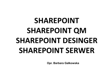SHAREPOINT SHAREPOINT QM SHAREPOINT DESINGER SHAREPOINT SERWER Opr. Barbara Gałkowska Microsoft SharePoint Microsoft SharePoint znany jest również pod nazwą Microsoft SharePoint Products and Technologies i stanowi zbiór produktów i elementów oprogramowania, które obejmuje, oprócz wybranych dodatkowych elementów, oparte o przeglądarkę internetową systemy pracy grupowej, moduły zarządzania procesami, moduły wyszukiwania oraz platformę zarządzania dokumentami. Dzięki Microsoft SharePoint możliwa jest współpraca i komunikacja osób pracujących w firmie, a także partnerów handlowych, klientów oraz dostawców. Podejście to umożliwia organizacjom: personalizowanie i dostosowywanie własnych portali w sieciach intranet i ekstranet za pomocą zaawansowanych funkcji profilowania użytkowników, współpracę wewnętrznych i zewnętrznych członków zespołów za pośrednictwem witryny SharePoint w jednym skonsolidowanym widoku portalu oraz integrowanie aplikacji o profilu biznesowym i uzyskiwanie do nich dostępu za pomocą łatwych do konfigurowania składników. Do podstawowych funkcji SharePoint zaliczymy przede wszystkim: v usprawnienie współpracy i zwiększenie możliwości decyzyjnych zespołów roboczych, v automatyczne powiadomienia o zmianach w stronach i dokumentach, v informowanie o zwiększaniu użyteczności intranetu, v zwiększenie użyteczności intranetu i samych aplikacji Office, v dostosowywanie funkcji intranetu z wykorzystaniem Web Parts bez konieczności programowania. Sharepoint QM to rozwiązanie wspomagające proces tworzenia i zarządzania dokumentacją systemową. Centralne repozytorium umożliwia łatwe gromadzenie oraz zarządzanie dostępem do dokumentów, zabezpiecza przed utratą cennych danych oraz ułatwia nadzór nad dokumentami będącymi własnością firmy. Największą korzyścią jest redukcja operacji na dokumentach papierowych (dystrybucja, niszczenie, kopie robocze) i ułatwienie pracy grupowej (zwiększenie jej wydajności poprzez łatwe wyszukiwanie potrzebnych informacji). Elastyczność aplikacji i łatwość konfiguracji umożliwiają dopasowanie jej do wymagań każdej firmy. Wdrożenie aplikacji oznacza uporządkowanie pracy z dokumentacją zgodnie z istniejącymi procedurami. W efekcie oznacza to, że dokumenty powstają dużo szybciej, a ich końcowa wersja jest maksymalnie dopracowana. System Sharepoint QM umożliwia odwzorowanie uprawnień pracowników do tworzenia, opiniowania, zatwierdzania lub tylko czytania dokumentów oraz zapewnia możliwość pracy grupowej i definiowania obiegu dokumentów w firmie. Możliwe jest także śledzenie historii poszczególnych plików, ich wersjonowanie, przeszukiwanie, kontrolowanie wydruków. Przechowywanie kolejnych wersji poszczególnych dokumentów SharePoint QM może przechowywać wszystkie kolejne wersje dokumentów i udostępniać je przez biblioteki dokumentów na witrynach intranetu. Poszczególne wersje mogą być opatrzone komentarzem. W każdej chwili możliwe jest skorzystanie z dowolnej wersji danego dokumentu. Opcja zachowywania wersji jest możliwa do ustawienia dla każdej z bibliotek z osobna, dzięki czemu można tę funkcję uruchomić tylko dla dokumentów, dla których jest ona istotna. Automatyczne powiadomienia o zmianach w dokumentach Użytkownicy mogą zdecydować o częstotliwości powiadomień (natychmiastowe, w zestawieniach dziennych lub tygodniowych) o zmianach zachodzących w dokumentach. SharePoint QM wzbogaca ten mechanizm o powiadomienia dotyczące ludzi, nowości, elementów list, katalogu witryn (Site Directory), kategorii i zapytań wyszukiwarki. Ponadto każdy z użytkowników ma dostęp do podsumowania powiadomień na swojej osobistej stronie (My Site) w portalu. SharePoint QM pozwala na publikowanie treści z przeznaczeniem dla poszczególnych ról w organizacji. Strona ta zawiera treści i elementy kierowane do danego użytkownika wg jego przynależności do danej grupy odbiorców, a także szybki dostęp do najważniejszych plików, wybrane linki, kontakty oraz personalizowane powiadomienia o zmianach w zwartości portalu. Profilowanie odbywa się na podstawie właściwości zapisanych w profilu użytkownika, struktury organizacyjnej lub przynależności do grup w Microsoft Active Directory. Zorganizowanie zasobów wokół tematów ułatwia wyszukiwanie niezbędnych informacji. Ponadto eksperci w danych dziedzinach mogą publikować swoje dokumenty w sekcjach poświęconych poszczególnym tematom. Jeśli jeden dokument odpowiada kilku tematom może być on przypisany do kilku sekcji jednocześnie.