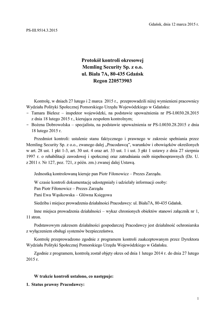 Gdańsk, dnia 12 marca 2015 r. PS-III.9514.3.2015 Protokół kontroli okresowej Memling Security Sp. z o.o. ul. Biała 7A, 80-435 Gdańsk Regon 220573903 Kontrolę, w dniach 27 lutego i 2 marca 2015 r., przeprowadzili niżej wymienieni pracownicy Wydziału Polityki Społecznej Pomorskiego Urzędu Wojewódzkiego w Gdańsku: - Tamara Bielesz – inspektor wojewódzki, na podstawie upoważnienia nr PS-I.0030.28.2015 z dnia 18 lutego 2015 r., kierująca zespołem kontrolnym; - Bożena Dobrowolska – specjalista, na podstawie upoważnienia nr PS-I.0030.28.2015 z dnia 18 lutego 2015 r. Przedmiot kontroli: ustalenie stanu faktycznego i prawnego w zakresie spełniania przez Memling Security Sp. z o.o., zwanego dalej „Pracodawcą”, warunków i obowiązków określonych w art. 28 ust. 1 pkt 1-3, art. 30 ust. 4 oraz art. 33 ust. 1 i ust. 3 pkt 1 ustawy z dnia 27 sierpnia 1997 r. o rehabilitacji zawodowej i społecznej oraz zatrudniania osób niepełnosprawnych (Dz. U. z 2011 r. Nr 127, poz. 721, z późn. zm.) zwanej dalej Ustawą. Jednostką kontrolowaną kieruje pan Piotr Fiłonowicz – Prezes Zarządu. W czasie kontroli dokumentację udostępniały i udzielały informacji osoby: Pan Piotr Fiłonowicz – Prezes Zarządu Pani Ewa Wąsikowska – Główna Księgowa Siedziba i miejsce prowadzenia działalności Pracodawcy: ul. Biała7A, 80-435 Gdańsk. Inne miejsca prowadzenia działalności – wykaz chronionych obiektów stanowi załącznik nr 1, 11 stron. Podstawowym zakresem działalności gospodarczej Pracodawcy jest działalność ochroniarska z wyłączeniem obsługi systemów bezpieczeństwa. Kontrolę przeprowadzono zgodnie z programem kontroli zaakceptowanym przez Dyrektora Wydziału Polityki Społecznej Pomorskiego Urzędu Wojewódzkiego w Gdańsku. Zgodnie z programem, kontrolą został objęty okres od dnia 1 lutego 2014 r. do dnia 27 lutego 2015 r. W trakcie kontroli ustalono, co następuje: 1. Status prawny Pracodawcy: 1 Pracodawca prowadzi działalność na podstawie: - Wpisu do KRS nr 0000300909 prowadzonego przez Sąd Rejonowy Gdańsk Północ w Gdańsku, VII Wydział Gospodarczy Krajowego Rejestru Sądowego - Decyzji Wojewody Pomorskiego nr D/04/2010 z dnia 6 sierpnia 2010 r. - Koncesji nr L-0130/08 z dnia 18 czerwca 2008 r. wydanej przez Ministra Spraw Wewnętrznych i Administracji 2. Spełnianie przez Pracodawcę warunków określonych w art. 28 ustawy z dnia 27 sierpnia 1997 r. o rehabilitacji zawodowej i społecznej oraz zatrudniania osób niepełnosprawnych: 1) stan zatrudnienia ogółem: […]* osób [..]*etatów), w tym niepełnosprawnych […]* osoby ([..]* etatów). Wszystkie osoby zatrudnione są na podstawie przepisów kodeksu pracy. [.]*osoba ([.]*etat) ma orzeczony lekki stopień niepełnosprawności, [...]* osób ([.]* etatów) ma orzeczony umiarkowany stopień niepełnosprawności, [..]*osoby ([…]*etatów) ma orzeczony znaczny stopień niepełnosprawności (zestawienie zatrudnienia na miesiąc luty, w tym na dzień 27 lutego 2015 r., stanowi znacznik nr 2 do protokołu). Pracodawca przedstawił zespołowi kontrolnemu stan zatrudnienia w losowo wybranym czasie kontrolowanego okresu: marzec, maj, sierpień, grudzień 2014 r. (zestawienia stanowią załączniki nr 3, 4, 5, 6 do protokołu). Zespół kontrolny stwierdził, że w okresie poddanym kontroli pracodawca wypełniał warunki zatrudnienia, określone w art. 28 ust. 1 ustawy z dnia 27 sierpnia 1997 r. o rehabilitacji zawodowej i społecznej oraz zatrudniania osób niepełnosprawnych, dla pracodawców posiadających status zakładu pracy chronionej. W trakcie czynności kontrolnych skontrolowano akta osobowe losowo wybranych osób niepełnosprawnych zatrudnionych w zakładzie: []*osób mających orzeczony znaczny stopień niepełnosprawności oraz []*osób mających orzeczony umiarkowany stopień niepełnosprawności (zestawienie stanowi załącznik nr 7 do protokołu). We wszystkich aktach osobowych, objętych kontrolą, stwierdza się aktualne umowy o pracę (z treści umowy wynika zakres czynności), aktualne zaświadczenia lekarskie o braku przeciwwskazań zdrowotnych do wykonywania pracy na stanowisku oraz orzeczenia o stopniu niepełnosprawności. 2) wskaźnik zatrudnienia osób niepełnosprawnych wynosi []*%, wskaźnik zatrudnienia osób niepełnosprawnych z umiarkowanym lub znacznym stopniem niepełnosprawności wynosi [..]*% (stan na dzień kontroli). Pracodawca przedstawił wskaźniki zatrudnienia w ww. miesiącach kontrolowanego okresu. Zespół kontrolny stwierdził, że w okresie poddanym kontroli pracodawca osiągał wartości wskaźników zatrudnienia, określone w art. 28 ust. 1 pkt 1a ustawy z dnia 27 sierpnia 1997 r. o rehabilitacji zawodowej i społecznej oraz zatrudniania osób niepełnosprawnych, dla pracodawców posiadających status zakładu pracy chronionej. 3) obiekt i pomieszczenia w Gdańsku przy ul. Białej 7A, użytkowany w ramach statusu zakładu pracy chronionej na podstawie decyzji Państwowej Inspekcji Pracy nr 03220-K038-Ao08/10 z dnia 10 czerwca 2010 r., stwierdzającej, że obiekt i pomieszczenia odpowiadają przepisom i zasadom bezpieczeństwa i higieny pracy, uwzględniają potrzeby zatrudnionych tu osób niepełno2 sprawnych w zakresie przystosowania stanowisk pracy, pomieszczeń higieniczno- sanitarnych i ciągów komunikacyjnych oraz spełniają wymagania dostępności do nich. Wyniki ostatniej kontroli Państwowej Inspekcji Pracy, zakończonej protokołem nr 03220-5301-K037-Pt/13 z dnia 6 czerwca 2013 r., potwierdzają, że obiekt będący siedzibą jest przystosowany dla potrzeb zatrudnionych osób niepełnosprawnych. Pomieszczenia higieniczno-sanitarne są dostosowane do wymogów obowiązujących w tym względzie. Pracodawca wykorzystuje do realizacji zadań różnorodne obiekty, które użytkowane przez innych pracodawców, odpowiadają przepisom i zasadom bezpieczeństwa i higieny pracy zgodnie z art. 28 ust. 2 Ustawy. 4) w celu realizacji świadczeń w zakre