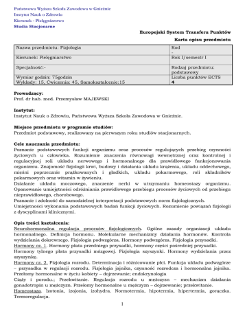 Państwowa Wyższa Szkoła Zawodowa w Gnieźnie Instytut Nauk o Zdrowiu Kierunek - Pielęgniarstwo Studia Stacjonarne Europejski System Transferu Punktów Karta opisu przedmiotu Nazwa przedmiotu: Fizjologia Kod Rok I/semestr I Kierunek: Pielęgniarstwo Specjalność:Wymiar godzin: 75godzin Wykłady: 15, Ćwiczenia: 45, Samokształcenie:15 Rodzaj przedmiotu: podstawowy Liczba punktów ECTS 4 Prowadzący: Prof. dr hab. med. Przemysław MAJEWSKI Instytut: Instytut Nauk o Zdrowiu, Państwowa Wyższa Szkoła Zawodowa w Gnieźnie. Miejsce przedmiotu w programie studiów: Przedmiot podstawowy, realizowany na pierwszym roku studiów stacjonarnych. Cele nauczania przedmiotu: Poznanie podstawowych funkcji organizmu oraz procesów regulujących przebieg czynności życiowych u człowieka. Rozumienie znaczenia równowagi wewnętrznej oraz kontrolnej i regulacyjnej roli układu nerwowego i hormonalnego dla prawidłowego funkcjonowania organizmu. Znajomość fizjologii krwi, budowy i działania układu krążenia, układu oddechowego, mięśni poprzecznie prążkowanych i gładkich, układu pokarmowego, roli składników pokarmowych oraz witamin w żywieniu. Działanie układu moczowego, znaczenie nerki w utrzymaniu homeostazy organizmu. Opanowanie umiejętności odróżniania prawidłowego przebiegu procesów życiowych od przebiegu nieprawidłowego, chorobowego. Poznanie i zdolność do samodzielnej interpretacji podstawowych norm fizjologicznych. Umiejętności wykonania podstawowych badań funkcji życiowych. Rozumienie powiązań fizjologii z dyscyplinami klinicznymi. Opis treści kształcenia: Neurohormonalna regulacja procesów fizjologicznych. Ogólne zasady organizacji układu hormonalnego. Definicja hormonu. Molekularne mechanizmy działania hormonów. Kontrola wydzielania dokrewnego. Fizjologia podwzgórza. Hormony podwzgórza. Fizjologia przysadki. Hormony cz. 1. Hormony płata przedniego przysadki, hormony części pośredniej przysadki. Hormony tylnego płata przysadki mózgowej. Fizjologia szyszynki. Hormony wydzielania przez szyszynkę. Hormony cz. 2. Fizjologia rozrodu. Determinacja i różnicowanie płci. Funkcja układu podwzgórze – przysadka w regulacji rozrodu. Fizjologia jajnika, czynność rozrodcza i hormonalna jajnika. Przełomy hormonalne w życiu kobiety – dojrzewanie; endokrynologia Ciąży i porodu.; Przekwitanie. Regulacja rozrodu u mężczyzn – mechanizm działania gonadotropin u mężczyzn. Przełomy hormonalne u mężczyzn – dojrzewanie; przekwitanie. Homeostaza. Izotonia, izojonia, izohydra. Normotermia, hipotermia, hipertermia, gorączka. Termoregulacja. 1 Państwowa Wyższa Szkoła Zawodowa w Gnieźnie Instytut Nauk o Zdrowiu Kierunek - Pielęgniarstwo Studia Stacjonarne Homeostaza. Gospodarka wodna ustroju. Gospodarka kwasowo – zasadowa. Typy sprzężeń wodnych. Funkcja poszczególnych układów w zachowaniu homeostazy. Wyższe funkcje nerwowe. Ośrodki motywacyjne w podwzgórzu, pamięć świeża i trwała. Uczenie się. Sen i czuwanie. Wyższe funkcje nerwowe. Neurofizjologiczne podstawy zachowania się człowieka. Budowa i rola układu limbicznego. Fizjologia układu krążenia. Automatyzm serca. Układ bodźcoprzewodzący serca. Hemodynamika serca. Cykl serca. Rola aparatu zastawkowego. Autoregulacja serca. Fizjologia układu krążenia. Krążenie obwodowe. Budowa naczyń krwionośnych. Rola naczyń sprężystych w zachowaniu przepływu krwi. Rola tętnic mięśniowych w dystrybucji krwi. Regulacja przepływu krwi – miejscowa i humoralna. Fizjologia układu oddechowego. Mechanika oddychania. Wymiana gazowa w płucach. Krążenie krwi w płucach. Nerwowa i chemiczna regulacja oddychania. Fizjologia krwinek czerwonych i białych. Hematopoeza. Regulacja erytro-poezy. Fizjologia krwinek białych. Czynność leukocytów – granulocyty obojętno-chłonne; granulocyty kwasochłonne; granulocyty zasadochłonne; monocyty; makrofagi. Regulacja leukopoezy. Hemostaza. Hemostaza naczyniowa, płytkowa i osoczowa. Fibrynoliza. Zaburzenia hemostazy. Fizjologia przewodu pokarmowego. Trawienie i wchłanianie węglowodanów, tłuszczów i białek. Czynność motoryczna i wydzielnicza przewodu pokarmowego. Hormony. Fizjologia gruczołu tarczowego. Metabolizm jodu. Hormony tarczycy. Fizjologia rdzenia nadnerczy. Hormony rdzenia nadnerczy. Fizjologia kory nadnerczy. Mineralokortykosteroidy. Glukokortykosterolidy. Androgeny nadnerczy. Fizjologia przytarczyc. Fizjologia żywienia. Wartość energetyczna pożywienia. Podstawowa przemiana materii. Całkowita przemiana materii. Rola składników odżywczych – białka; tłuszcze; węglowodany; witaminy; składniki mineralne. Fizjologia układu moczowego. Czynność nerek. Budowa nerki. Nefron. Unerwienie nerek. Nerkowy przepływ krwi ( RBF). Regulacja przepływu krwi przez nerki. Mechanizm powstania moczu pierwotnego – filtracja kłębuszkowa. Powstawanie moczu ostatecznego – cewka proksymalna, pętla Henlego, cewka dystralna, cewka zbiorcza, układ RAA, diureza wodna i osmotyczna. Czynność wewnątrzwydzielnicza nerek. Udział nerek w gospodarce kwasowo – zasadowej. Klirens nerkowy. Fizjologia układu nerwowego. Fizjologia układu wegetatywnego – część współczulna; część przywspółczulna; część jelitowa; włókna trzewno – czuciowe. Kotransmisja w wegetatywnym układzie nerwowym. Czynność zwojów autonomicznych. Przeniesienie informacji do wnętrza komórki. Receptory układu autonomicznego – podział ze względu na: rodzaj transmitera; układ drugiego przekaźnika; efekty wywołane w komórce. Regulacja liczby receptorów. Nadwrażliwość Podnerwieniowa. Antagonizm pomiędzy układem współczulnym i przywspółczulnym. Odruchy autonomicznego układu nerwowego. Badanie odruchów neurologicznych. Fizjologia mięśni. Podział mięśni. Mięśnie szkieletowe. Rola czynności organizmu. Czynność bioelektryczna mięśni szkieletowych. Budowa mięśni szkieletowych – układ białek kurczliwyc